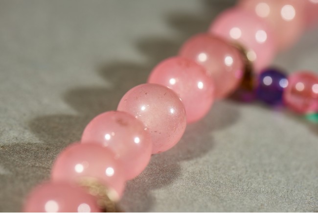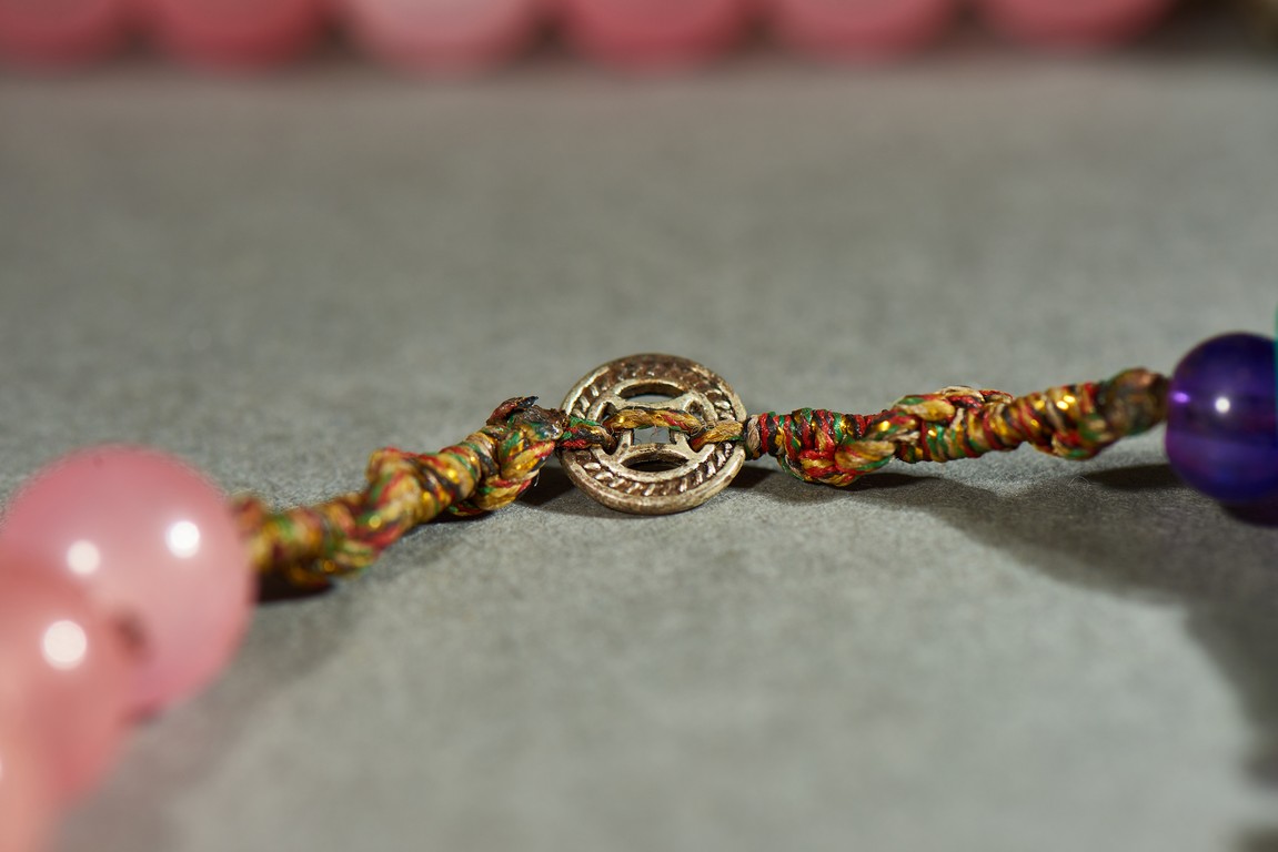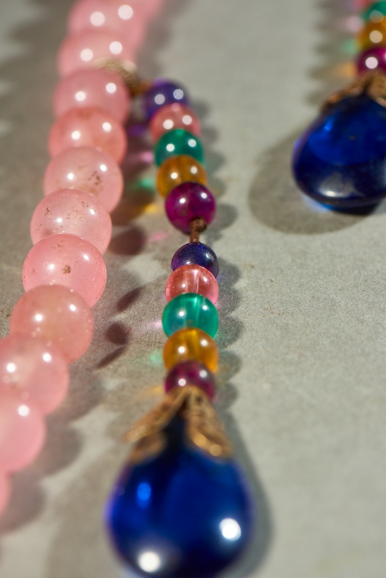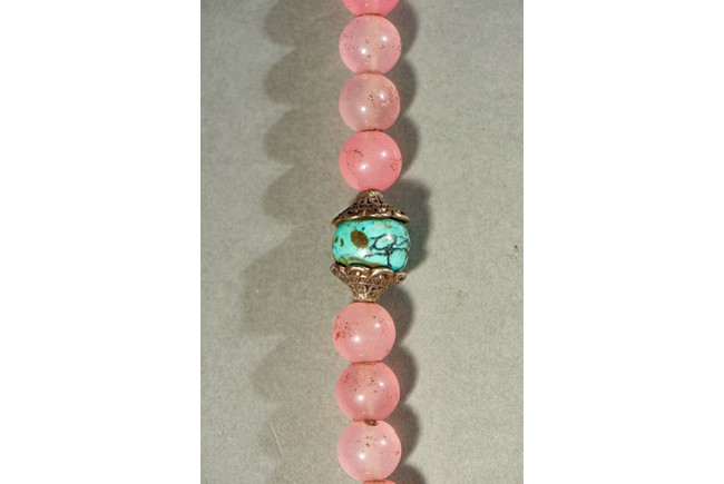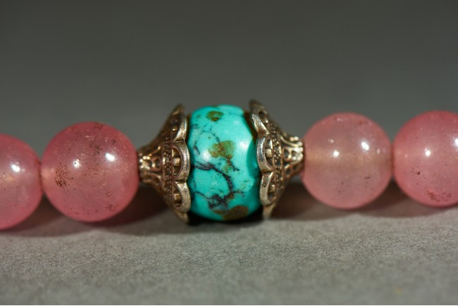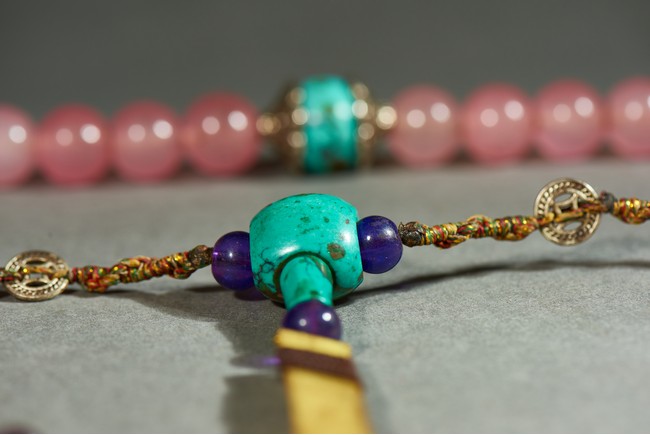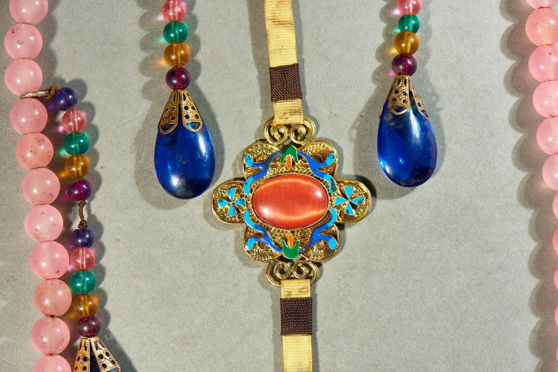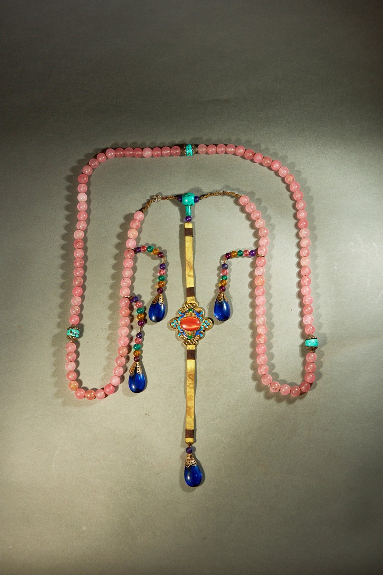 朝珠是宮廷造辦處製作的與唸經誦佛相關的用品之一。此珠由一百零八顆粉色碧璽穿成,四個綠松石結珠,記念三串,各由十顆各色碧璽珠組成,下有青金石墜角,結牌為珊瑚燒藍。