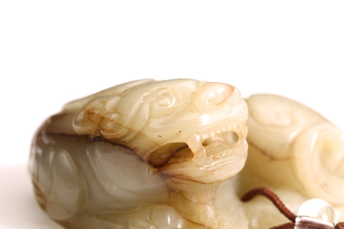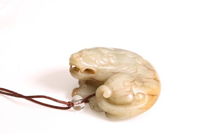 The recumbent foo dog is carved with mouth agape, bulging eyes and powerful nose, body with curled fur, the stone is of celadon white tone with russet veins. Qing Dynasty period.
