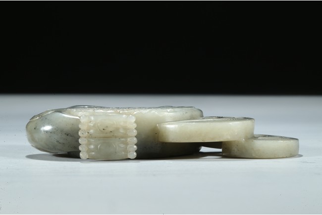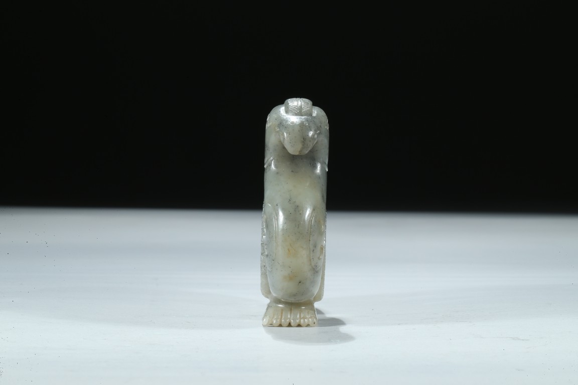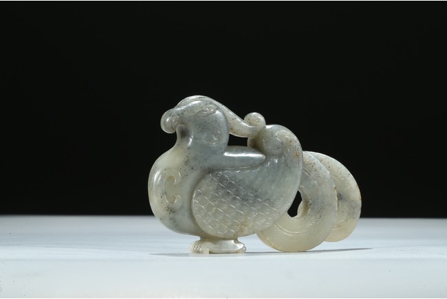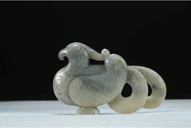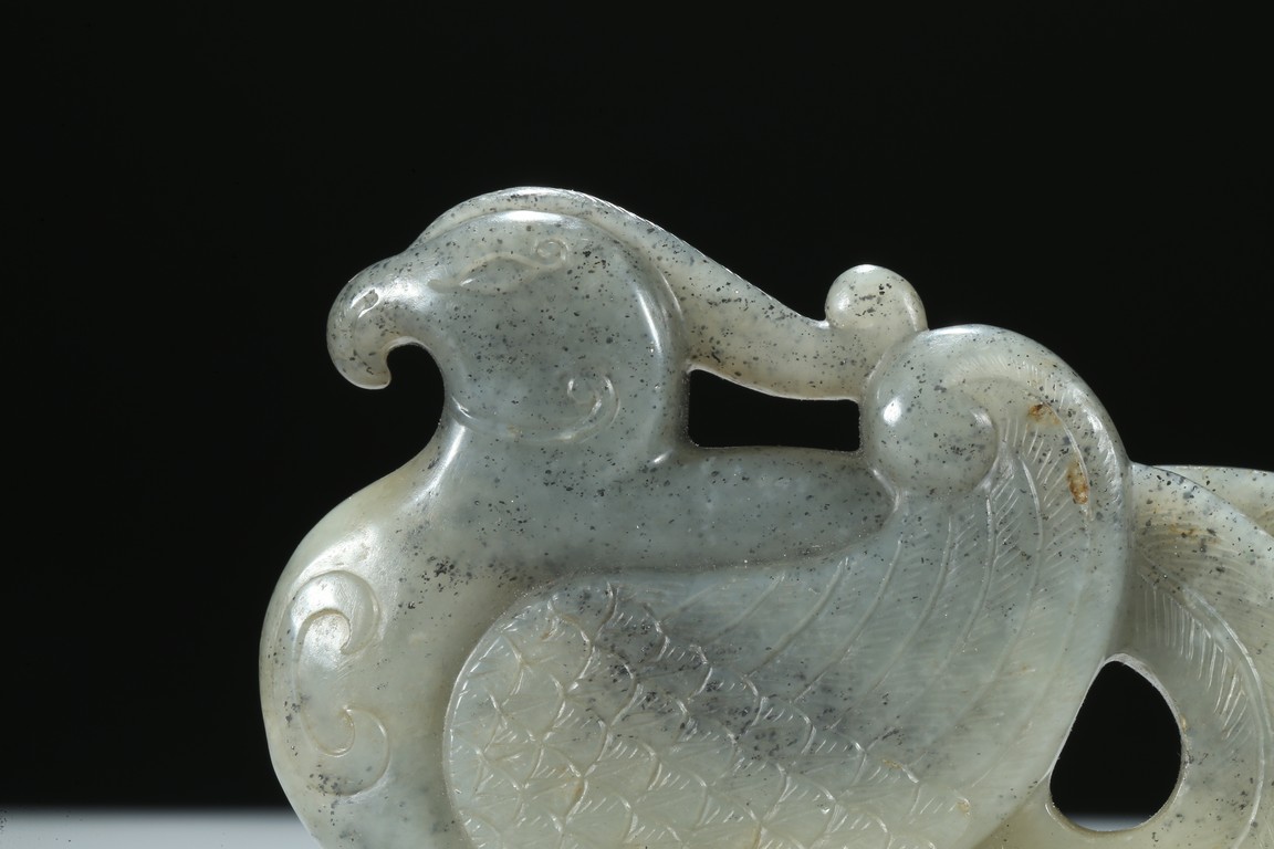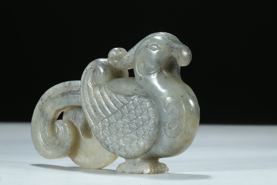 Carved with its finely detailed wings poised and folded along its long curling bifurcated tail-feathers, depicted with well-rendered plumage, the stone of a pale celadon accentuated with grey inclusions. Qing Dynasty period.