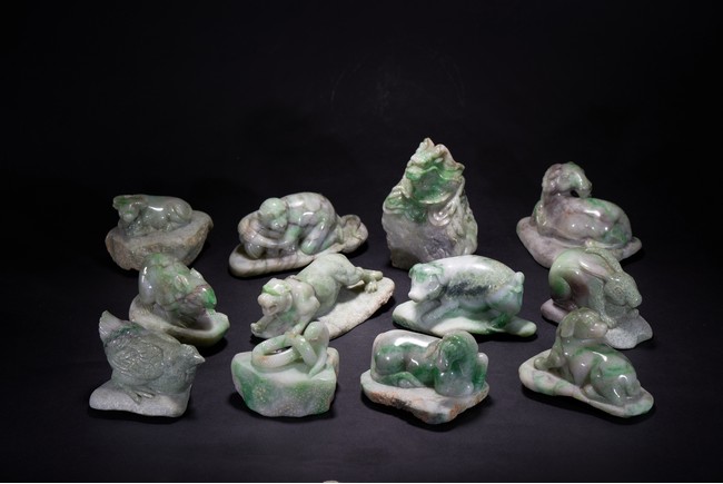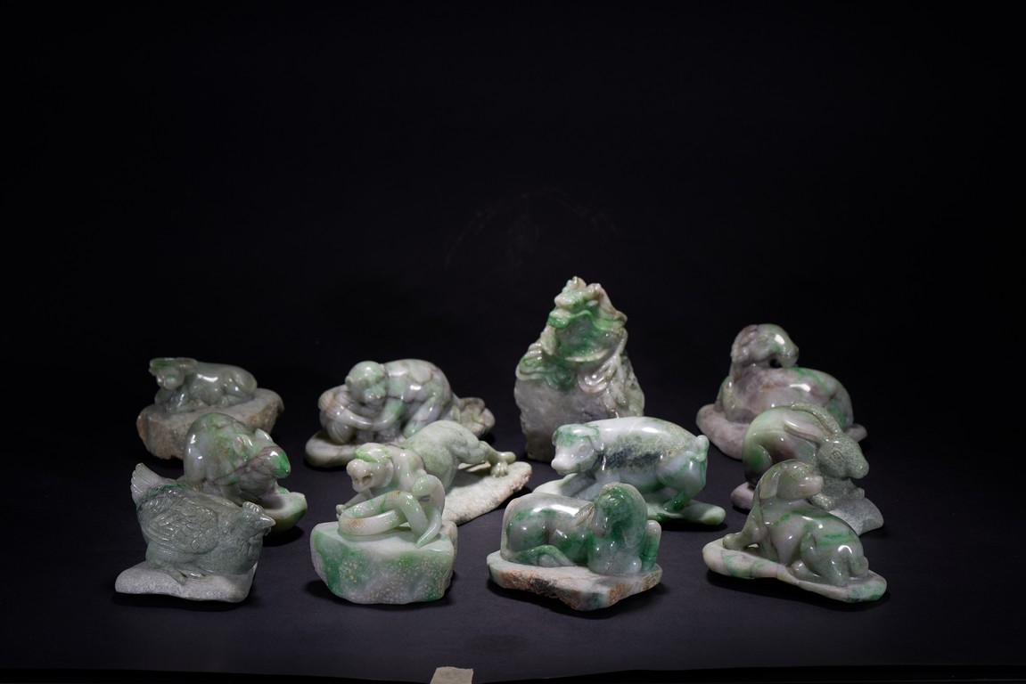 A SET OF TWELVE CHINESE JADEITE 'ZODIAC' CARVINGS 十九世紀 翠玉雕十二生肖像