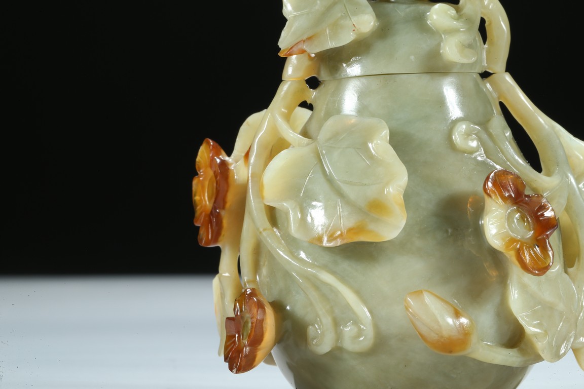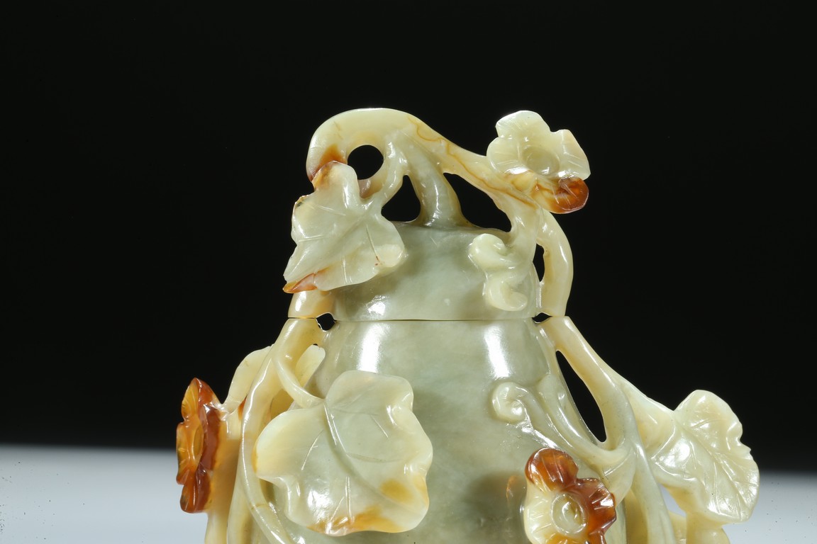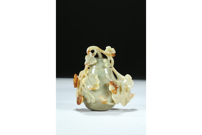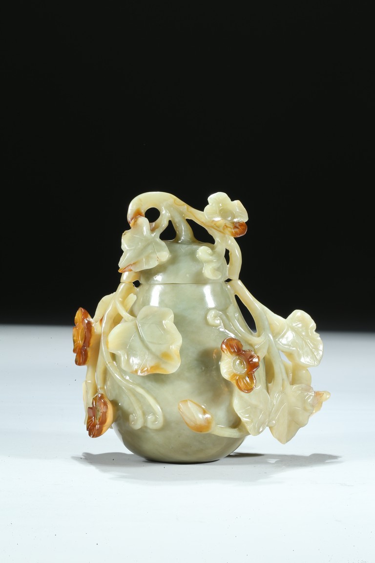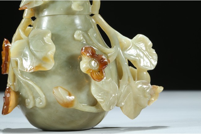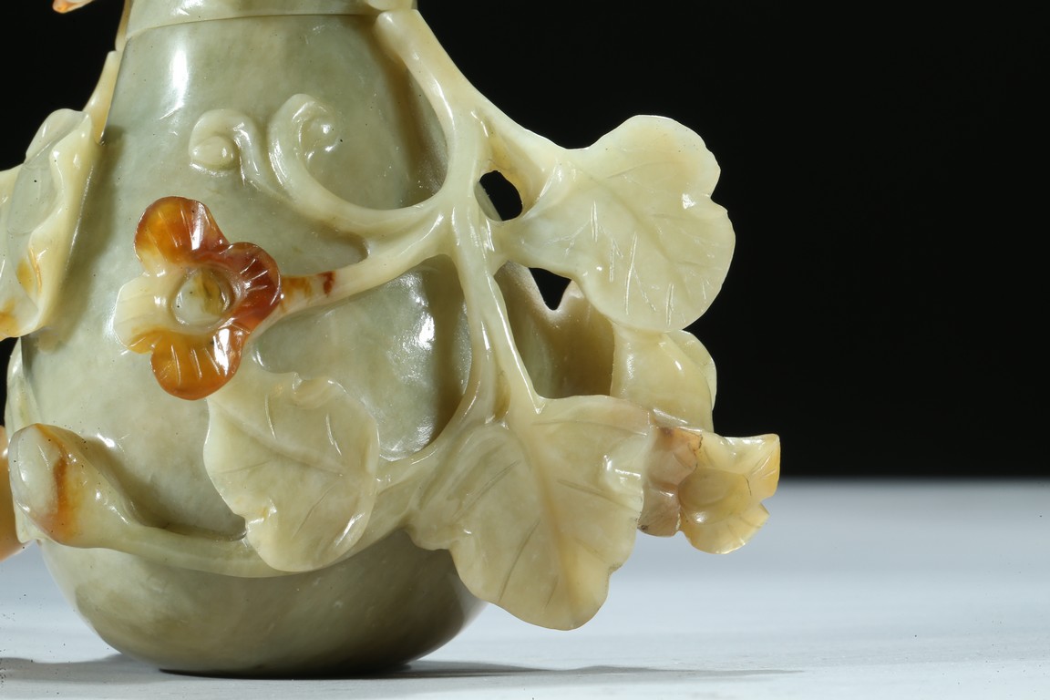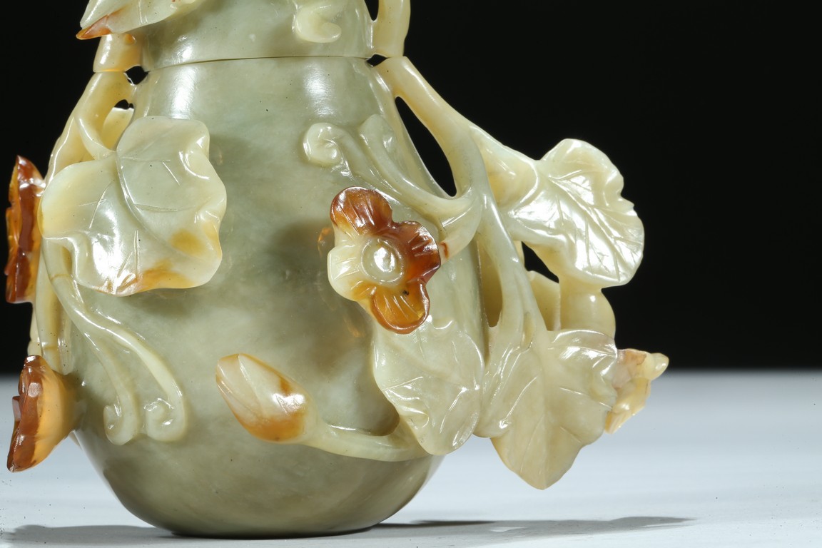 Well carved as a gourd borne on a gnarled stem bearing leafy flowers and tendrils, in which the flowers skillfully carved to utilize the russet patch of the stone. Qing Dynasty period.