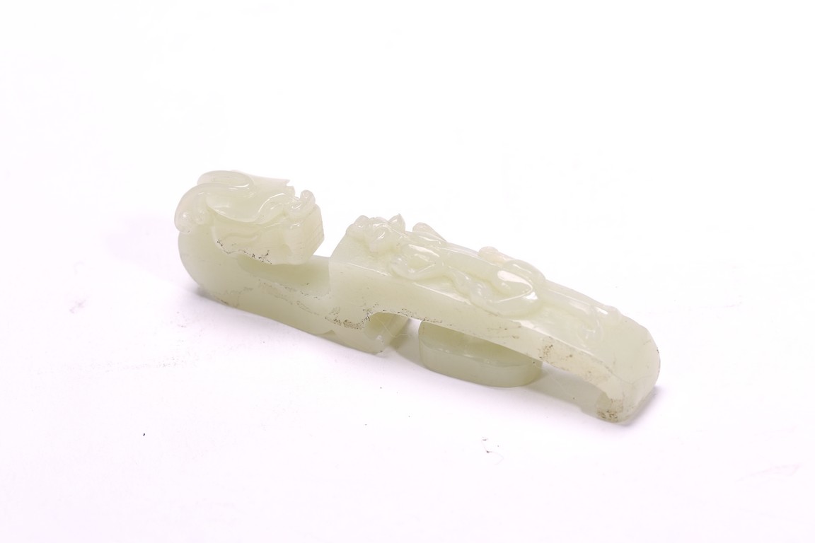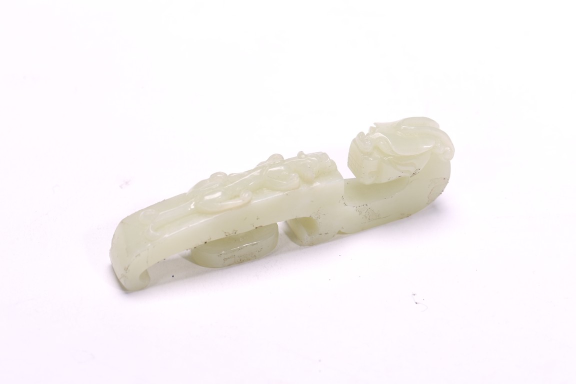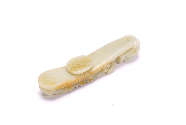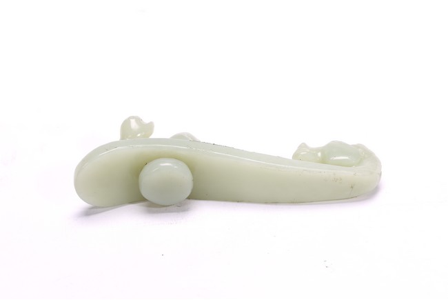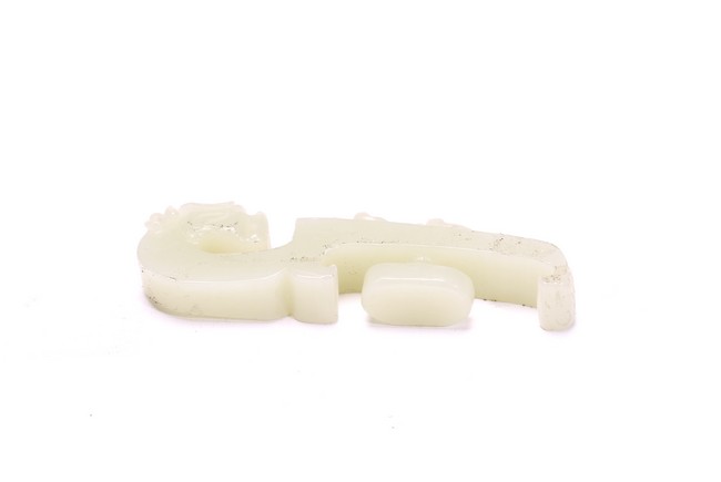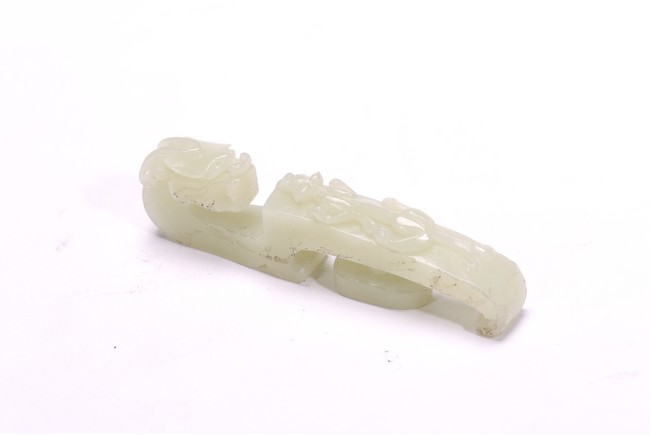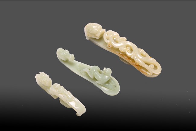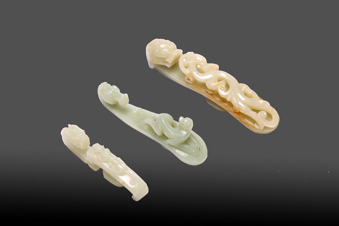 Comprising three white jade belt hook of various design, including one terminating with an upturned dragon head, shaft carved with chilong; one with upturned horse head, the shaft with a recumbent dog with head turning back; and one with upturned dragon head, the shaft with a crouching chilong carving