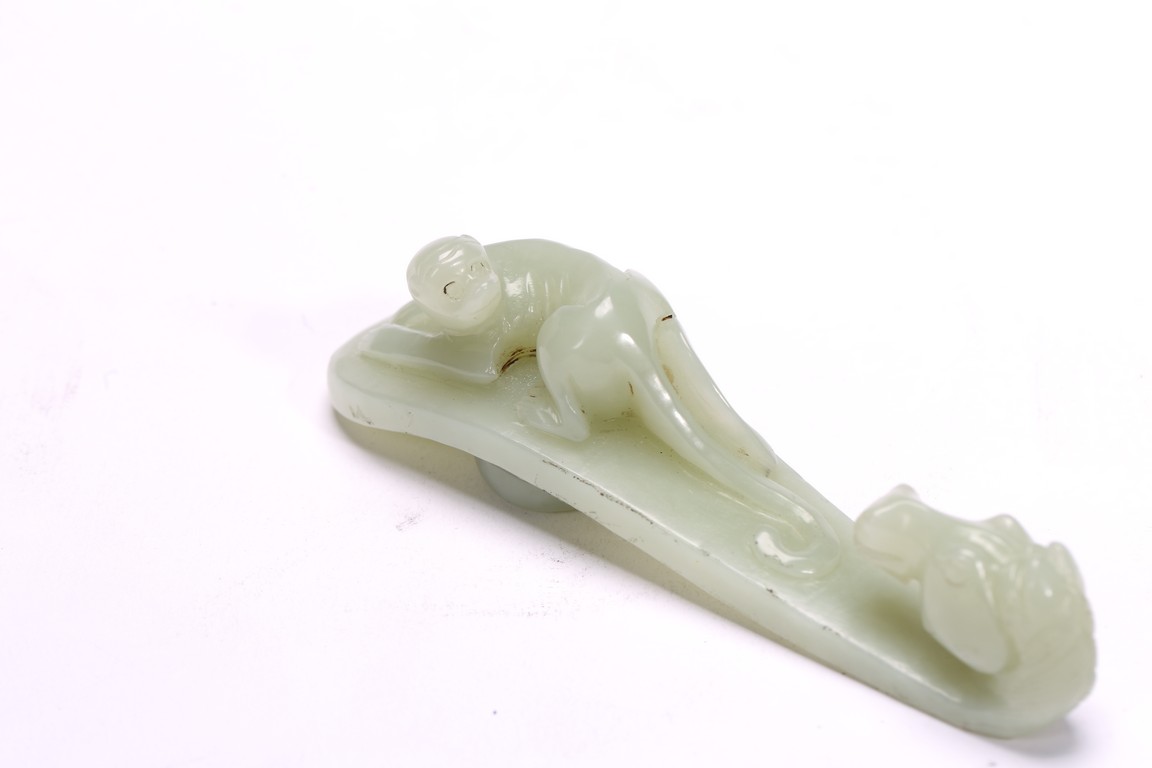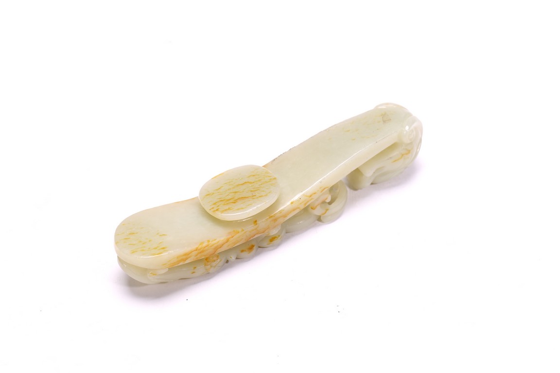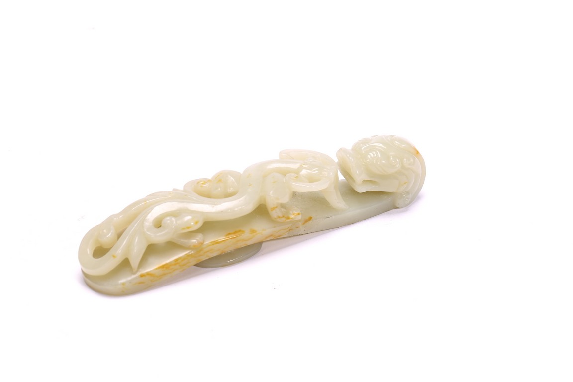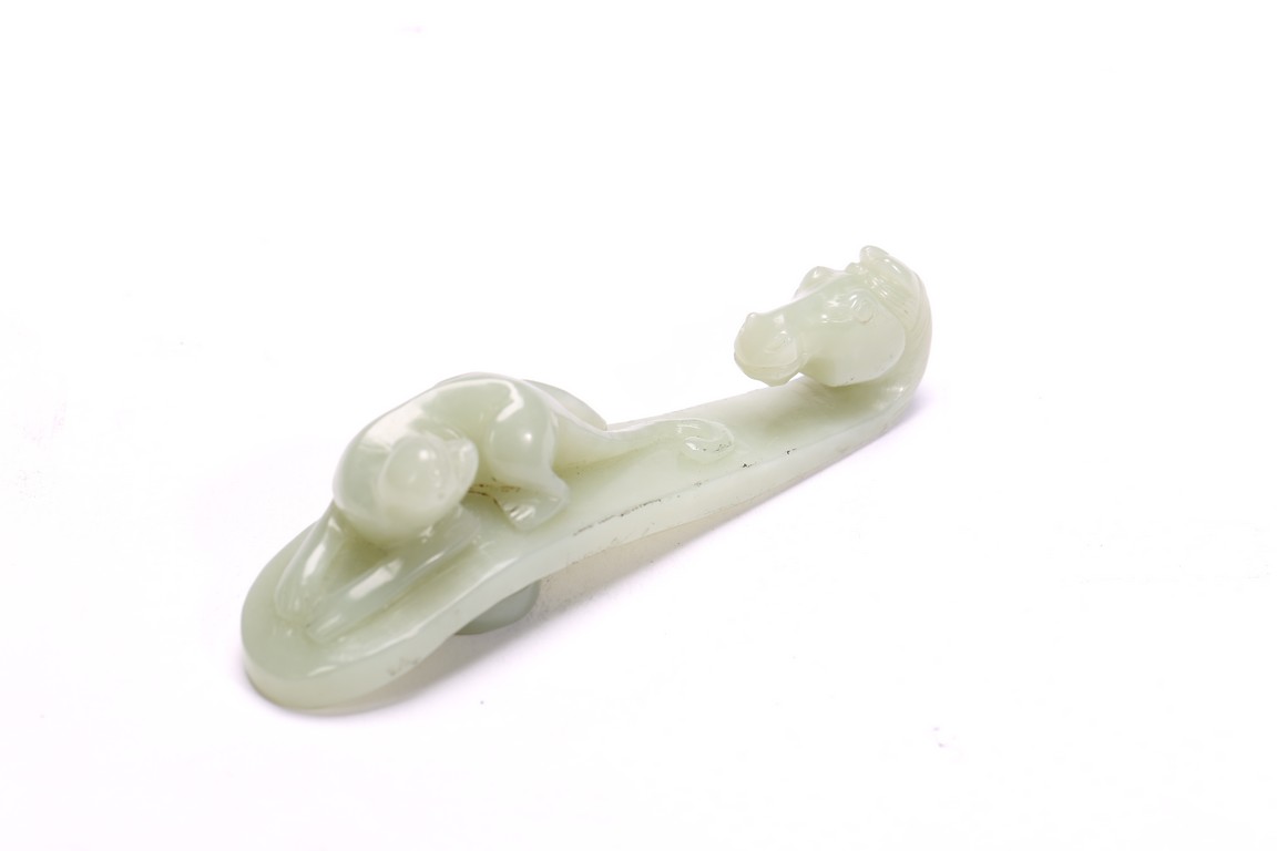 Comprising three white jade belt hook of various design, including one terminating with an upturned dragon head, shaft carved with chilong; one with upturned horse head, the shaft with a recumbent dog with head turning back; and one with upturned dragon head, the shaft with a crouching chilong carving