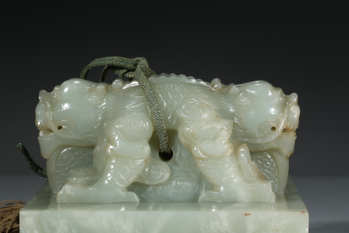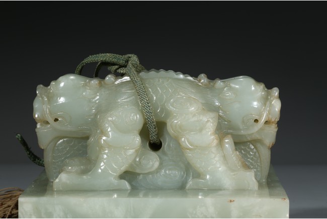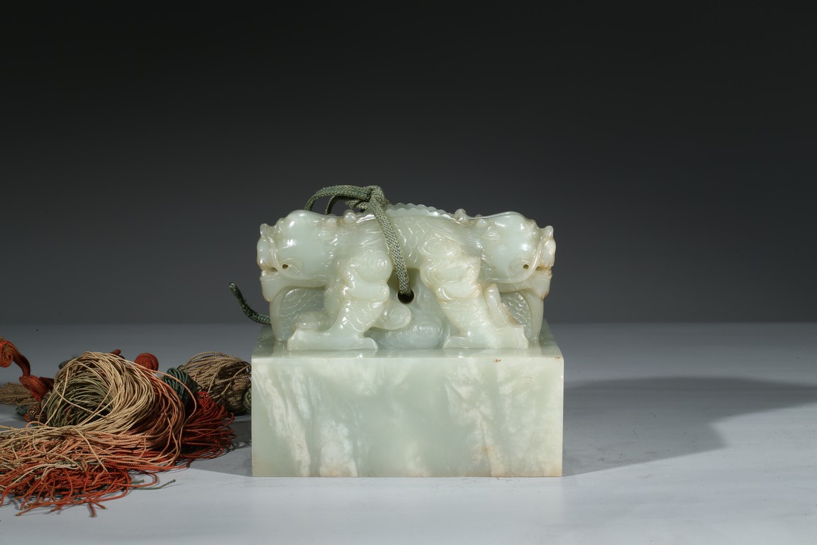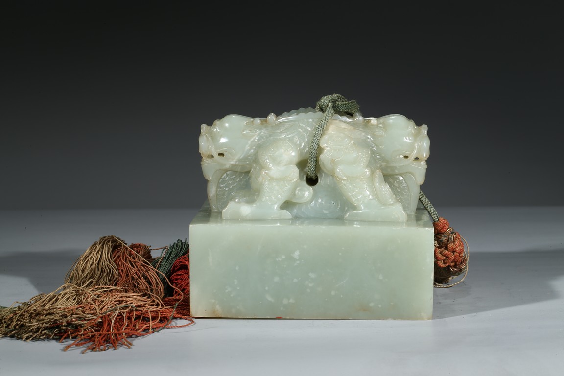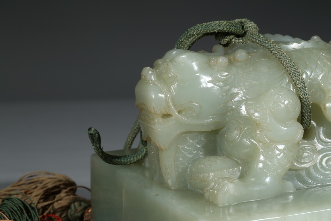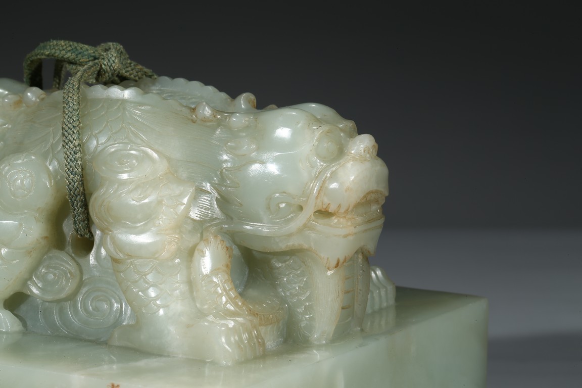 方印用新疆和闐青白玉琢制,其玉質色純美,體積碩大,為難得一見的良玉美材。印文別緻,俊美飄逸,增減之筆恰到好處,雖然玉質堅硬,但印文琢制工雅,筆劃均一,章法整齊,顯示出刻字匠人高超的技藝。此印鈕雕工精美,雙龍背向蹲踞,氣勢雄偉有神,鱗角發須,精緻細密清晰,立體感極強,融合圓雕、淺浮雕、高浮雕、透雕等諸多琢玉技法於一身,實屬難得。