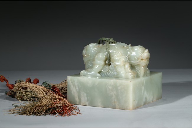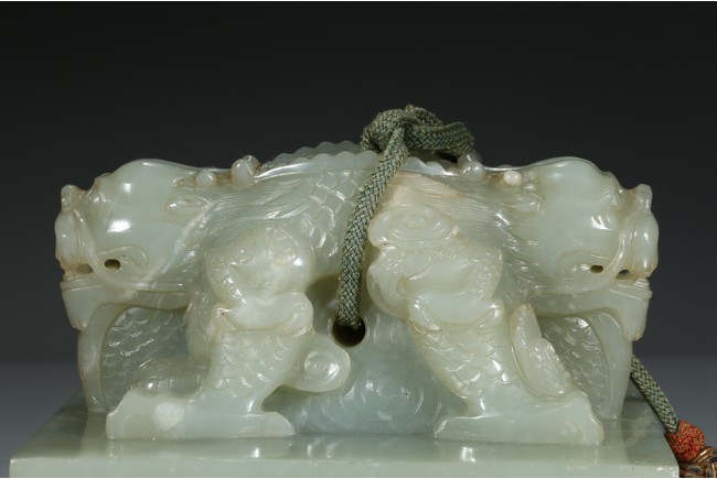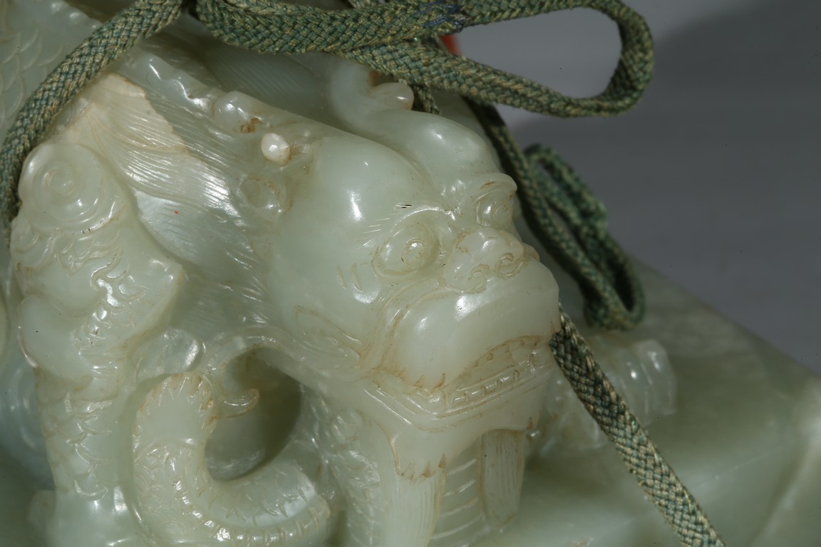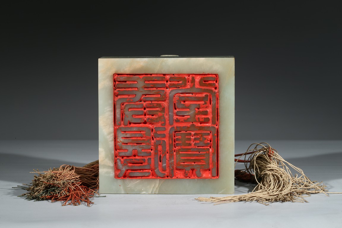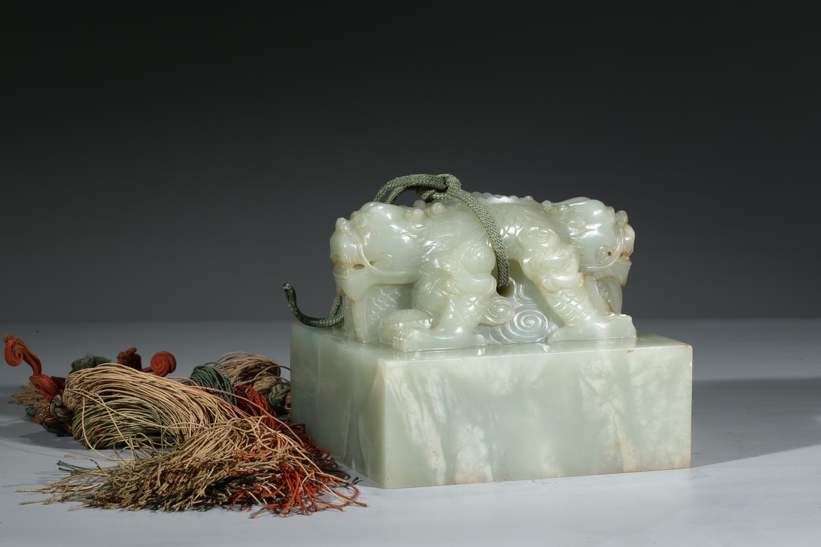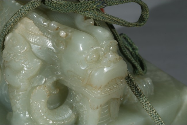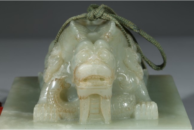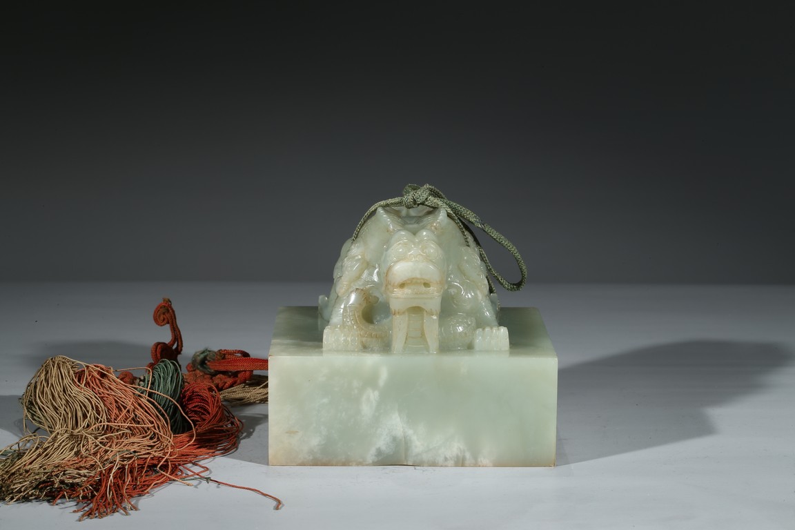 方印用新疆和闐青白玉琢制,其玉質色純美,體積碩大,為難得一見的良玉美材。印文別緻,俊美飄逸,增減之筆恰到好處,雖然玉質堅硬,但印文琢制工雅,筆劃均一,章法整齊,顯示出刻字匠人高超的技藝。此印鈕雕工精美,雙龍背向蹲踞,氣勢雄偉有神,鱗角發須,精緻細密清晰,立體感極強,融合圓雕、淺浮雕、高浮雕、透雕等諸多琢玉技法於一身,實屬難得。