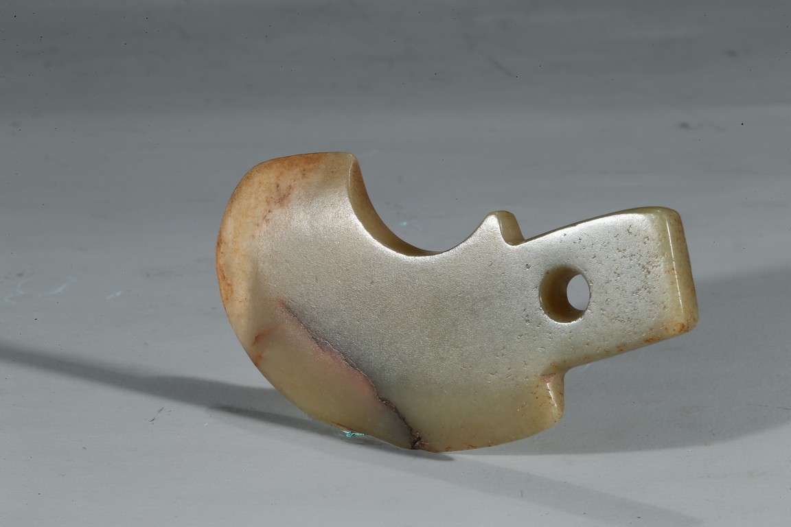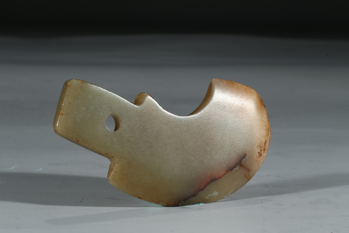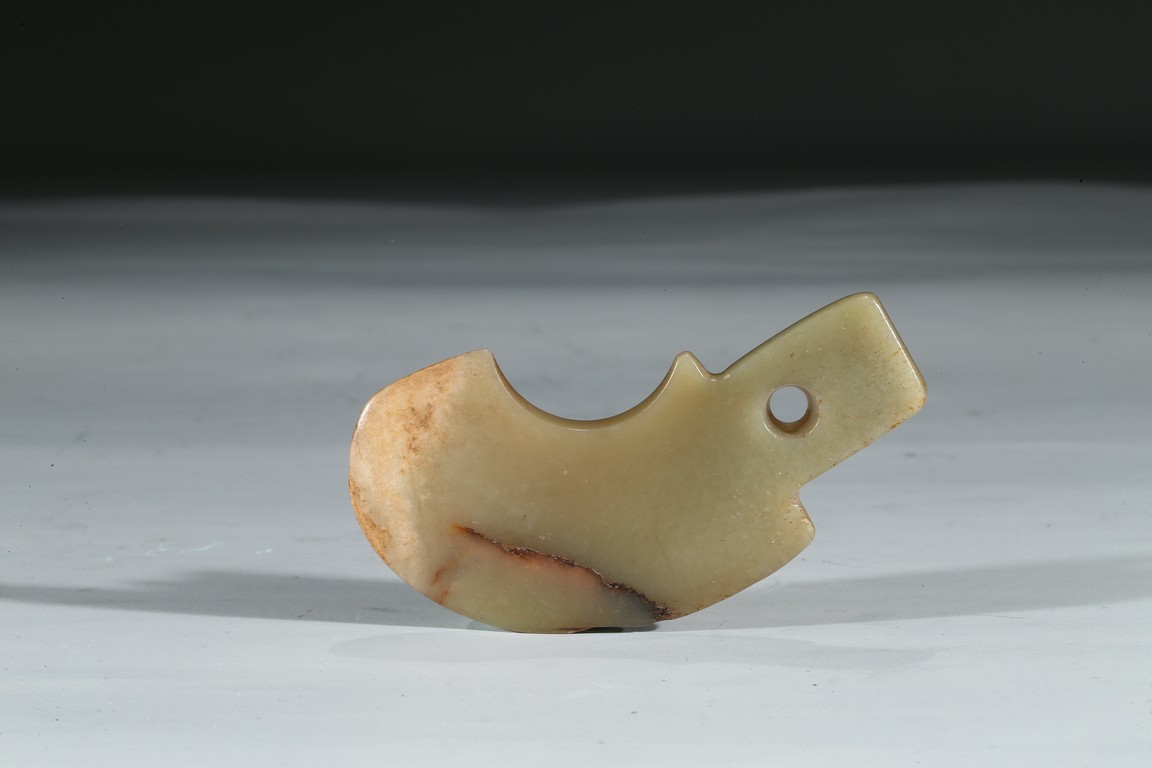 A CELADON 'AXE' FORM PENDANT 明 青玉斧型佩