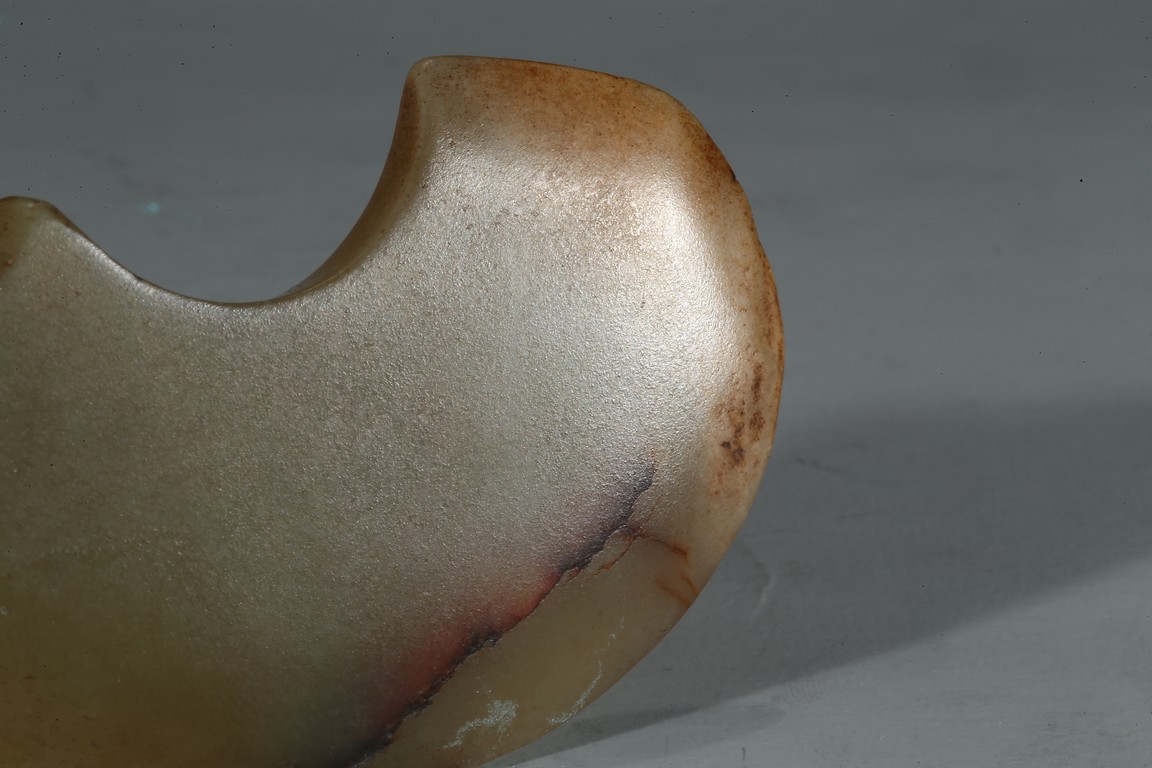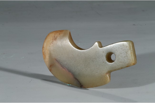 Carved in the form of an axe and drilled with a circular aperture.