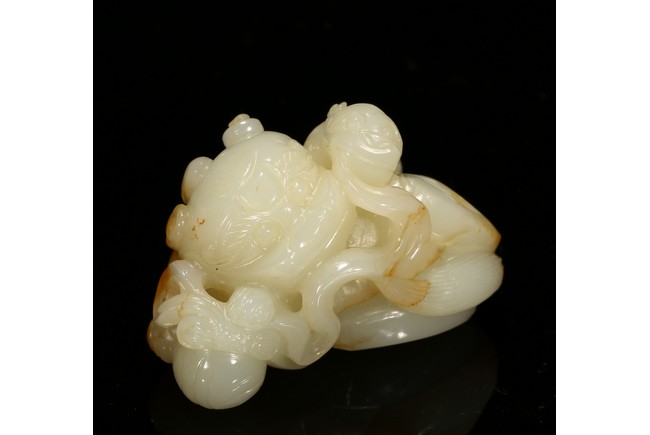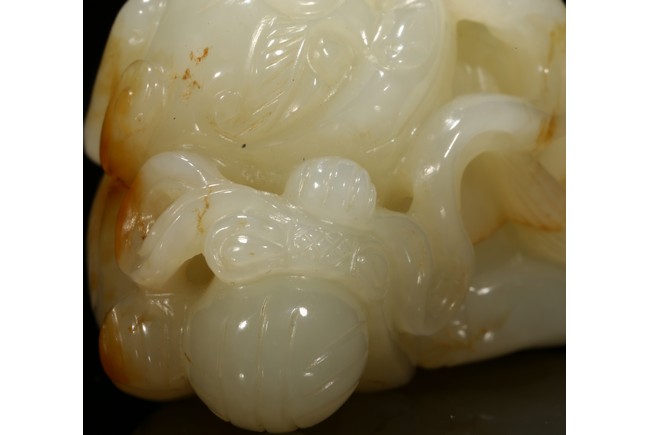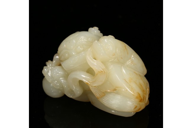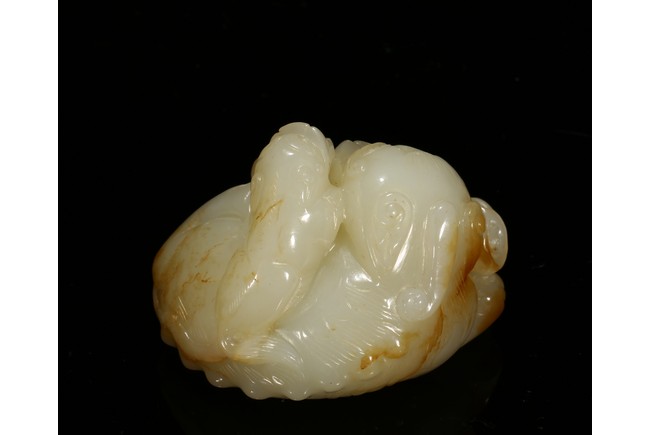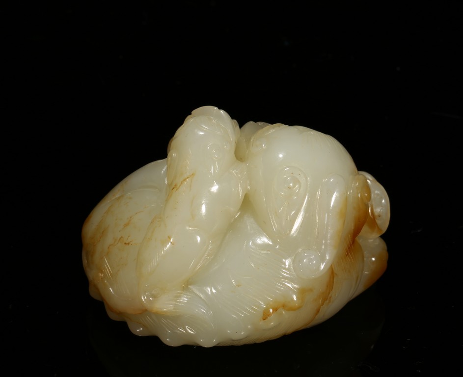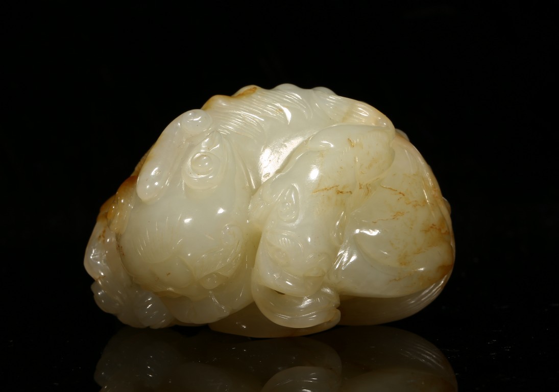 The buddhist lion finely carved lying with its front paw resting on a brocade ball and its cub on its back, the stone of a well polished white tone suffused with slight russet inclusions. Qing Dynasty period.