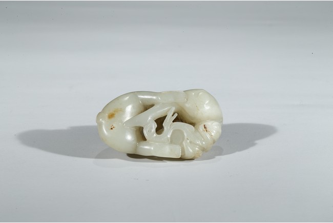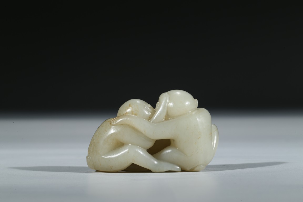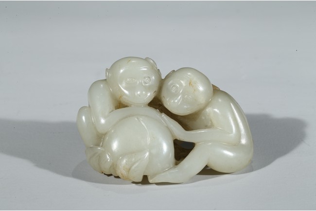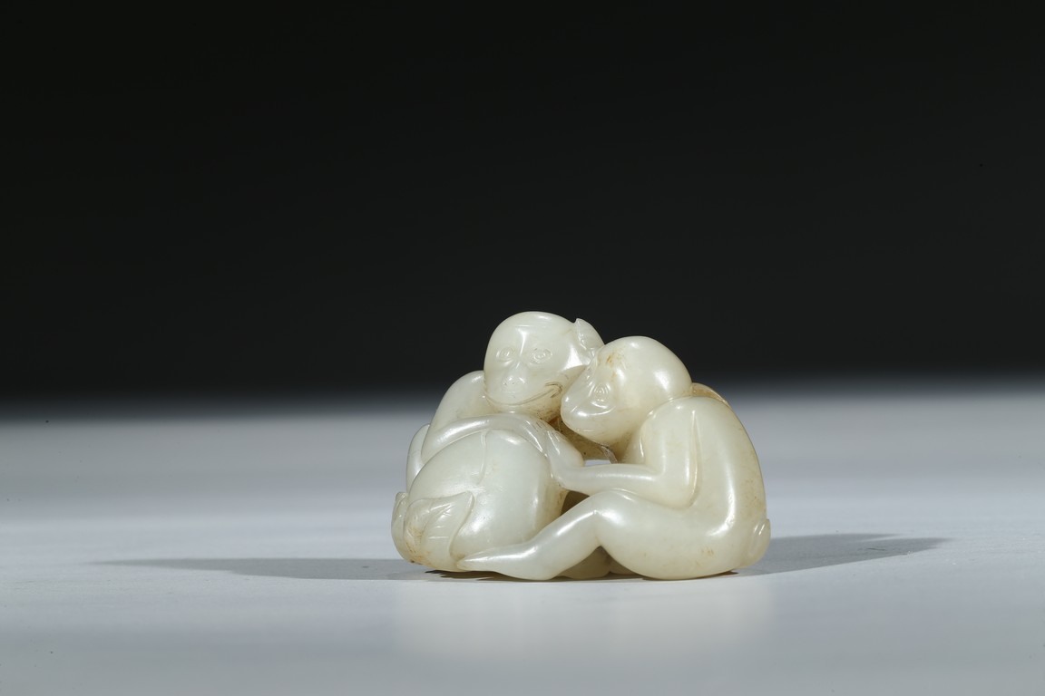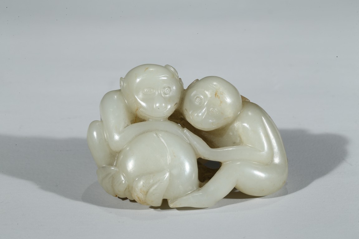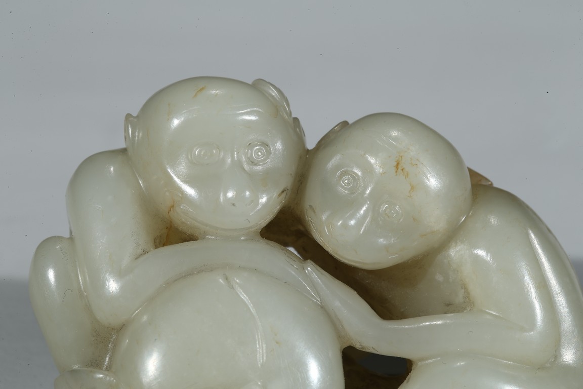 Qing Dynasty period. Carved as two sitting monkeys holding a large peach in the middle, the stone is of even polished white tone.