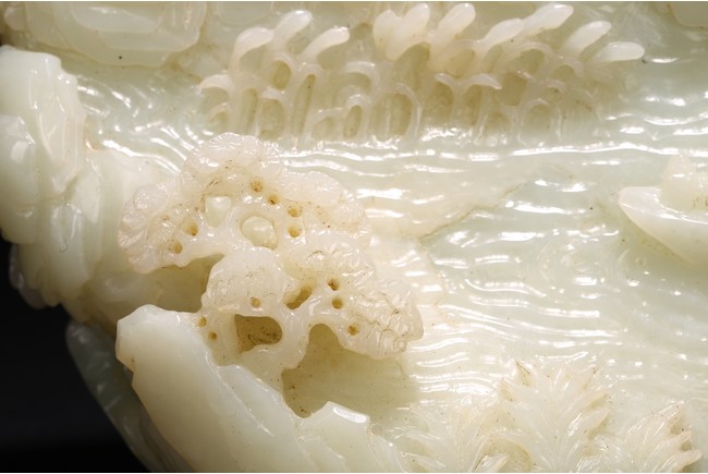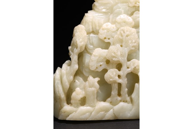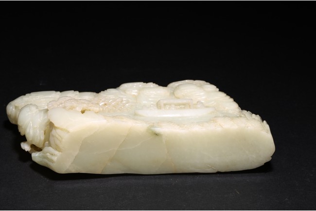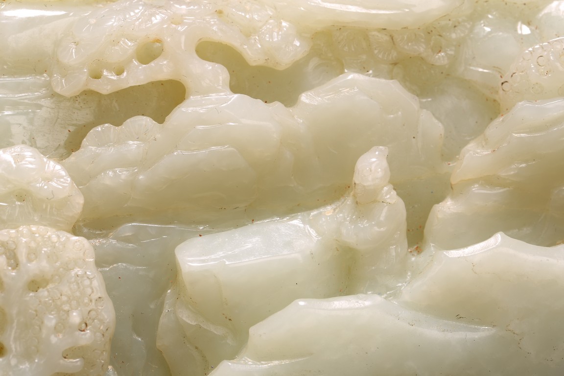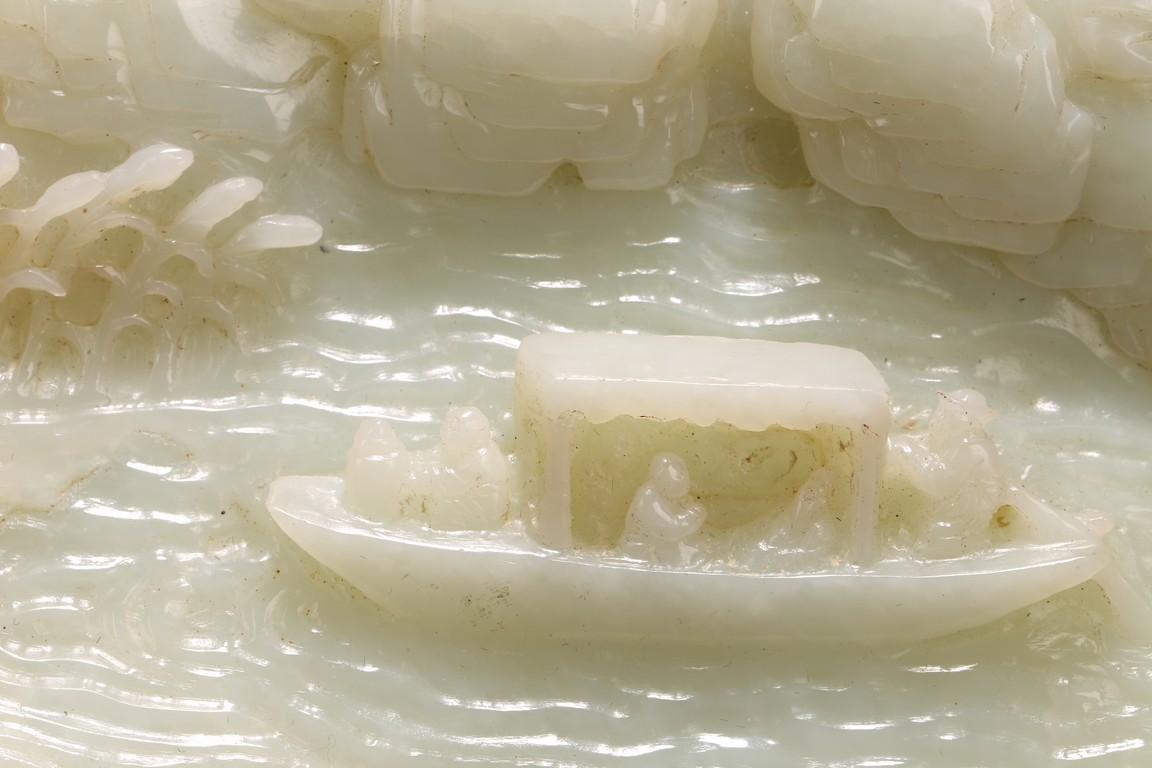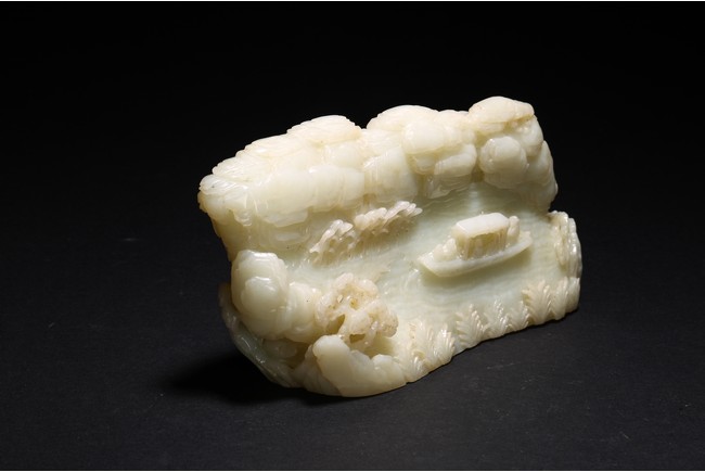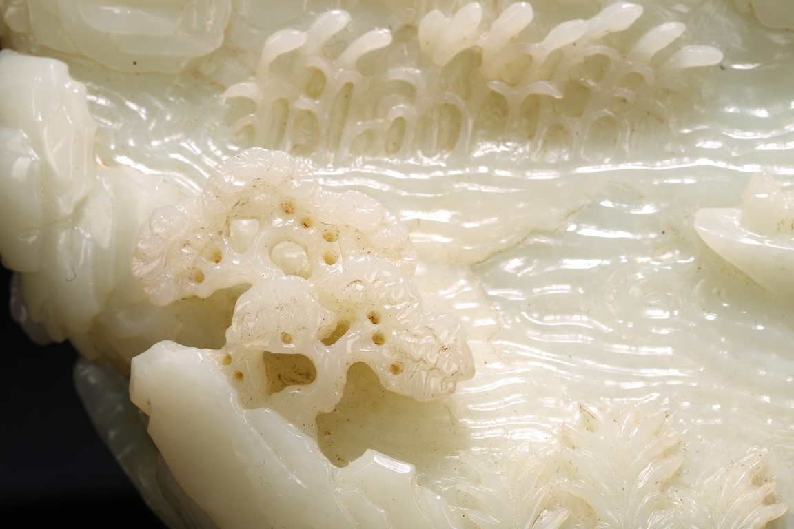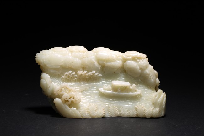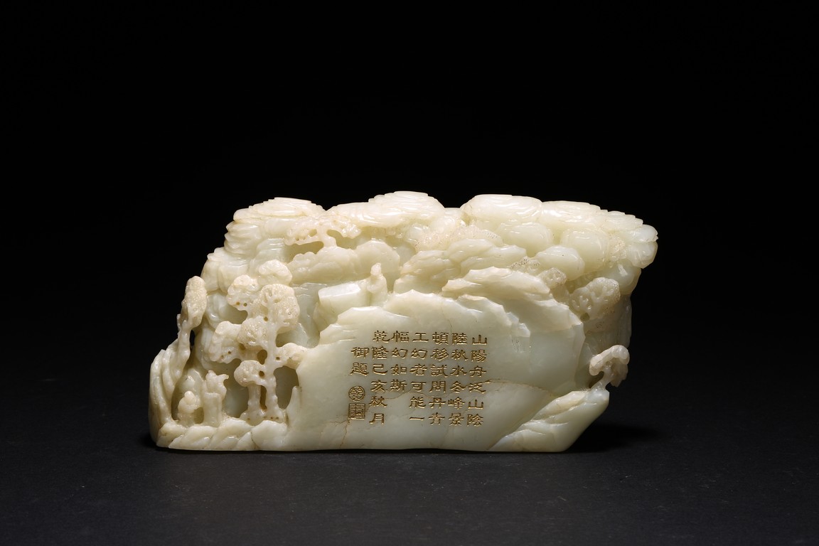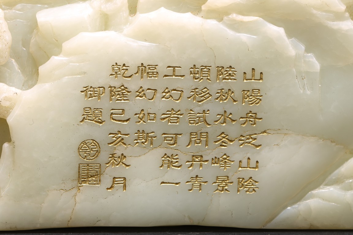 山子,古人謂之假山,是文人書房中常見之雅設,多以山水畫為據,使突兀嶙峋之畫面躍然成體,秀麗於書案之前,使人觀之如山,有如神遊妙境。本器玉質潔白,通體純淨、打磨光亮細膩、雕刻嫻熟、佈局清新脫俗,山子依玉材形狀琢雕成聳立山峰狀,山石陡峭,凹凸有致。整個畫面以文人水墨畫的方式展開細節,用小舟欲行作為情節鋪墊,又間以山崖峭壁、青草叢生,潺潺碧流。整器佈局平穩合理,情節疏密有致,既有效的張揚了故事情節,又巧妙的表現了玉雕藝術作品所特有富貴豪奢的視覺活力。添金刻乾隆御題詩句,“山陽舟泛山陰陸,秋水冬峰景頓移。試問丹青工幻者,可能一幅幻如斯。“乾隆御題”。來源: 紐約重要藏家收藏