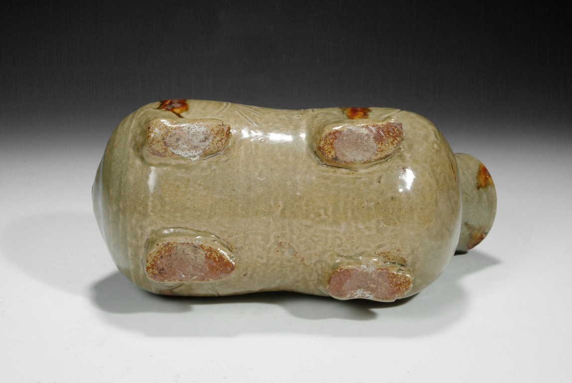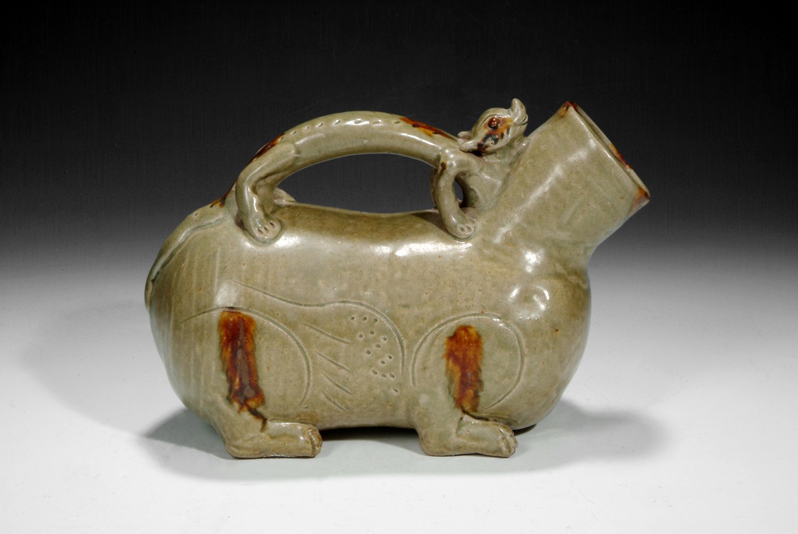 The tapered cylindrical body supported on four small feet,the handle formed by a slender chilong crouching behind the vessel's wide gaping mouth,all under a thin olive-green glaze. Western Jin Dynasty period.
