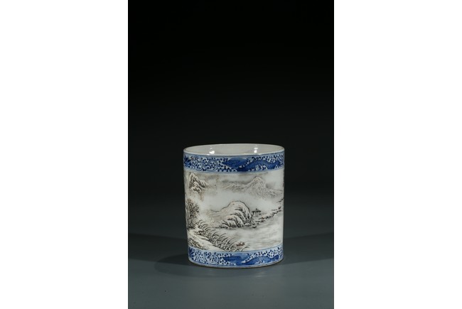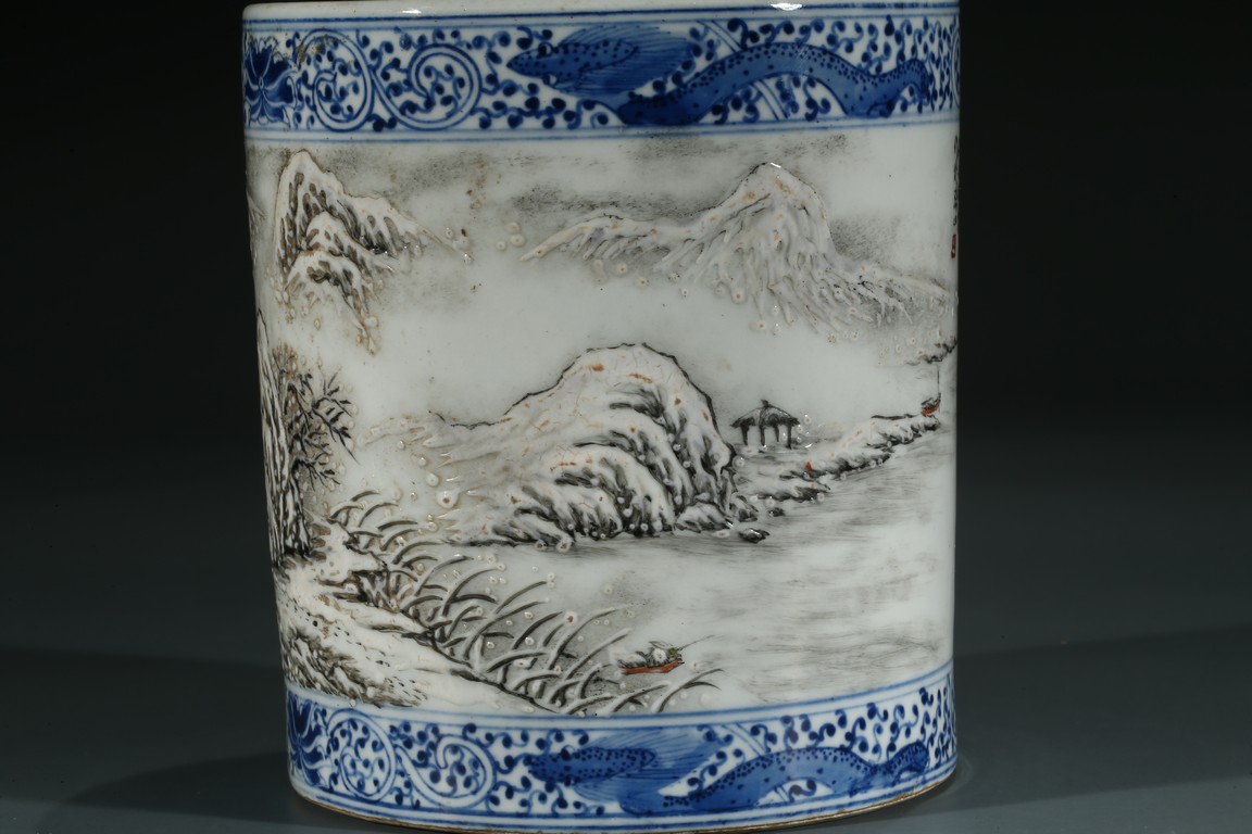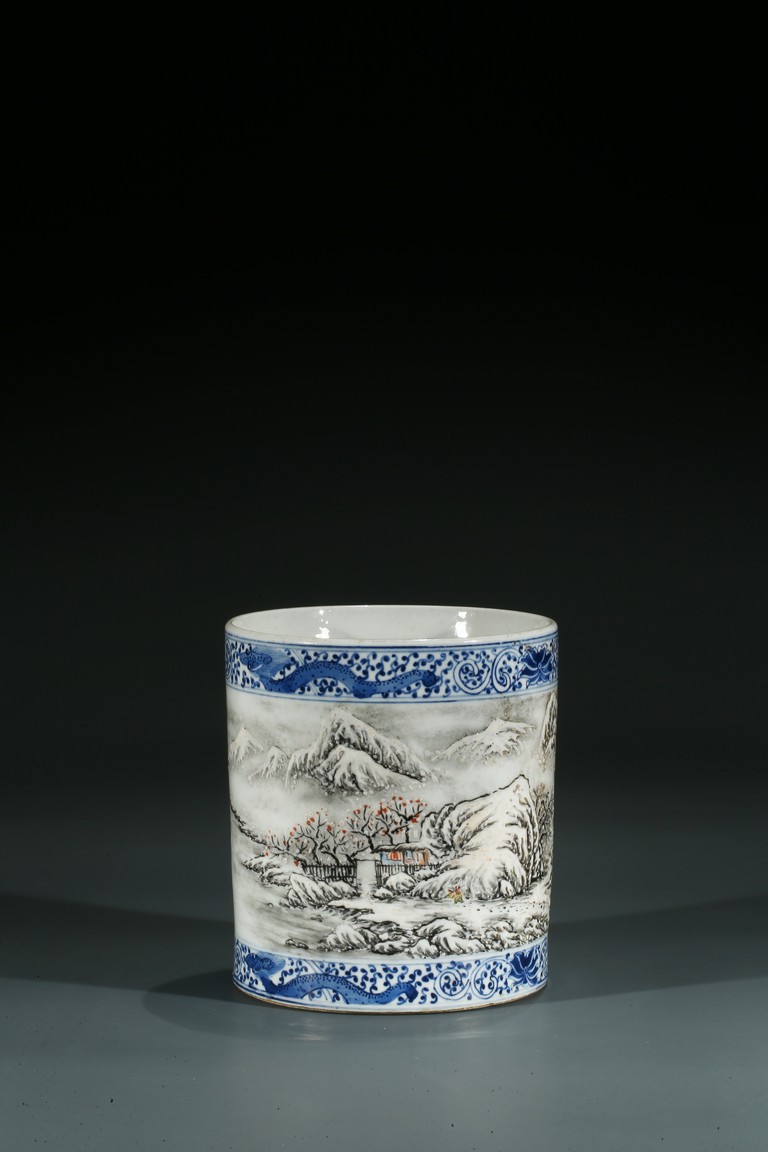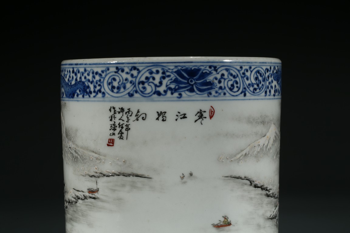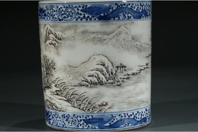 Finely painted around the cylindrical body to depict a continuous lakeside landscape scene and inscribed with inscriptions all between blue and white 'dragon' bands at the rim and base, the base with four character mark.