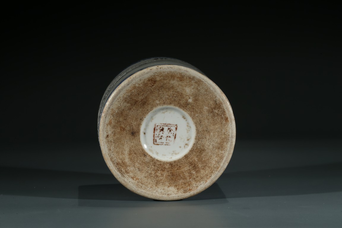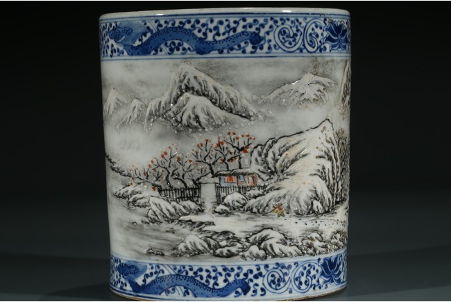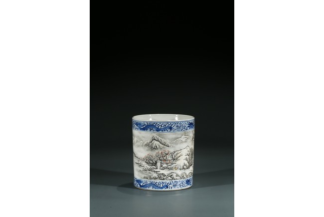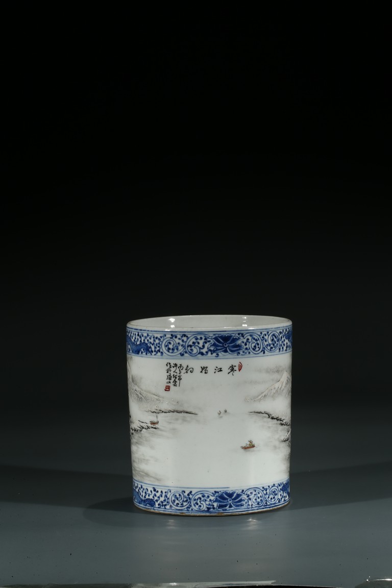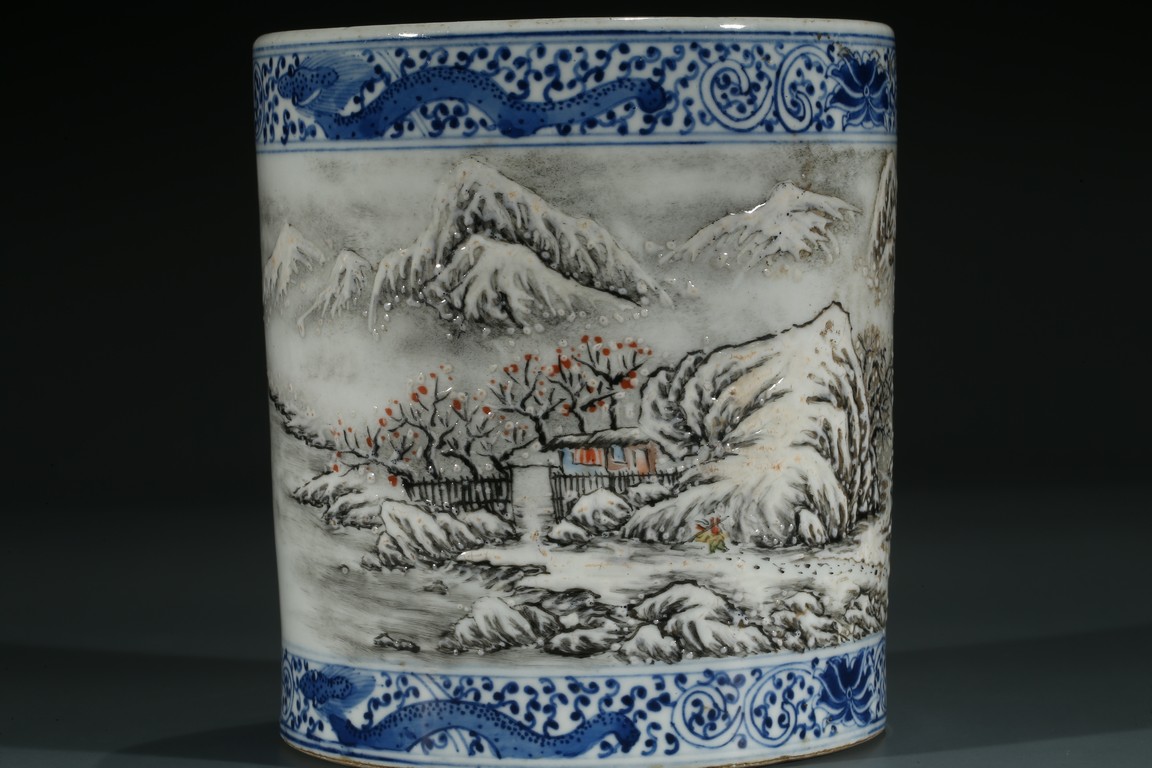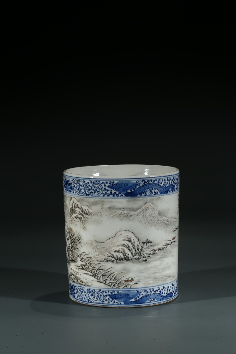 Finely painted around the cylindrical body to depict a continuous lakeside landscape scene and inscribed with inscriptions all between blue and white 'dragon' bands at the rim and base, the base with four character mark.