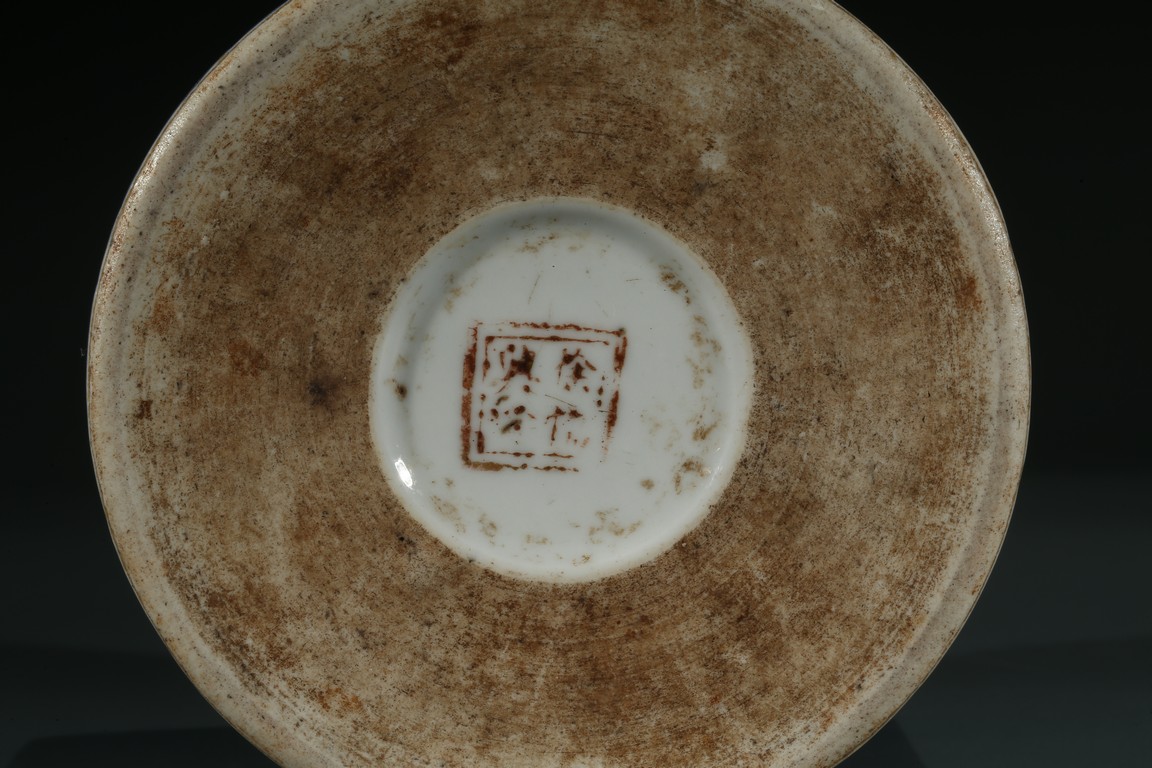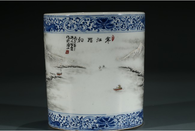 整幅畫面佈局自然,主次分明,意境深遠,筆觸凝練,富有詩意,畫面古木遒勁詩味濃郁又意境深邃的繪畫風格,書墨彩“寒江獨釣,丙子年許人何作於珠山 ”。書法佈局嚴謹,雪景彩繪尤為精彩。只見銀裝皚皚,水天一色,坡岸交錯,遠近各景,層次有序,洵出自大家之手筆。其始以玻璃白敷染雪色,令畫面蒼潔純澈、晶瑩剔透。描繪雖是冰天雪地卻也悠閒灑脫獨釣的世外桃源。