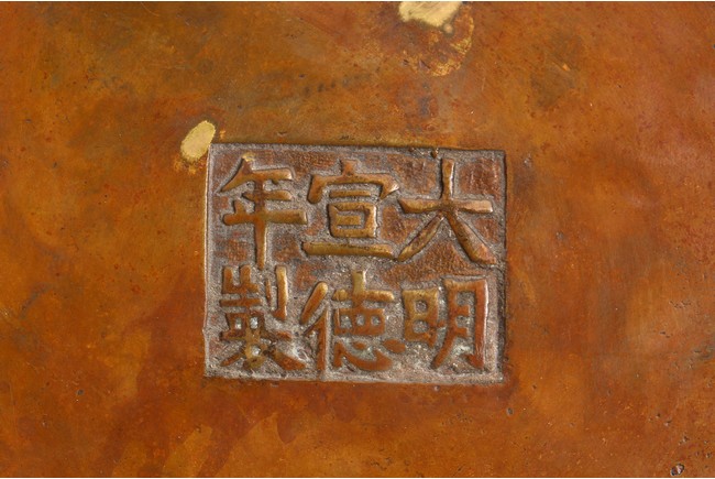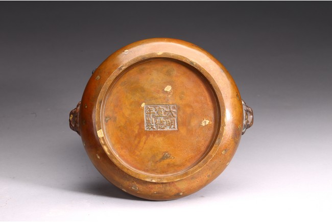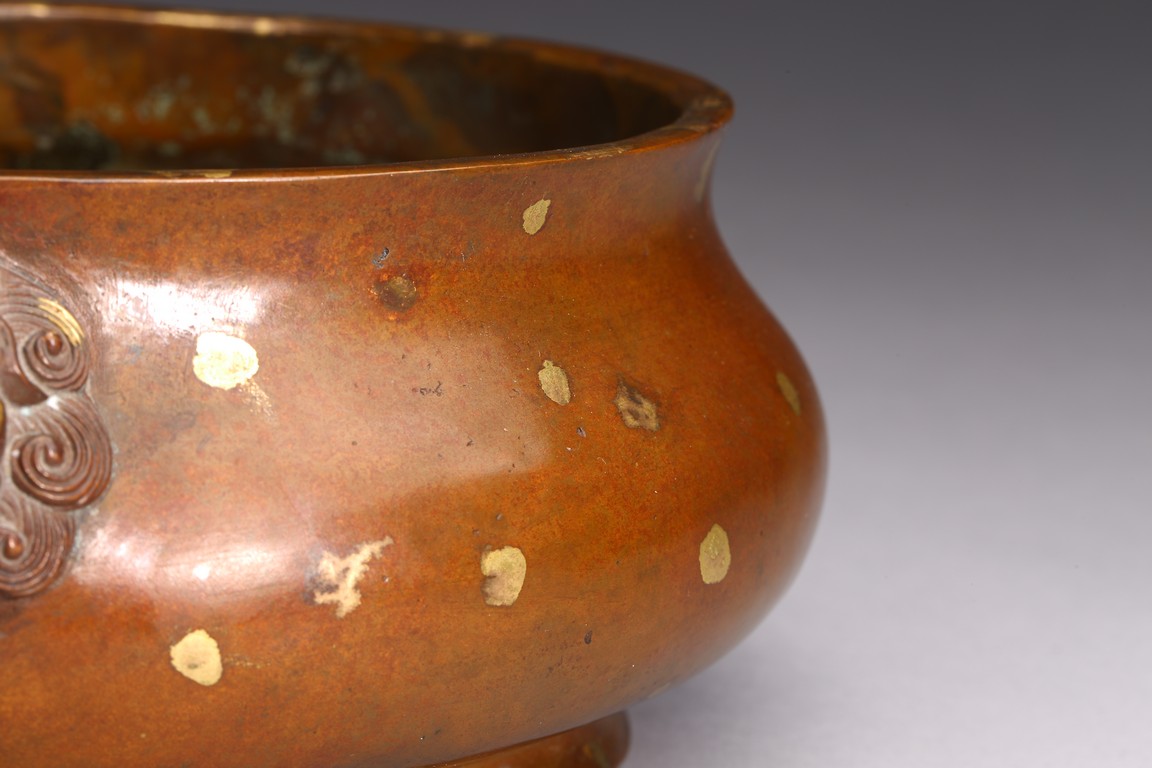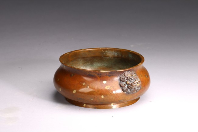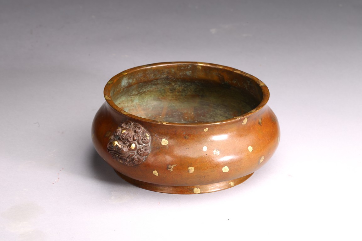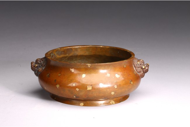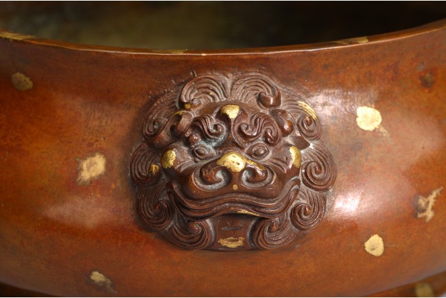 Finely cast with a compressed globular body rising to a flared rim from a short foot, flanked by two lion-head handles, the base with an apocryphal Xuande inscription, the patina of a caramel-brown color with scattered gold splashed spots. Qing Dynasty
