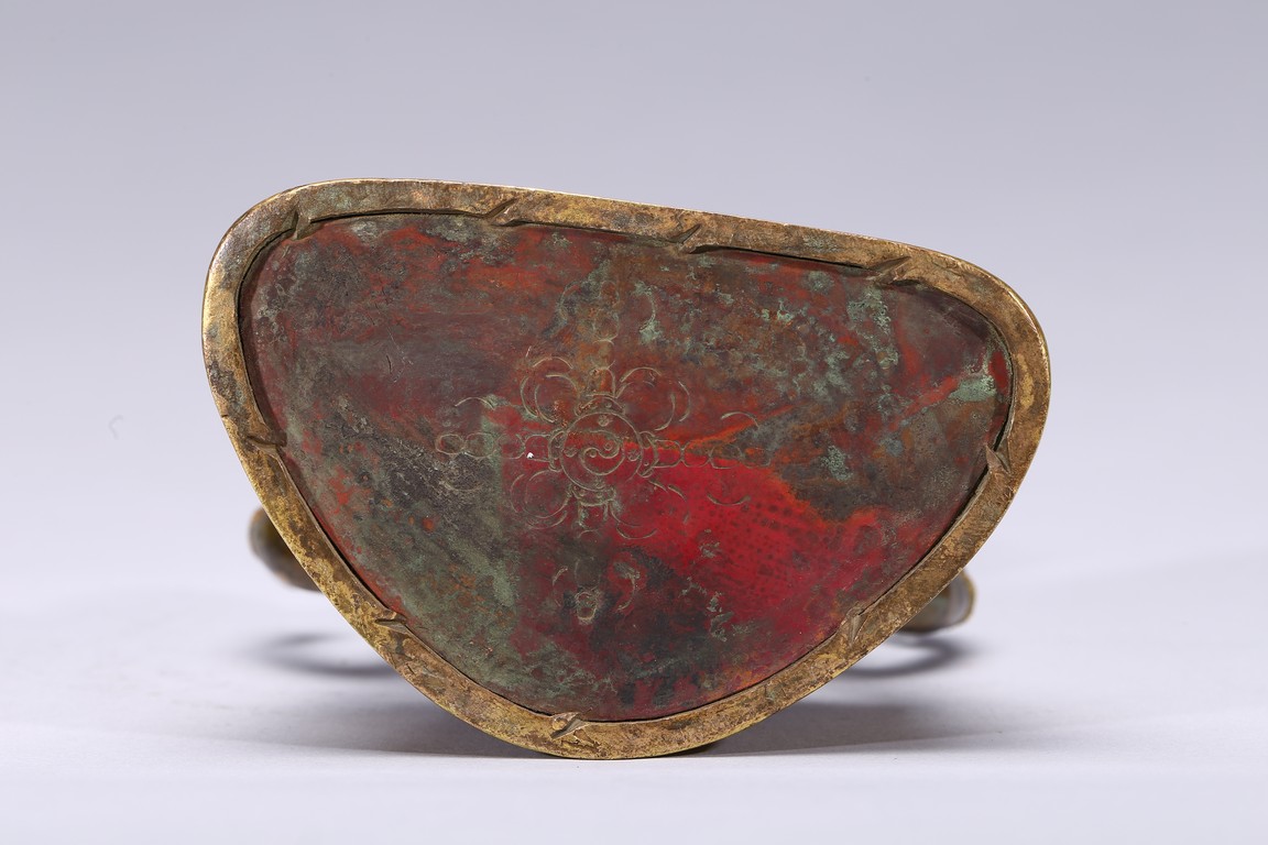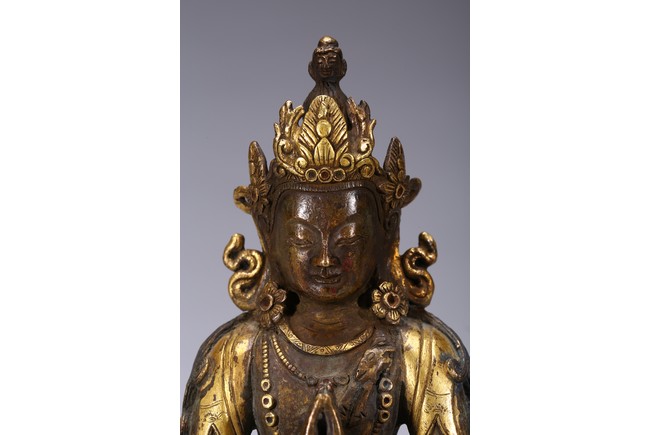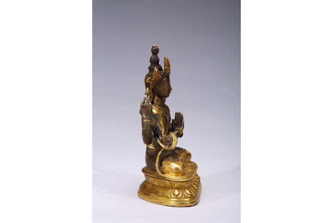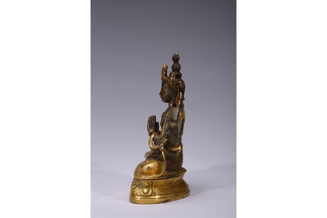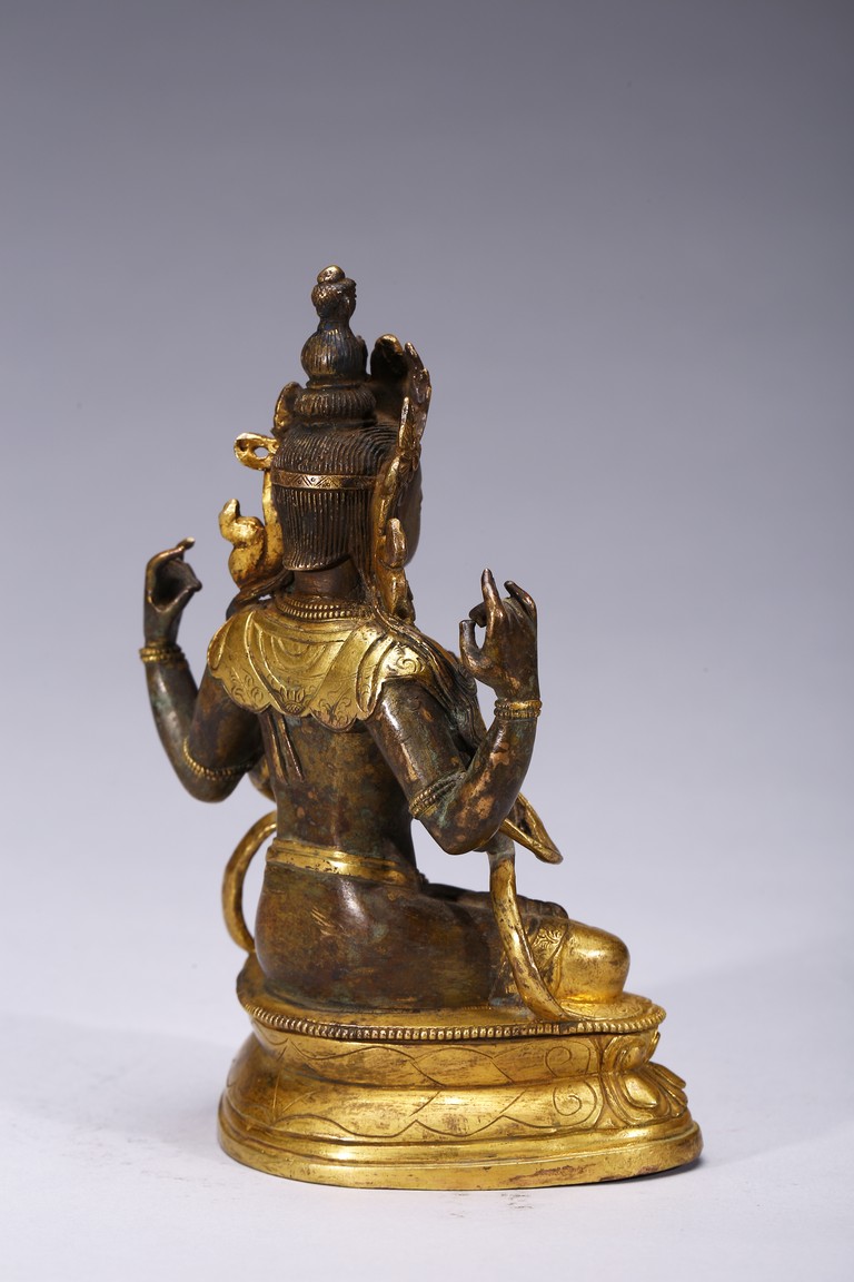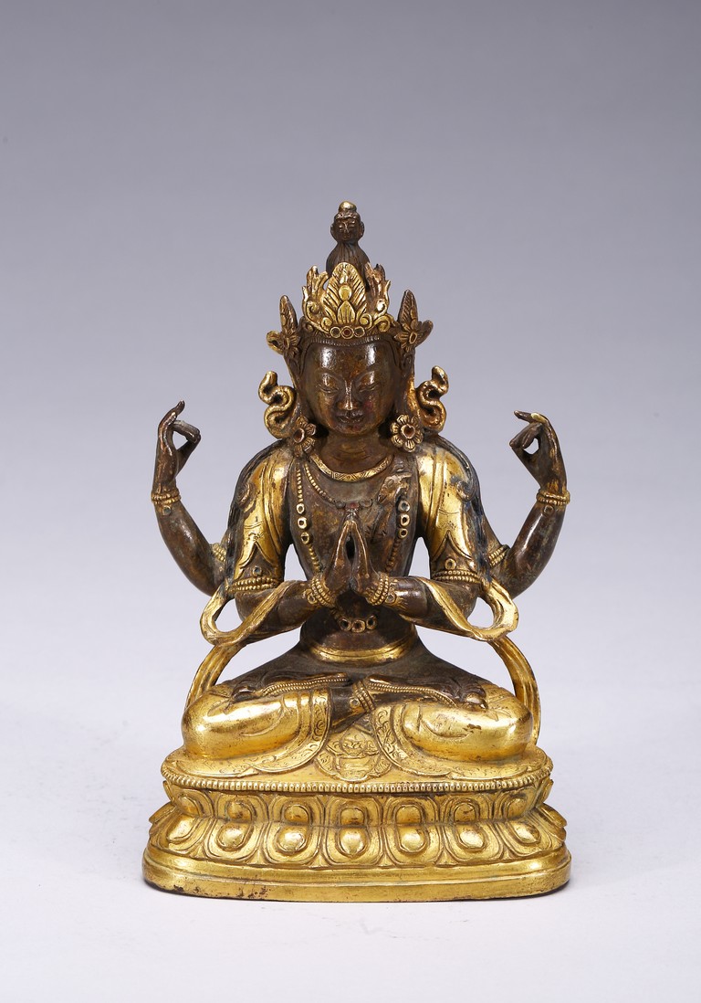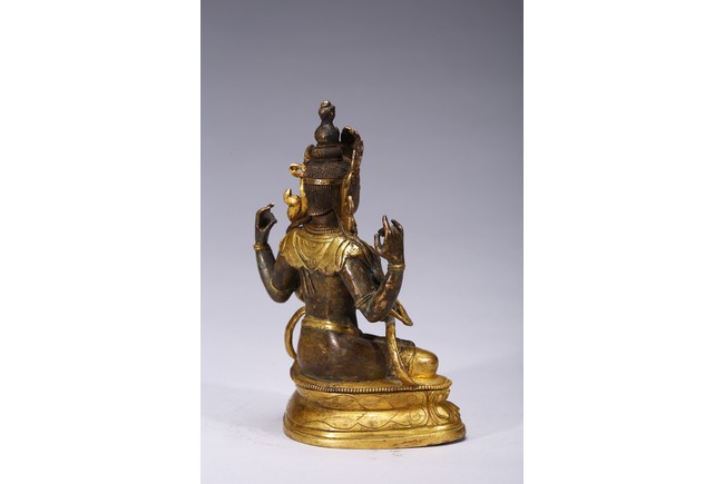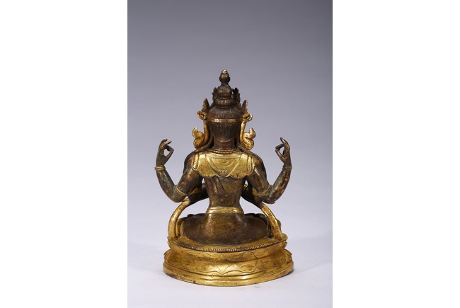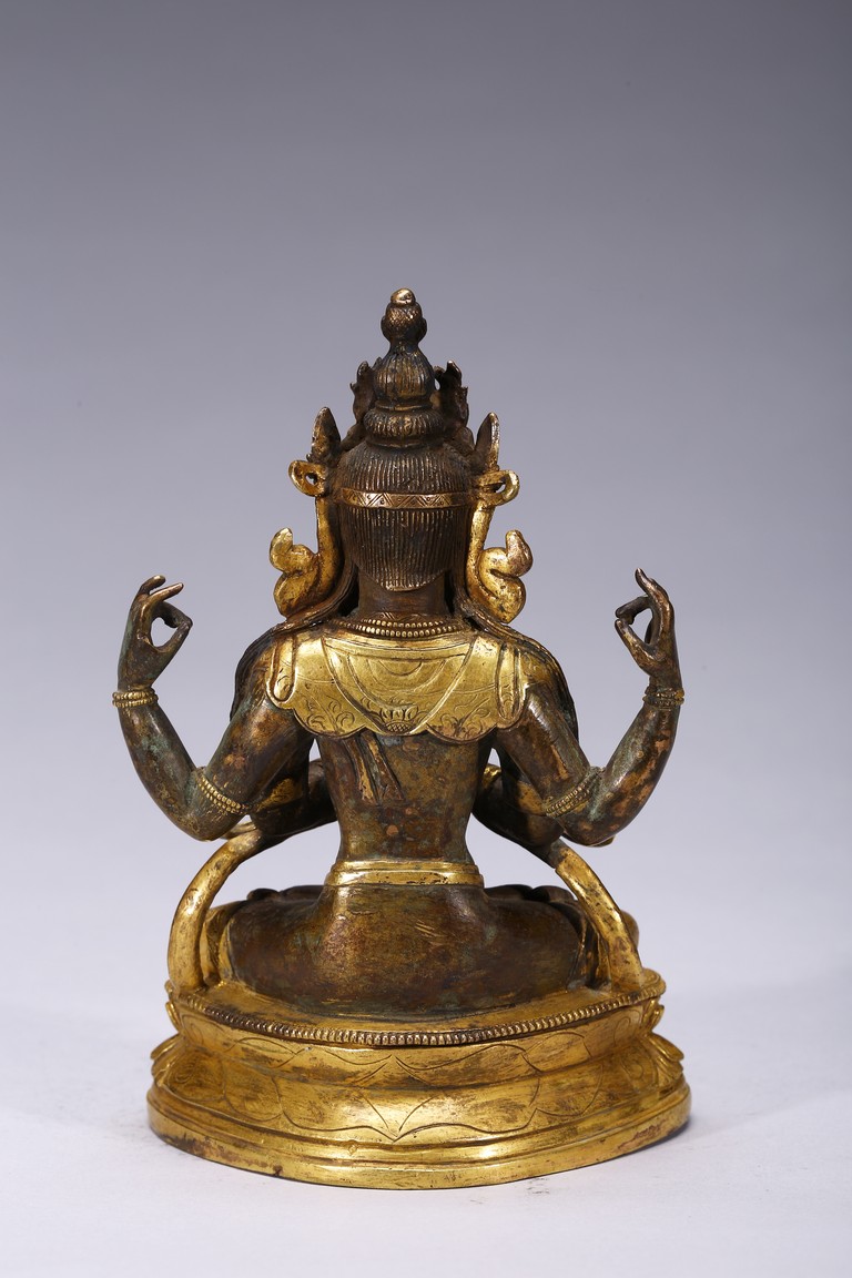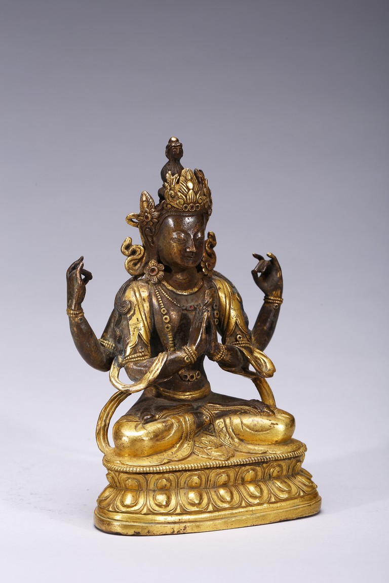 四臂觀音,藏傳佛教密宗本尊之一,是雪域西藏的守護神。本器面相方圓,細眉高翹,雙目低垂,表情沉靜。肉髻高聳,寶珠頂嚴,頭戴五葉花冠,寬肩束腰,體態均稱,造型優美。上身袒露,胸前飾項圈瓔珞,帔帛搭於肩,在雙手腕處分別繞成半圓環,繞過兩腿垂於蓮座前方。下身著長裙,主臂雙手於胸前合十全跏趺坐於蓮花寶座之上。整體衣褶自然流暢,蓮瓣寬大飽滿,通體金色明亮。