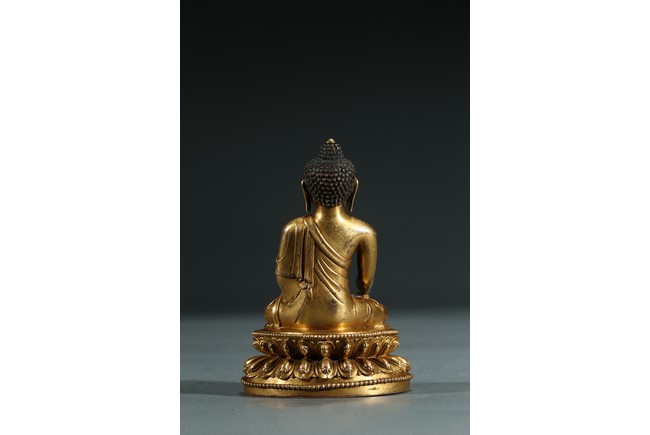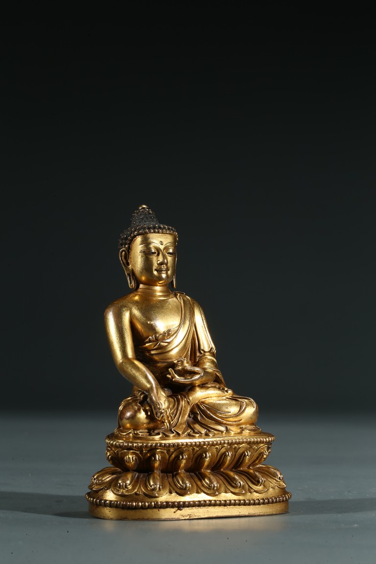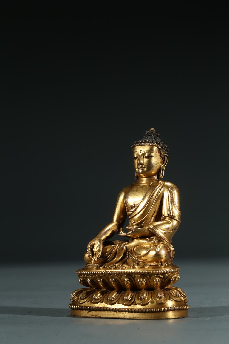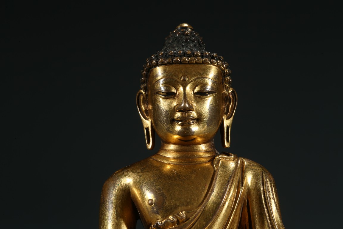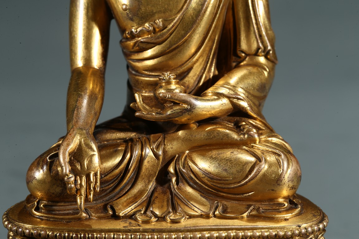 Seated upon double lotus throne, wearing a pleated robe and sash draped over his shoulders and falling in loose folds over his crossed legs, his gentle with finely drawn eyebrows centered with the urna, the eyes downcast in a meditative expression, the ears with long pendulous lobes and the hairs arranged in rows of tight curls covering the domed ushnisha, supported on a rounded double lotus base with beaded edges, the base sealed with double vajra symbol.