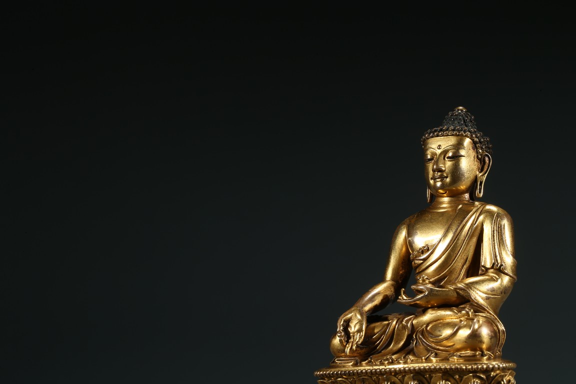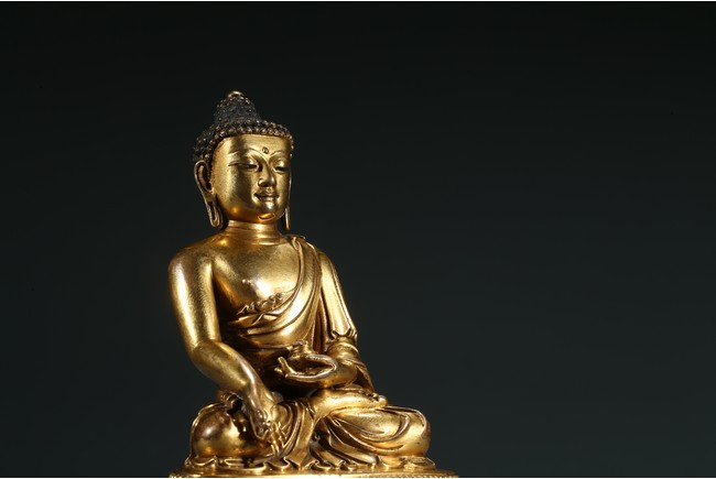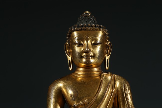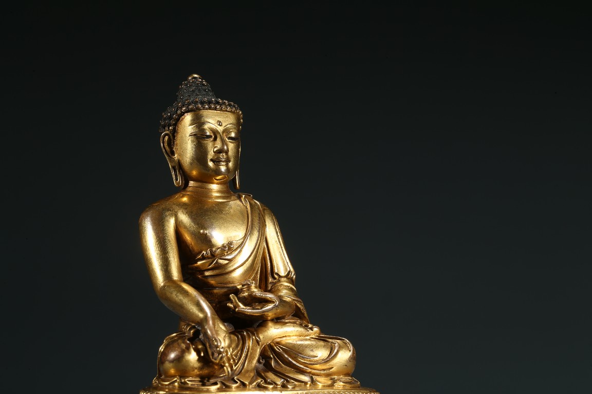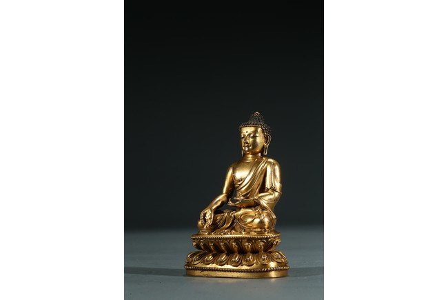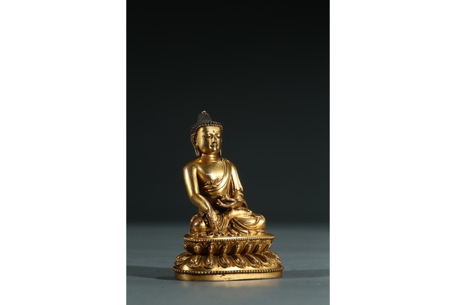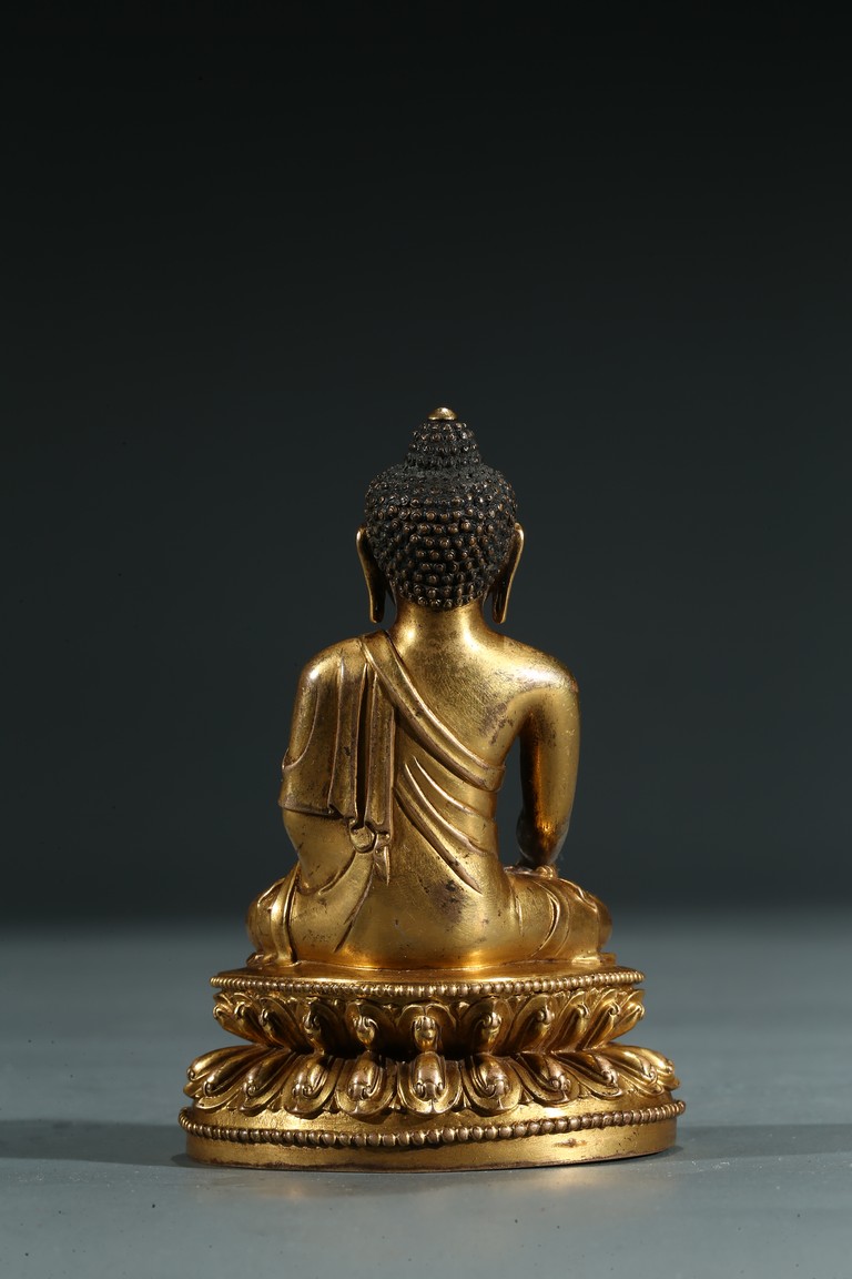 Seated upon double lotus throne, wearing a pleated robe and sash draped over his shoulders and falling in loose folds over his crossed legs, his gentle with finely drawn eyebrows centered with the urna, the eyes downcast in a meditative expression, the ears with long pendulous lobes and the hairs arranged in rows of tight curls covering the domed ushnisha, supported on a rounded double lotus base with beaded edges, the base sealed with double vajra symbol.