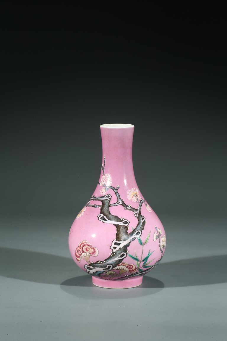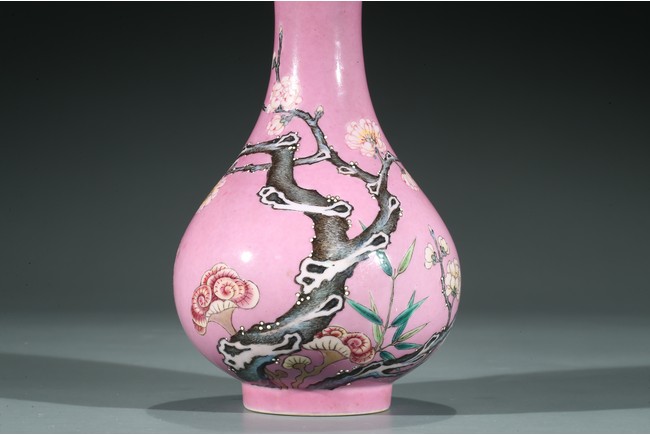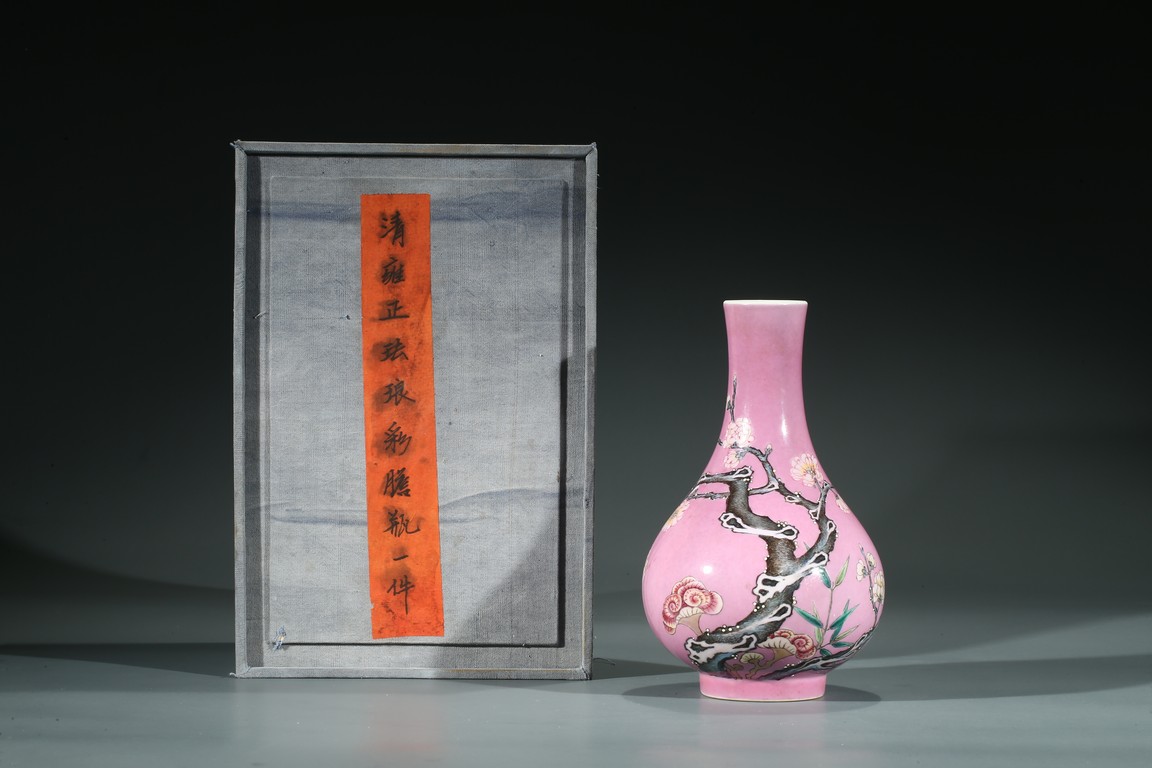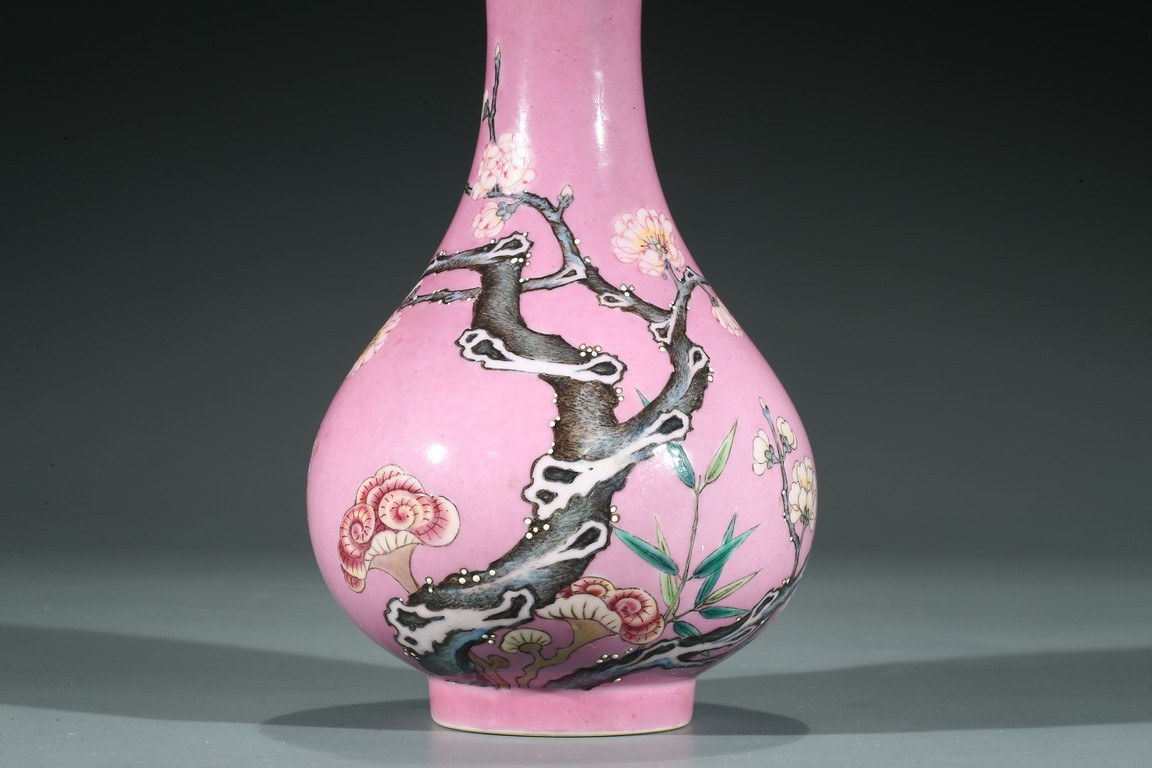 Of globular body and rising to waisted neck and flared mouth, the body finely enamelled with branches of plum blossoms, lingzhi mushrooms, and bamboo leaves, all reserved on pink color ground, the base inscribed with six character Yongzheng mark.