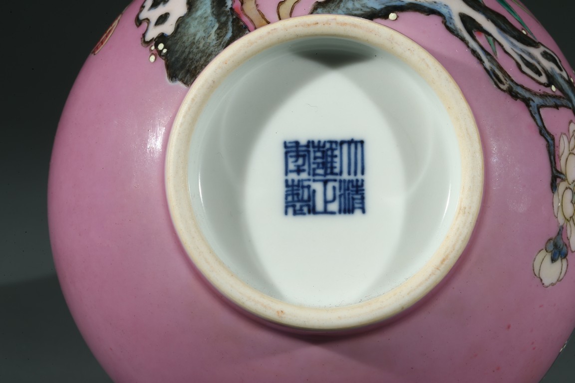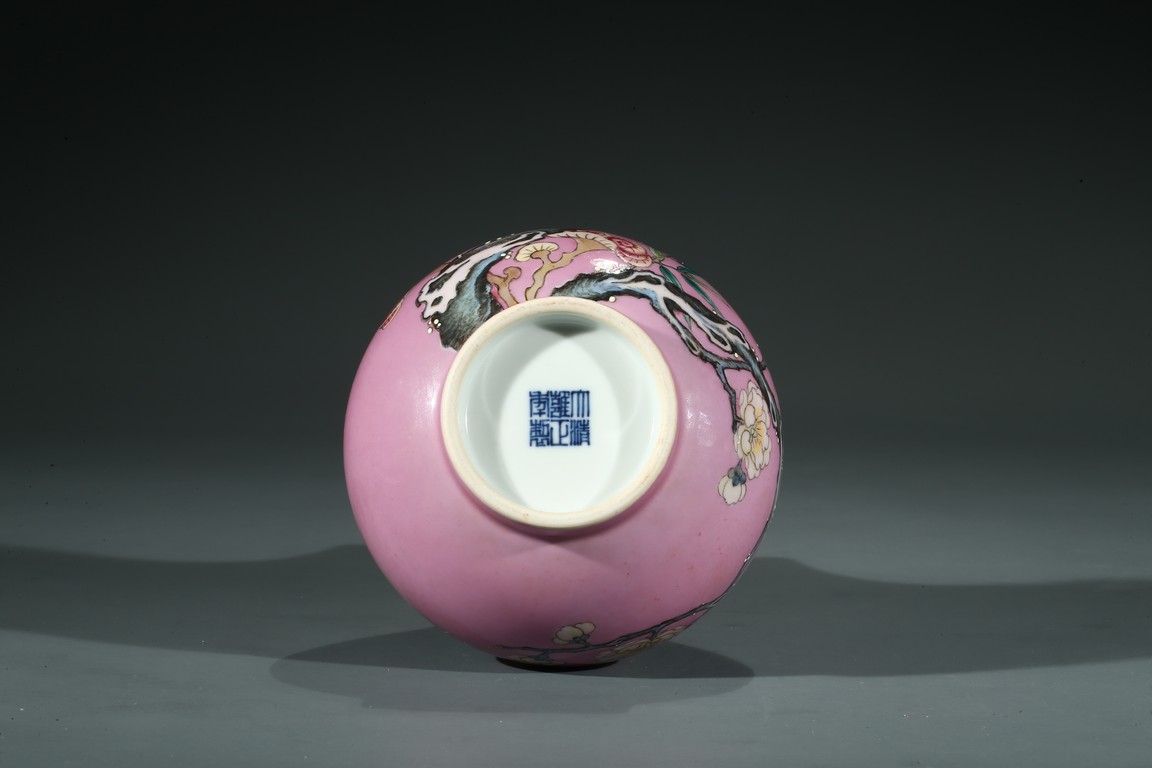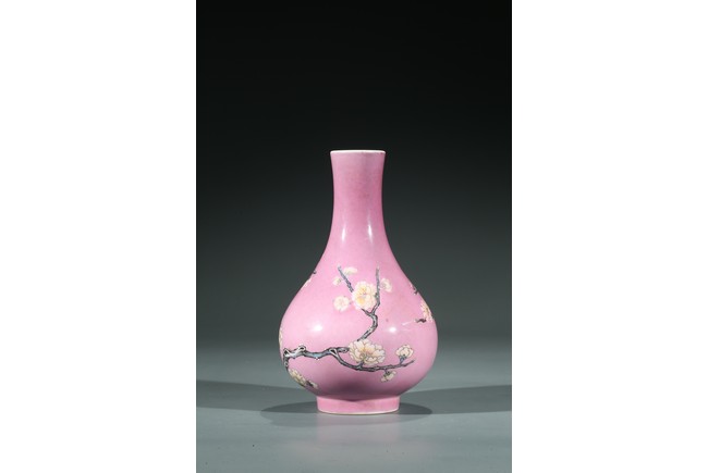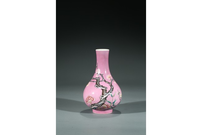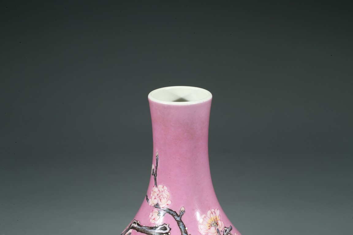 Of globular body and rising to waisted neck and flared mouth, the body finely enamelled with branches of plum blossoms, lingzhi mushrooms, and bamboo leaves, all reserved on pink color ground, the base inscribed with six character Yongzheng mark.