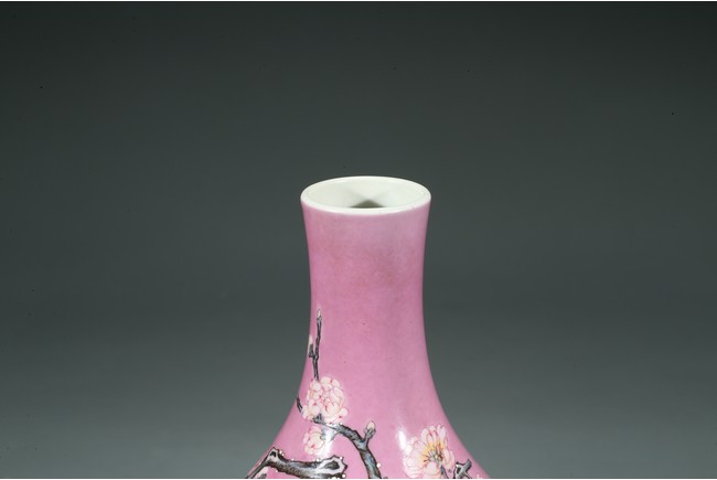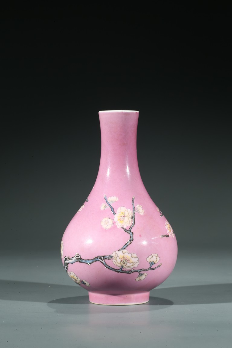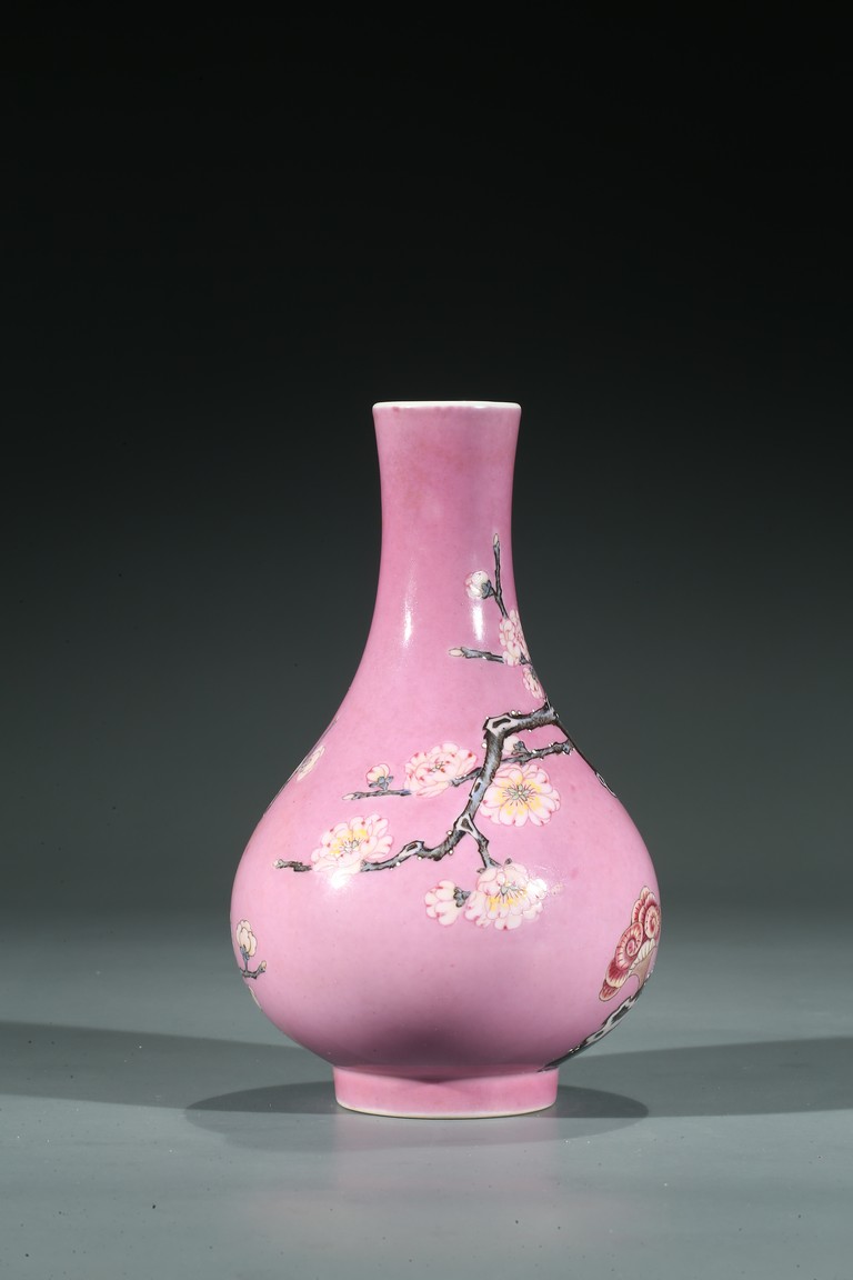 此瓶直口、束頸、溜肩、鼓腹、圈足。外壁通體以胭脂紅為地,上彩繪一株乾枝梅花,竹子、靈芝在周圍環繞,繪製精細,畫面佈局疏密有致,寓意吉祥,整體畫面清新脫俗,矯艷唯美。整體器型秀美,胎質潔白細膩,釉面瑩潤潔淨,修胎規整,製作考究,保有完好,應為皇家御用賞器。