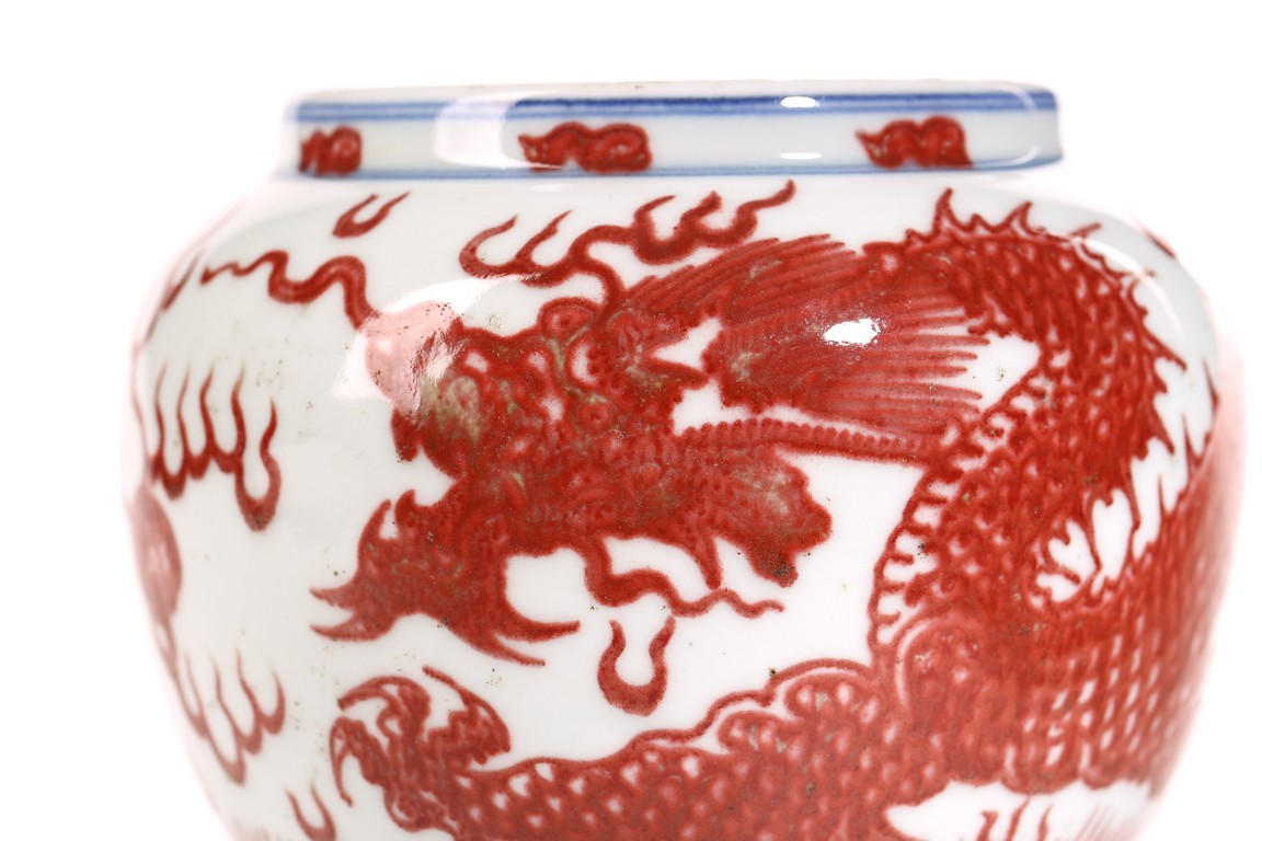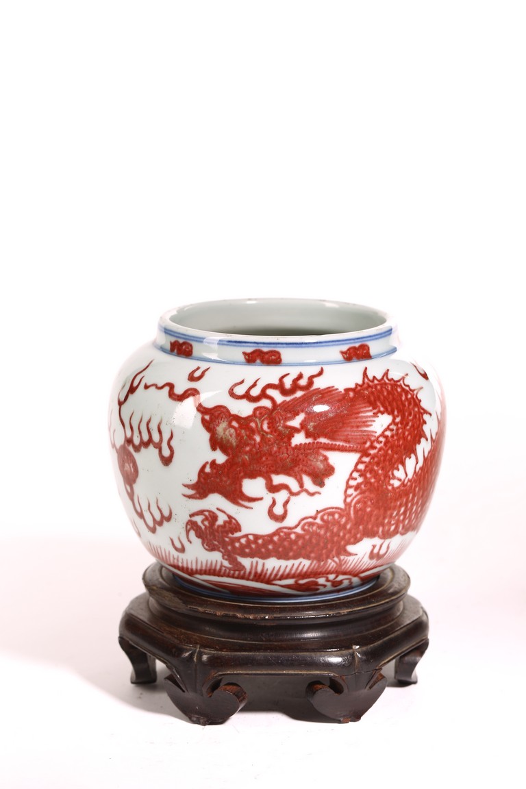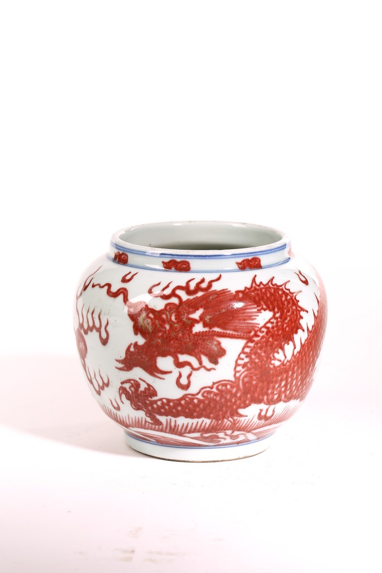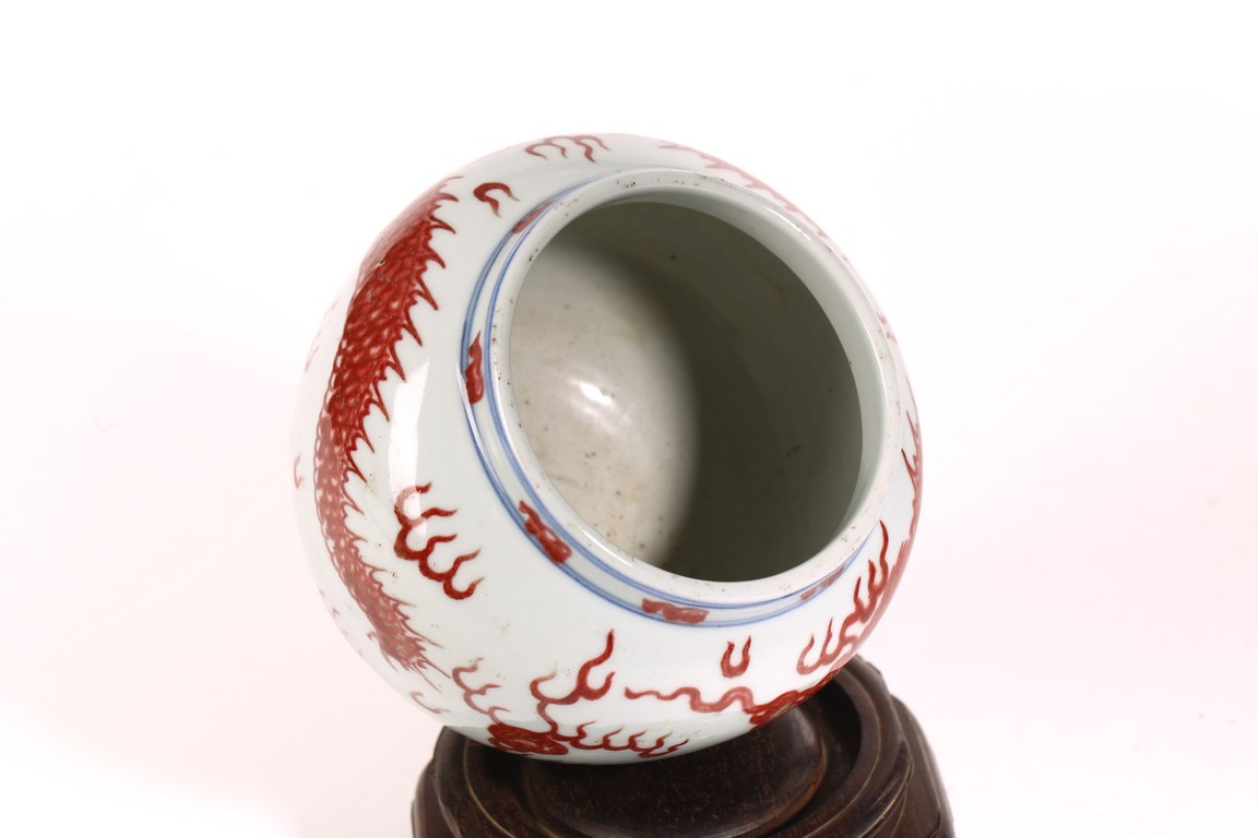 Qing Dynasty period. Of ovoid form, the body decorated in underglaze red with a wrathful dragon chasing flaming pearl above turbulent waves, the short neck decorated with band of cloud pattern within two blue glazed double line rings. The interior of the base painted with double rings.