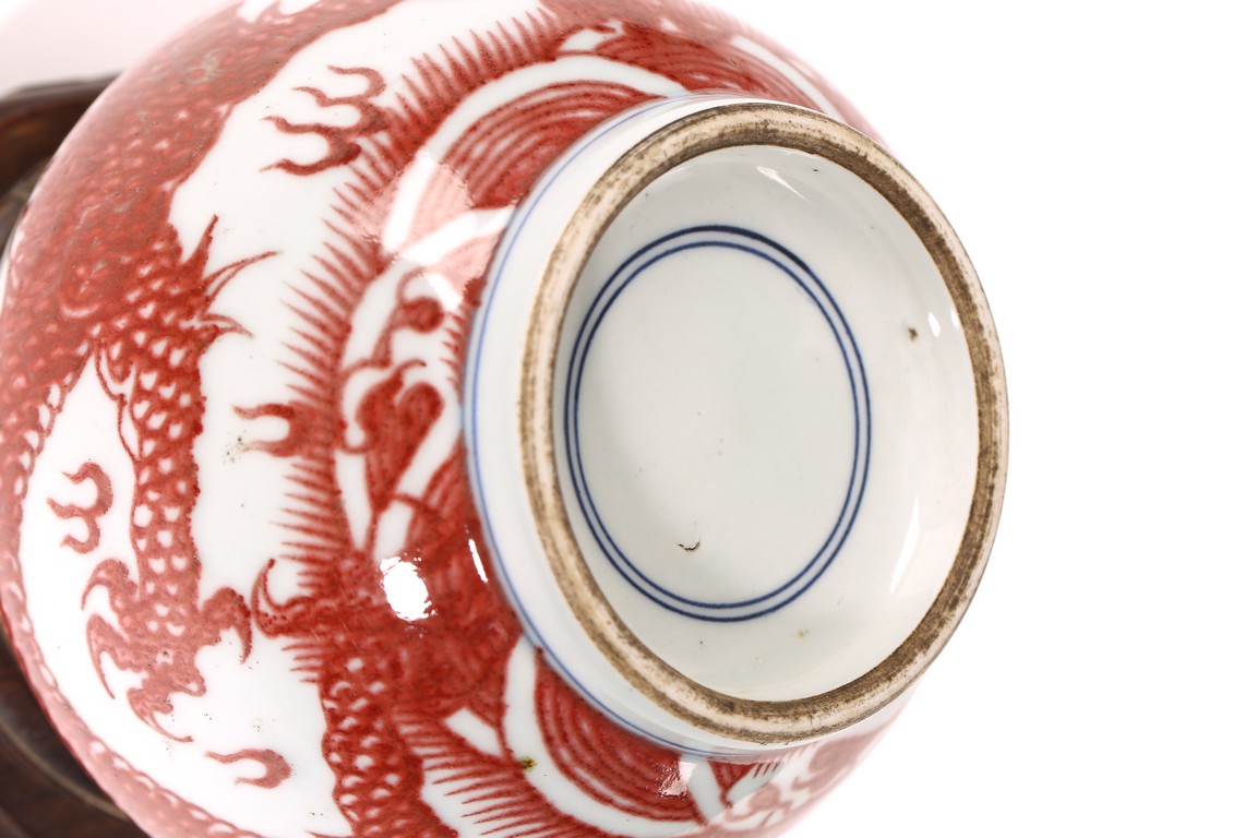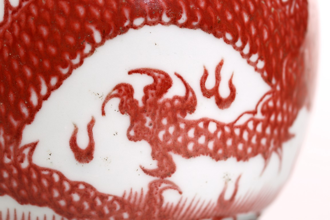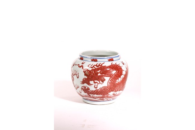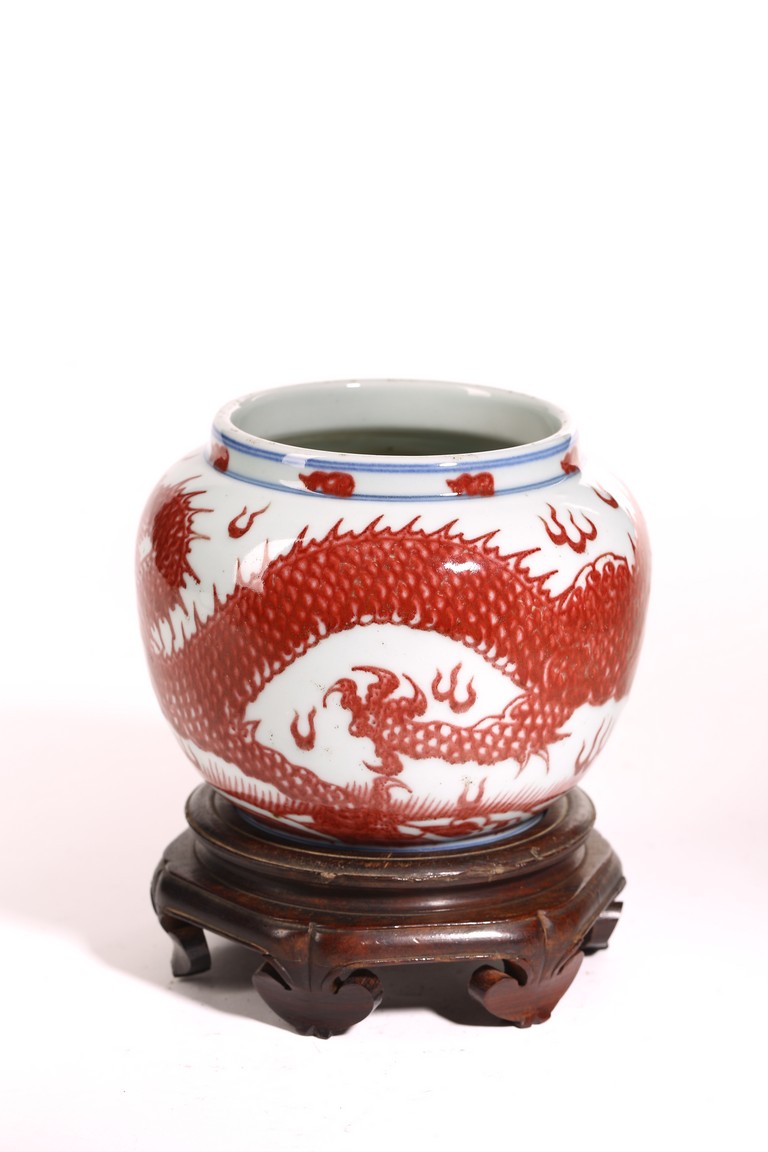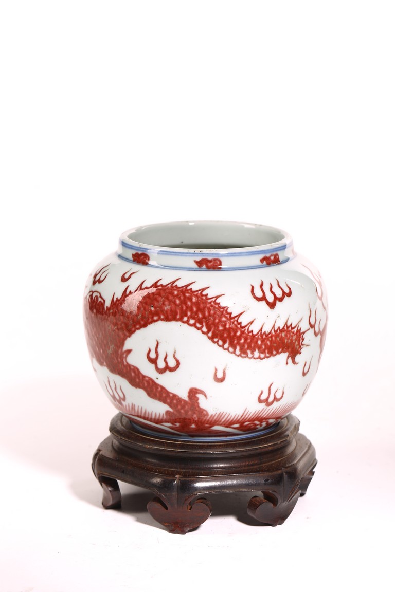 Qing Dynasty period. Of ovoid form, the body decorated in underglaze red with a wrathful dragon chasing flaming pearl above turbulent waves, the short neck decorated with band of cloud pattern within two blue glazed double line rings. The interior of the base painted with double rings.