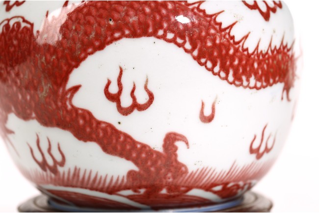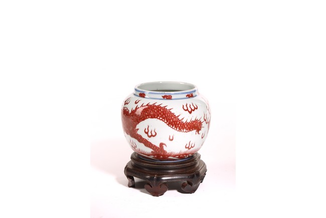 此件藏品,器形小巧精緻,外壁以礬紅雲龍圖案,紋飾工整,顏色鮮豔,整觀此器,有明瓷器之粗狂風格,蒼龍遒勁,氣勢恢宏,值得細細品讀。