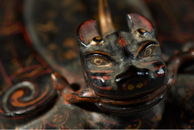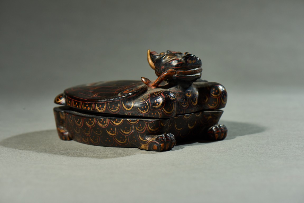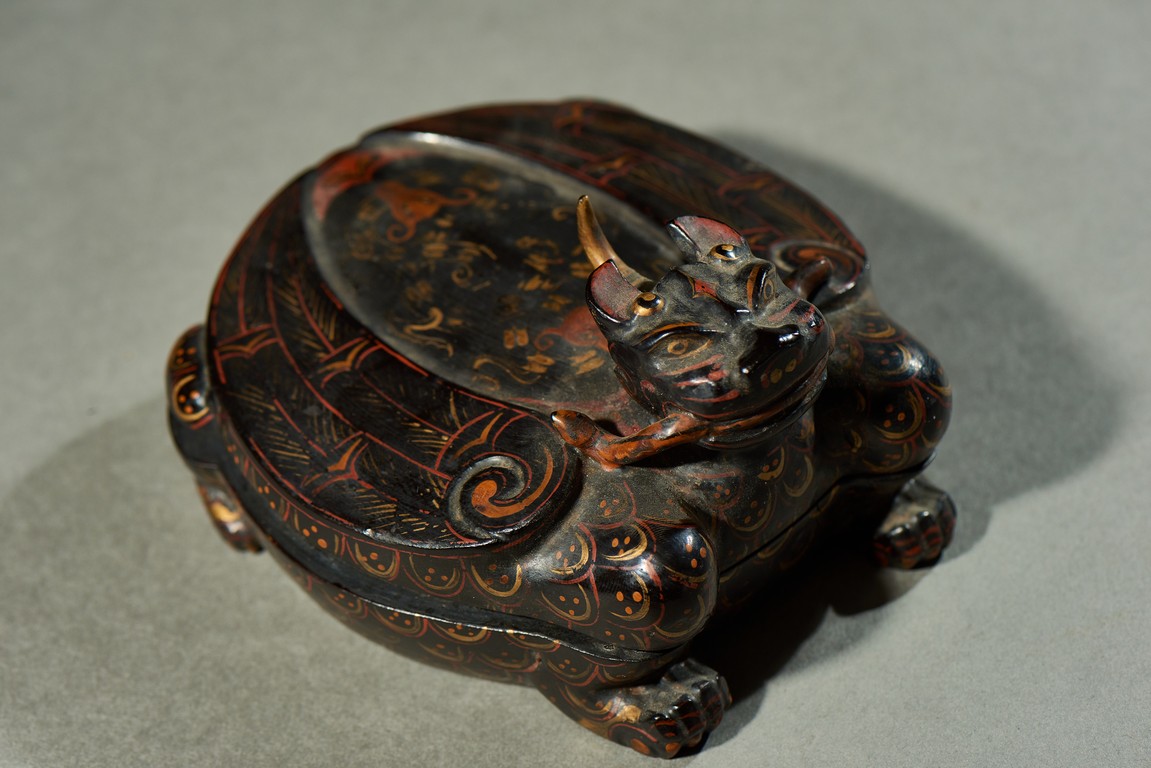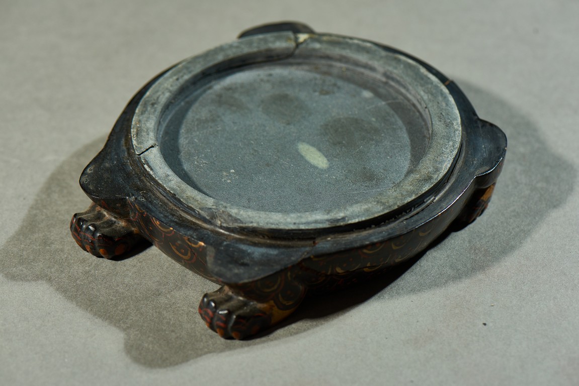 A PAINTED LACQUER 'MYTHICAL BEAST' INKSTONE    明 漆器瑞獸硯台