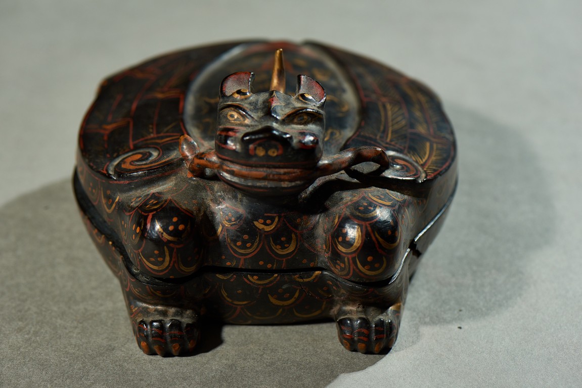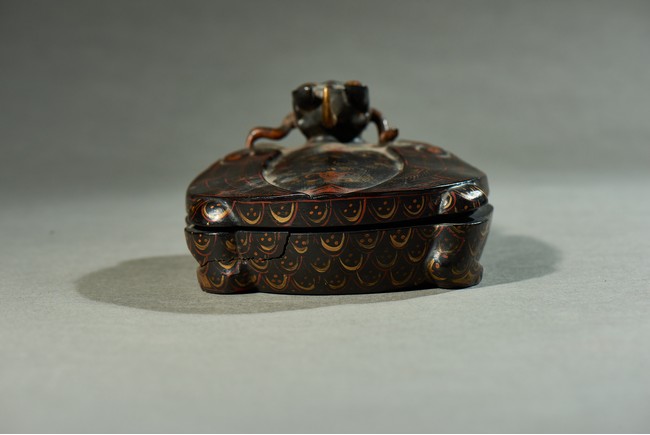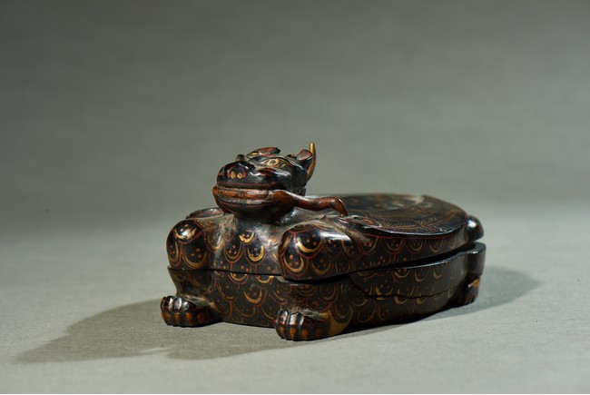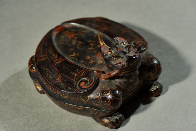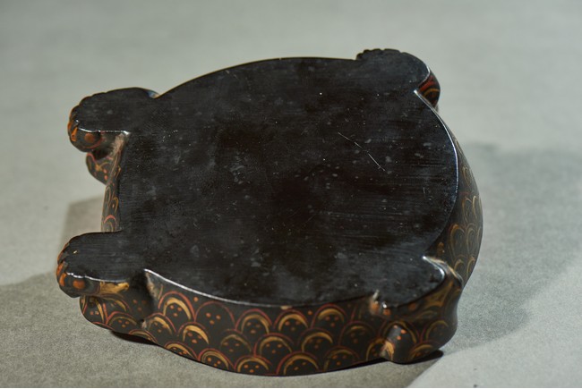 The inkstone modelled in the form of a lacquered recumbent mythical beast with gilt painted decorations.