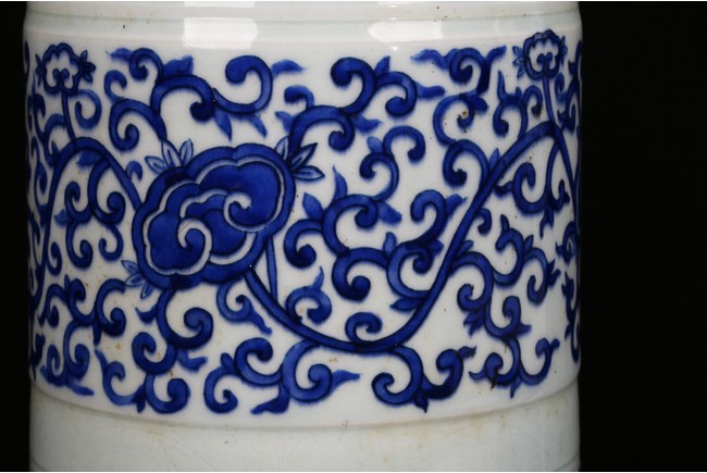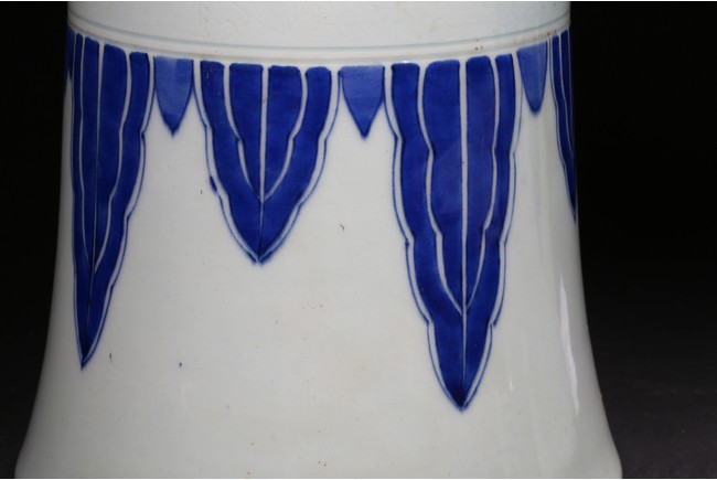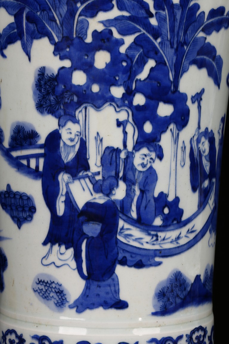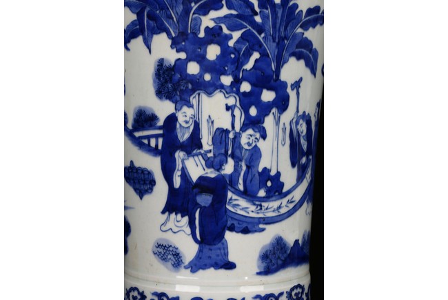 Each of flared rim, the top main part fainly painted group of elder officials appreciating a flower painting under tall trees in a garden setting, the middle section decorated with band of meandering lotus and auspicious ruyi emblems, the bottom section with band of floral lappets. Qing Dynasty period.