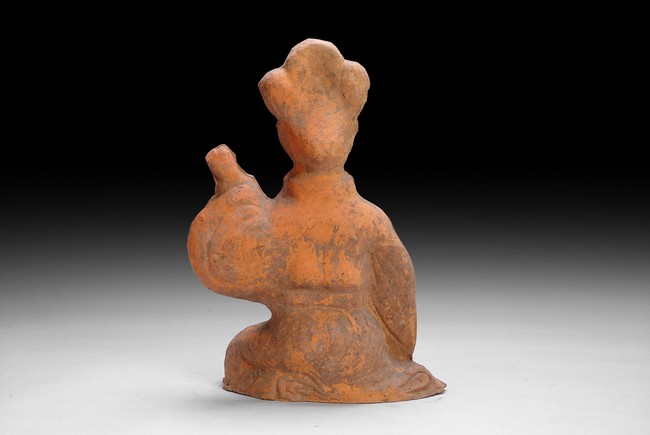 This pottery figure depicts a female musician playing the traditional Chinese instrument Pipa. She was sculpted in kneeling position, with head held high, and serene facial expressions. She is dressed in full length robe, and a tall headdress. Han Dynasty