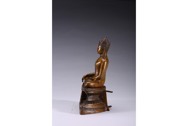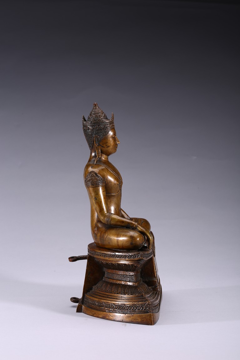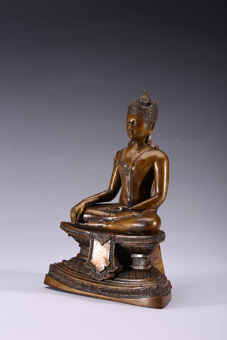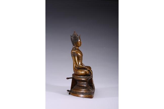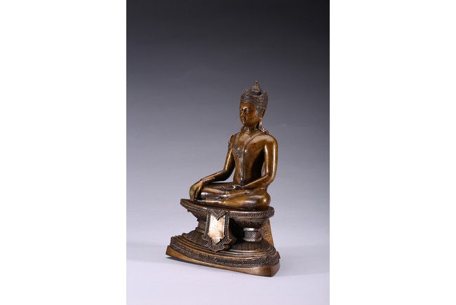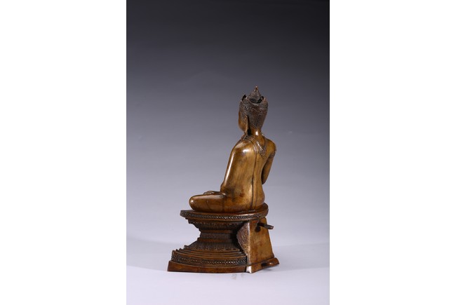 The figure is shown seated in dhayanasa on a concave plinth, the hands in bhumisparsha mudra and dhyana mudra, wearing dhoti with incised hem, the face with a serene expression and head framed by an elaborate crown.17th century.