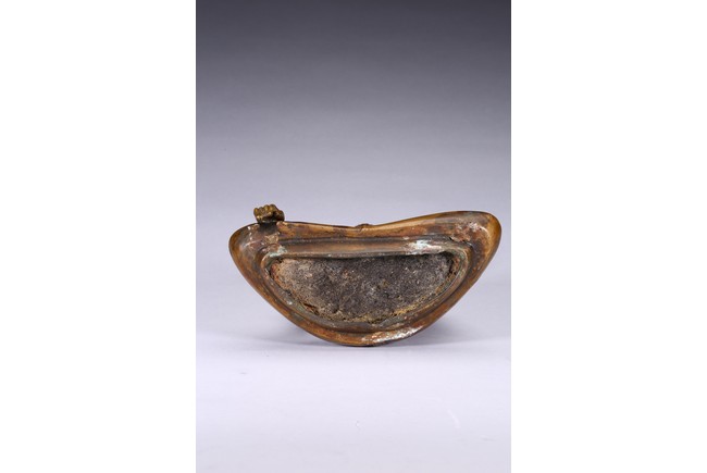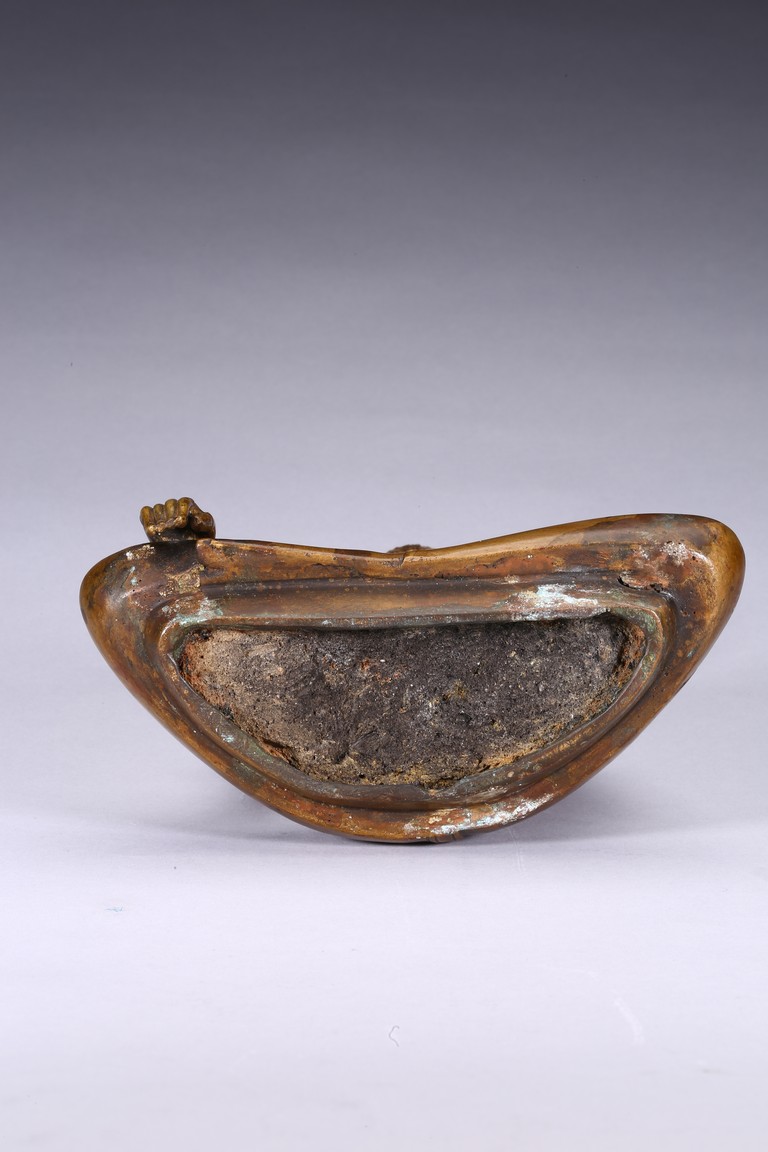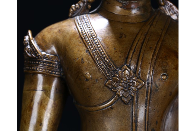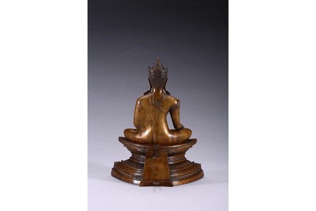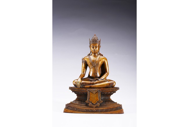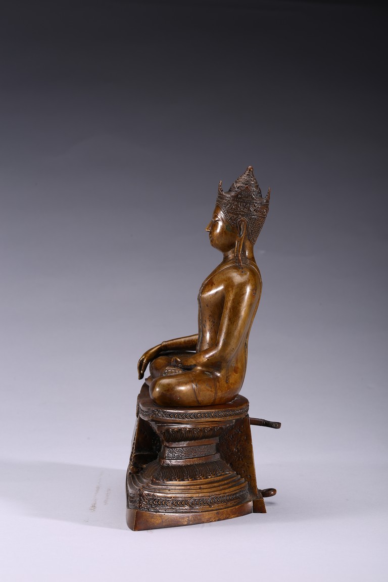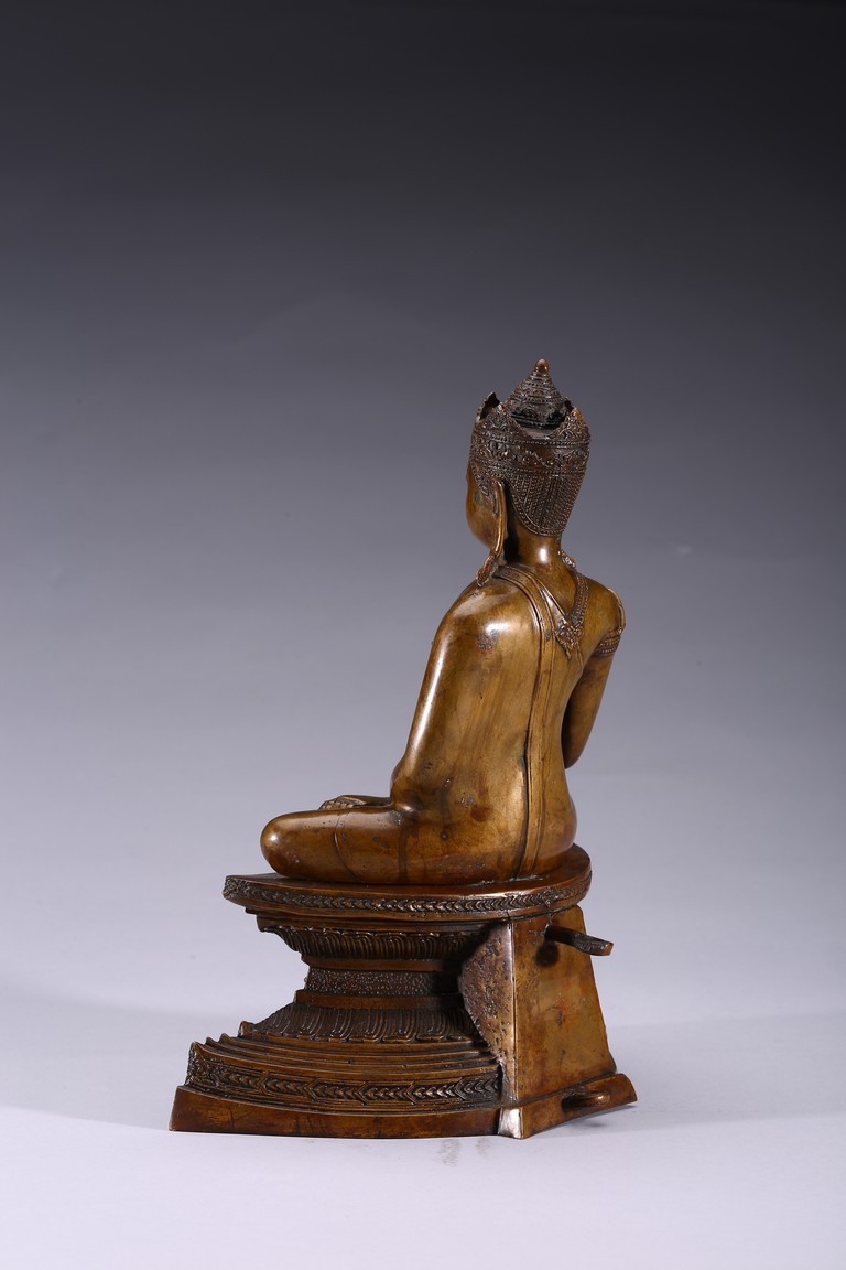 The figure is shown seated in dhayanasa on a concave plinth, the hands in bhumisparsha mudra and dhyana mudra, wearing dhoti with incised hem, the face with a serene expression and head framed by an elaborate crown.17th century.