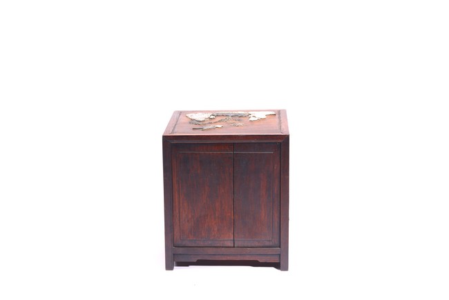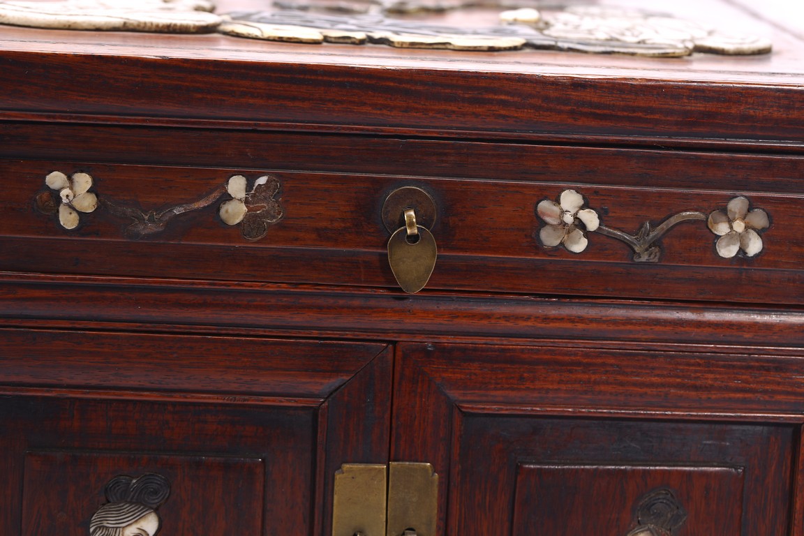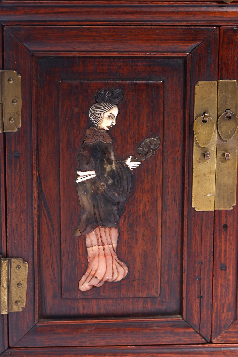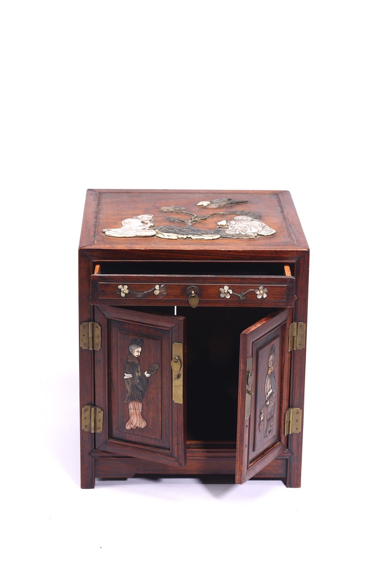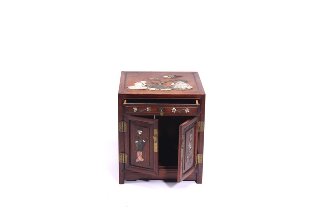 Qing Dynasty period. Inlaid with array of hardstones and mother of pearls, the front with two ladies holding ruyi scepter and lantern, the top with two elderly figures seated next to pine tree, the interior with a tray and a pair of door plates.
