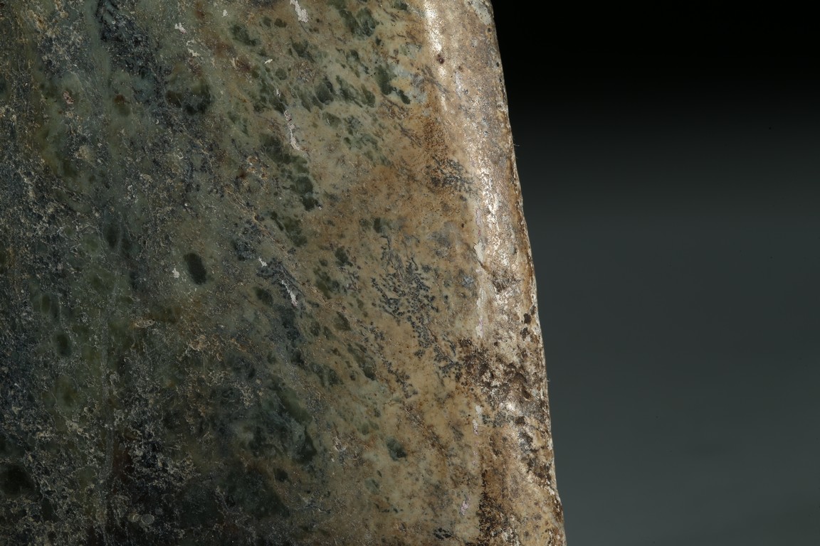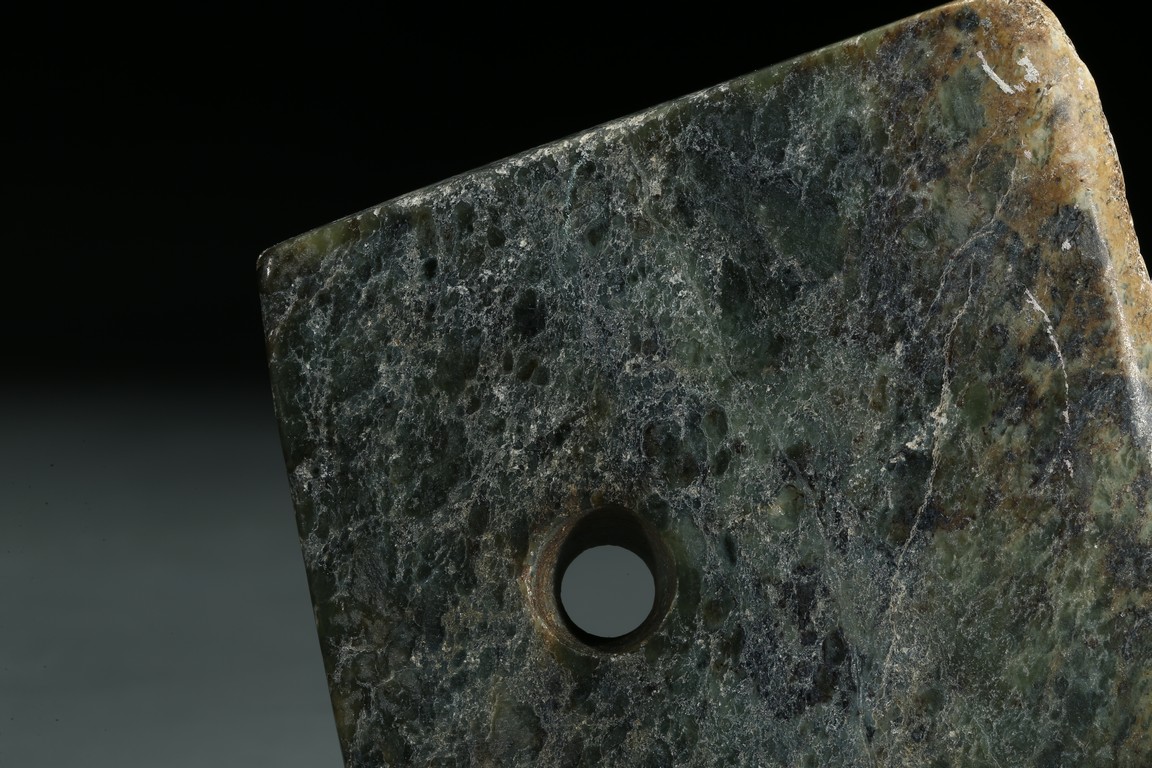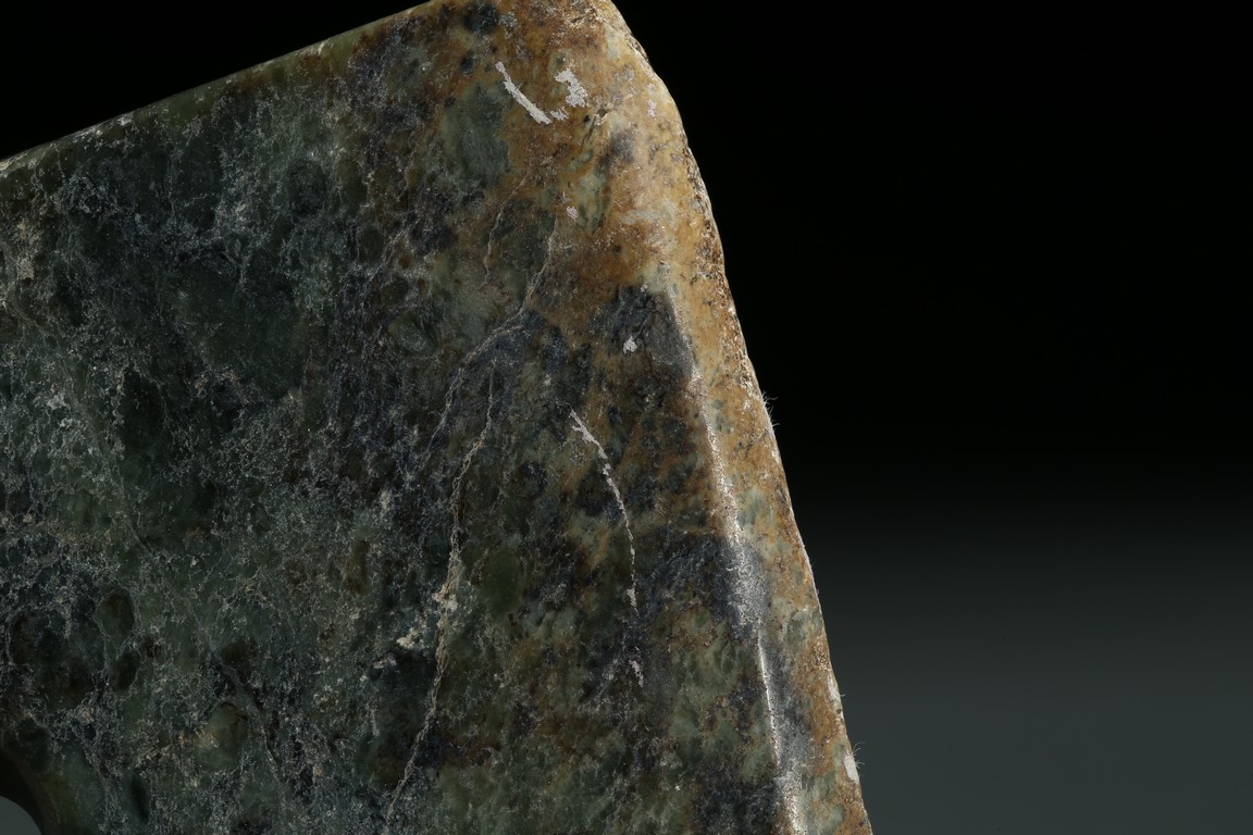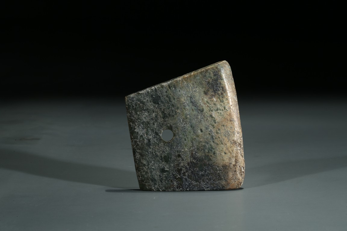 全器呈扁平梯形,單側鑽一孔,一端略微窄小,另一端較寬,頂部出刃。玉色青綠,局部帶石灰白沁、土黃沁,肌理變化自然,妙不可言油光潤澤,古韻凜然。