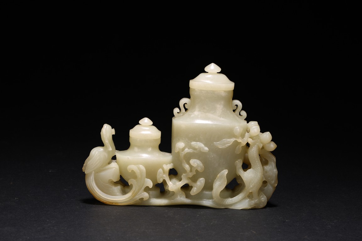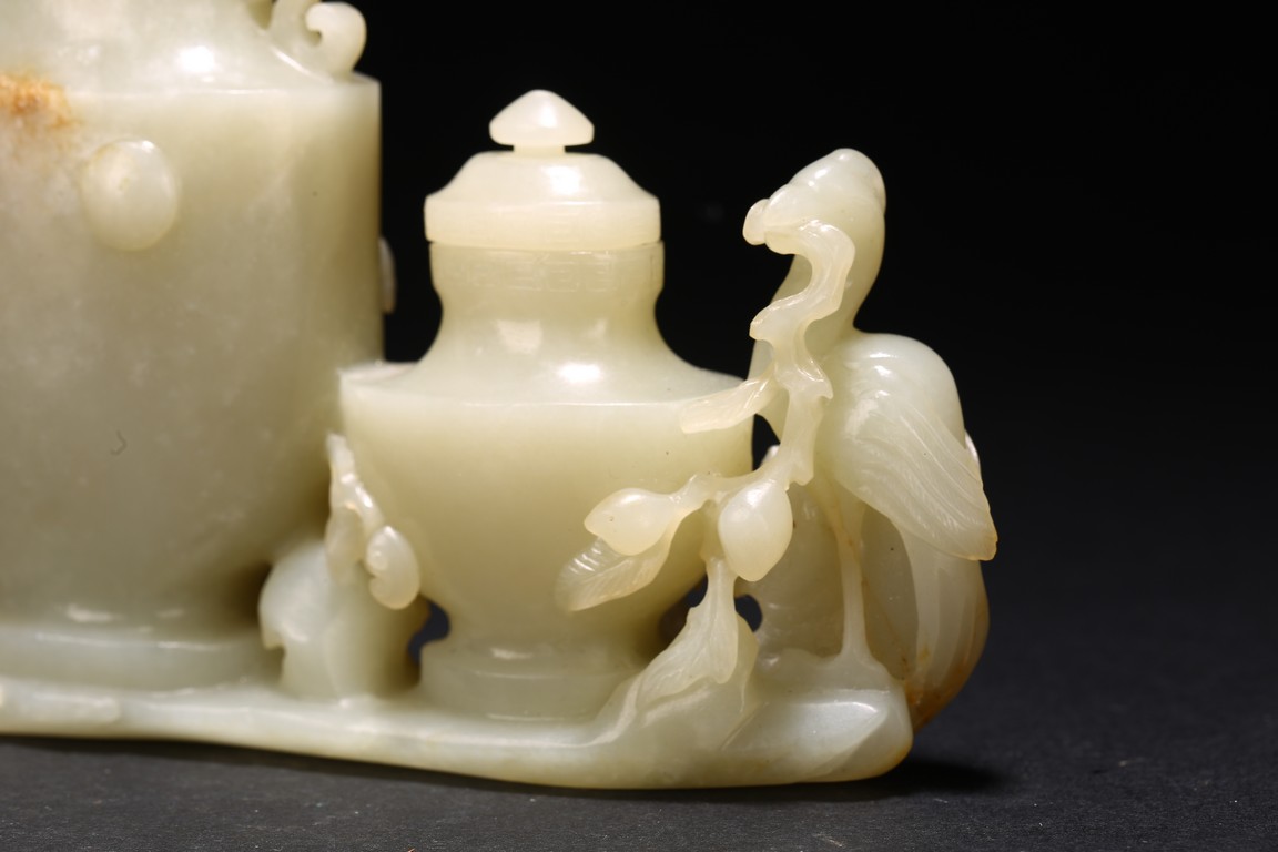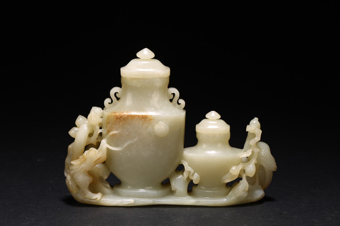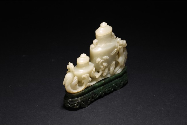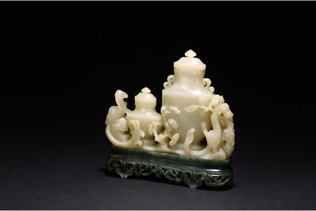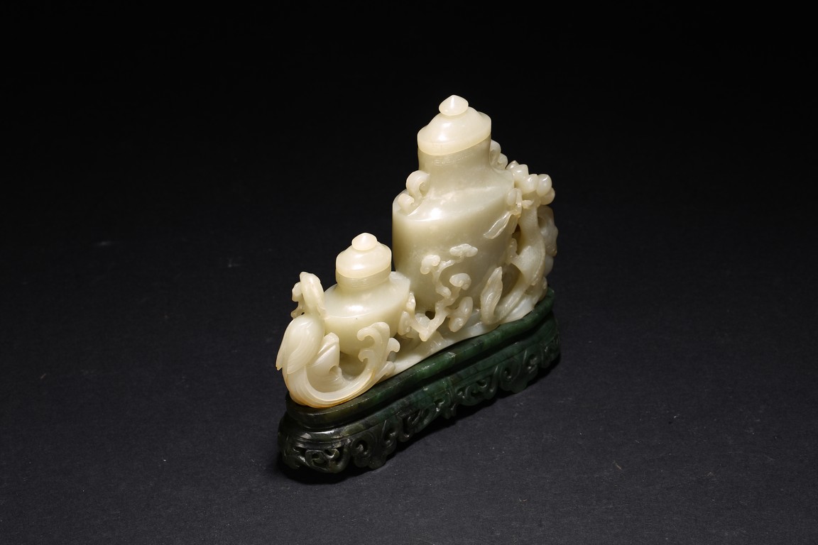Qing Dynasty period. Carved in the form of one large and one small vases linked together, flanked by a dragon on one side and a crane on the other, all supported on spinach green jade stand.