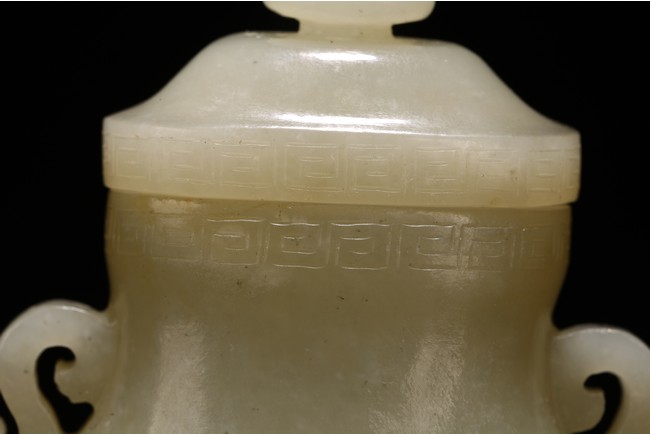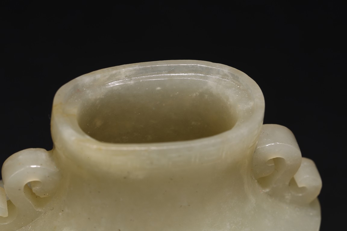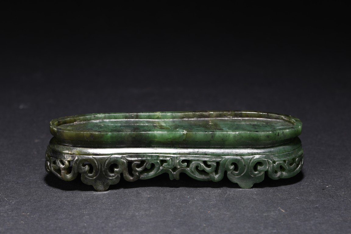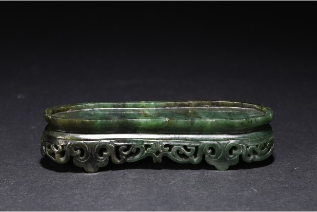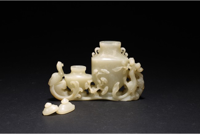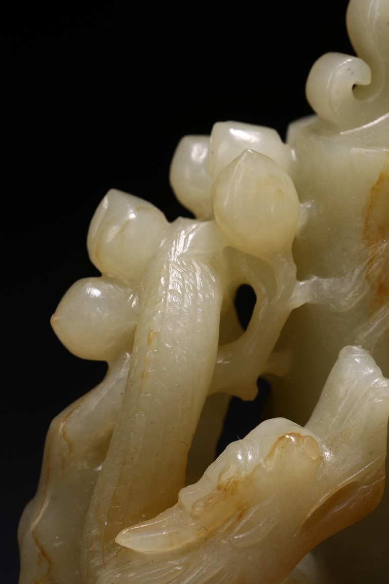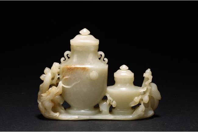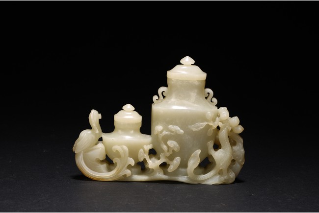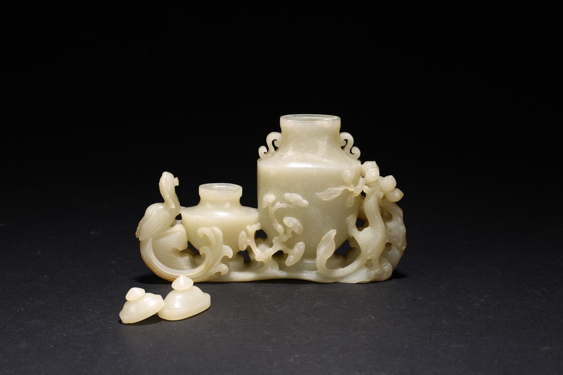 Qing Dynasty period. Carved in the form of one large and one small vases linked together, flanked by a dragon on one side and a crane on the other, all supported on spinach green jade stand.