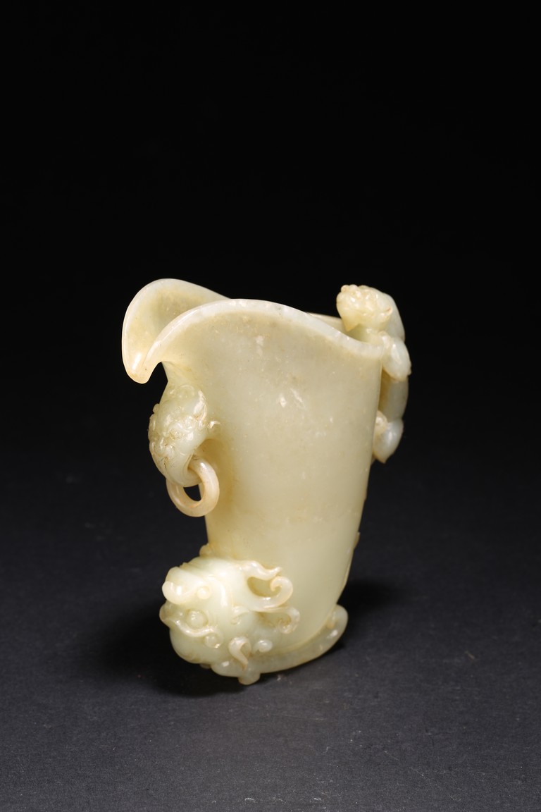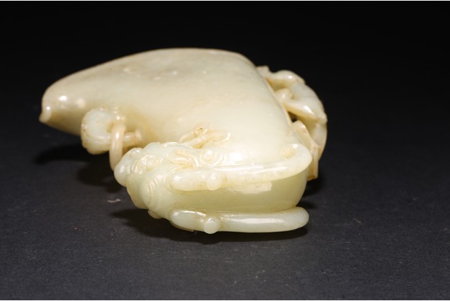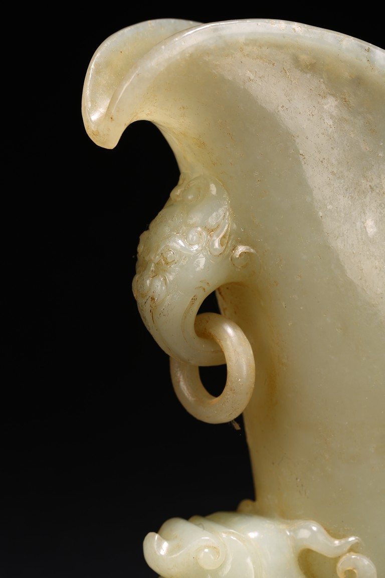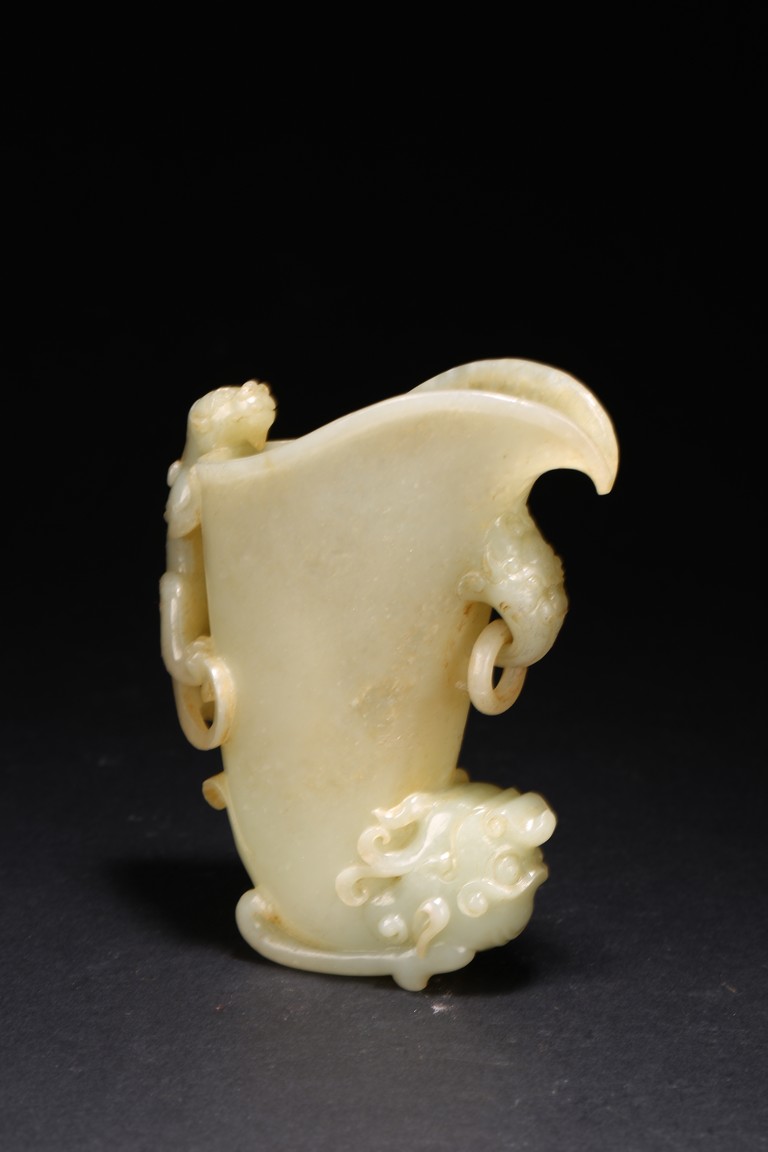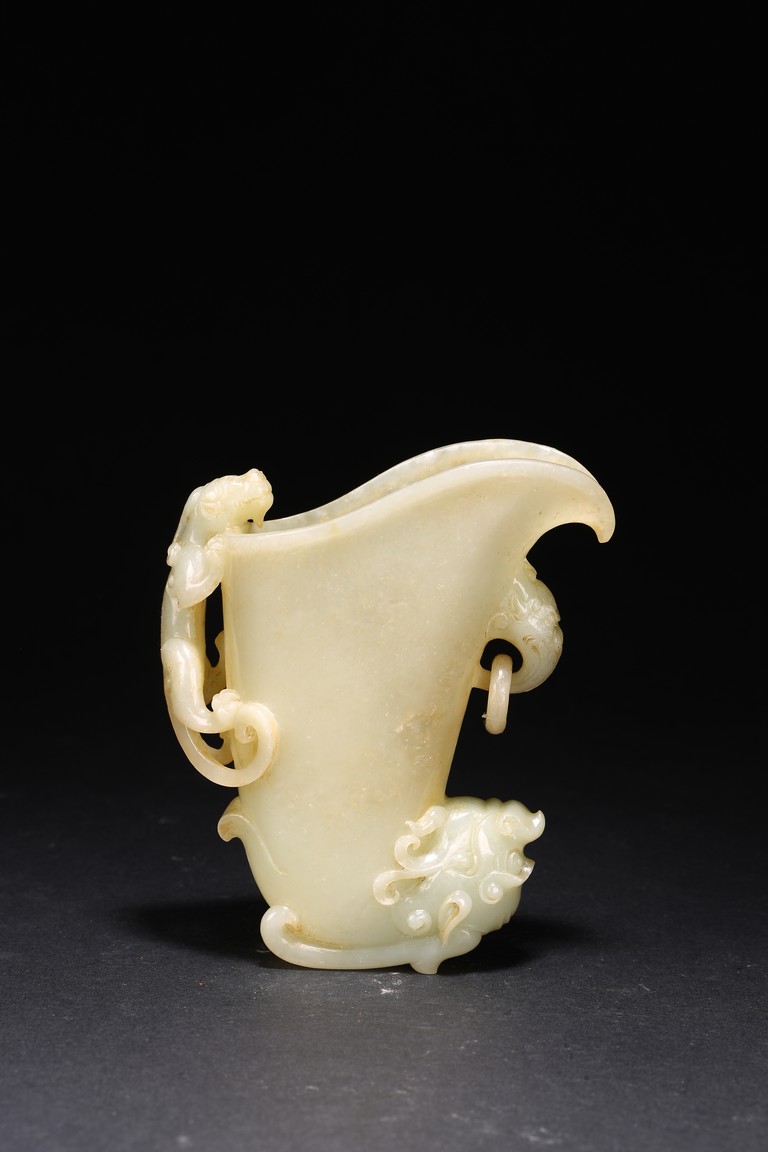 Qing Dynasty period. The well-hollowed vessel is carved issuing from the mouth of a dragon-fish. The handle is carved and undercut as a chilong grasping onto the rim, the other side carved with loose ring handle.