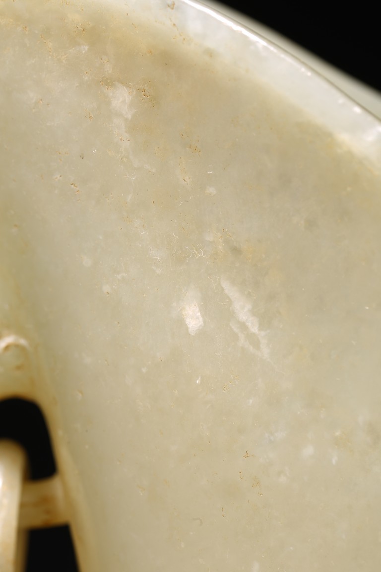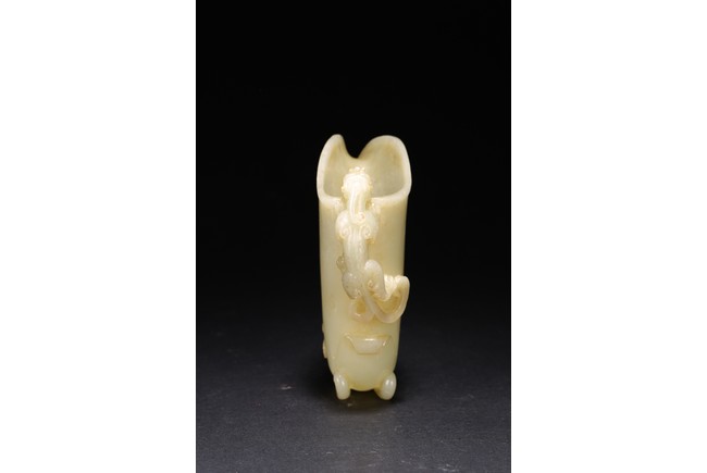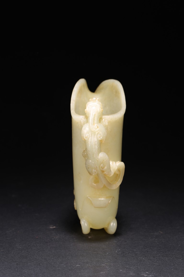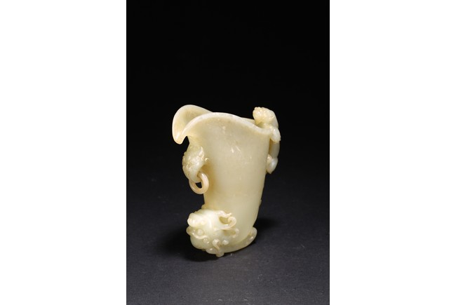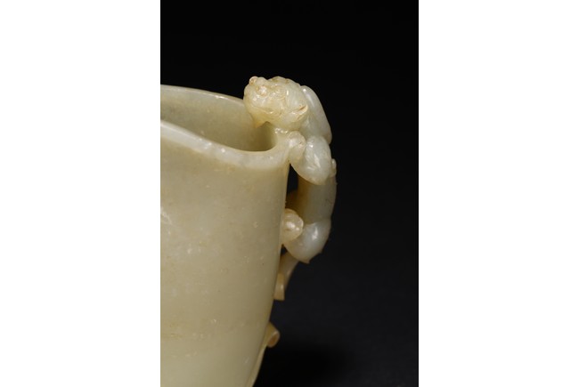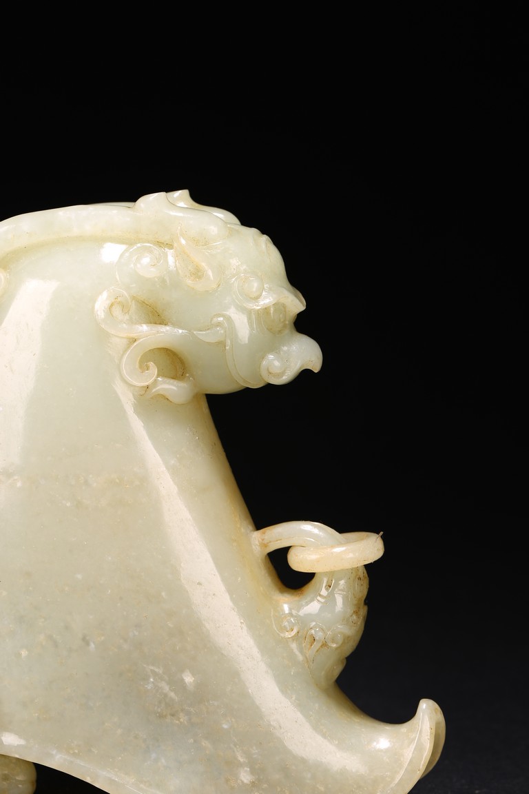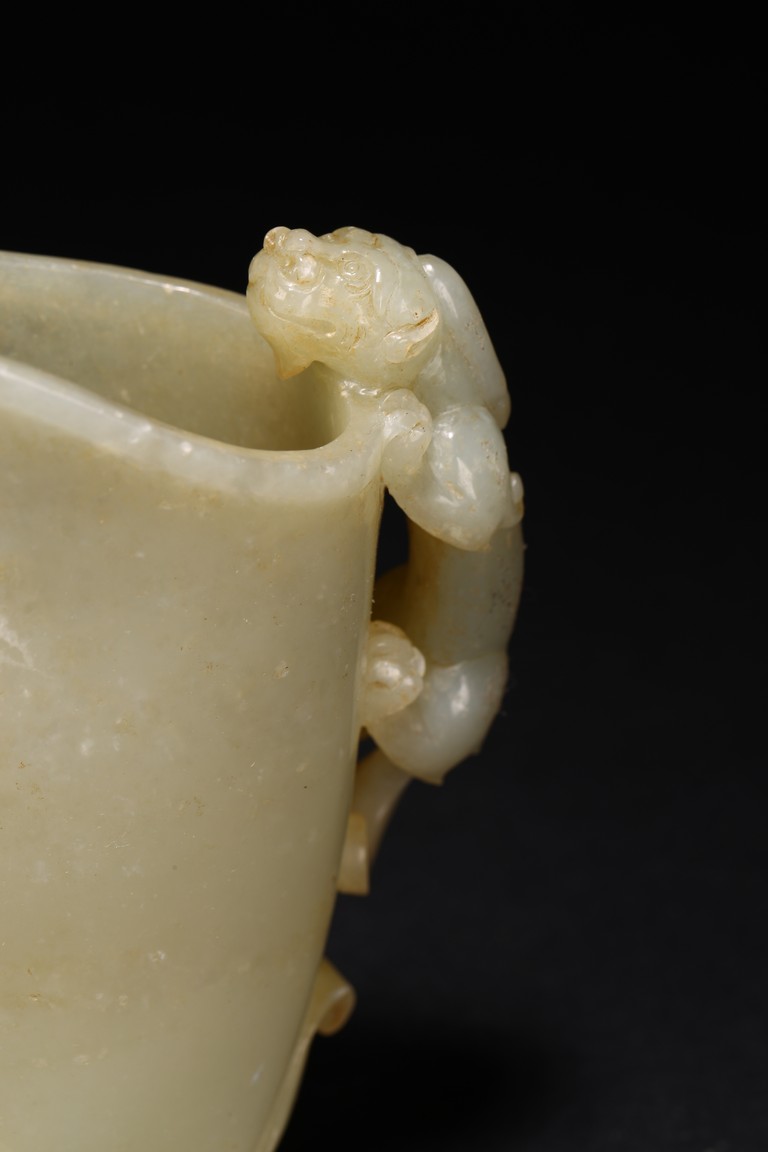 Qing Dynasty period. The well-hollowed vessel is carved issuing from the mouth of a dragon-fish. The handle is carved and undercut as a chilong grasping onto the rim, the other side carved with loose ring handle.