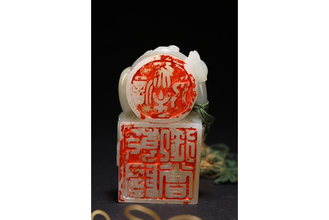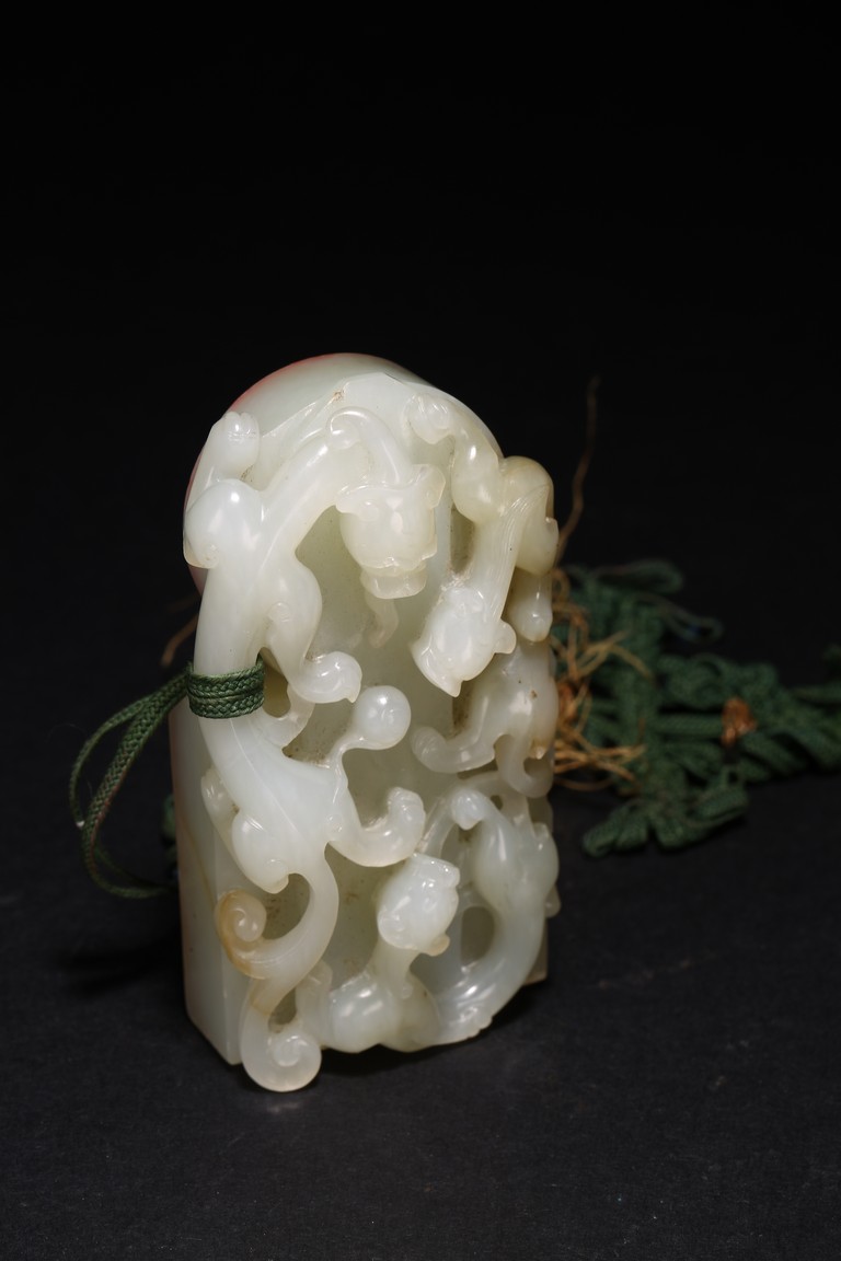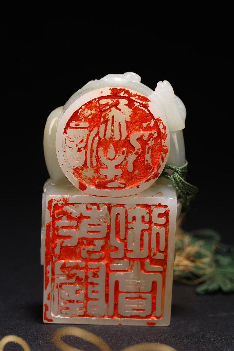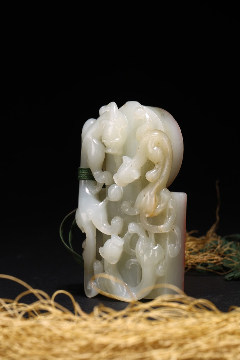 Qing Dynasty period. Of rectangular and circular form, the seal carved with three sinuous chilong in high relief on as finial, the circular and rectangular seal faces each carved with four characters.