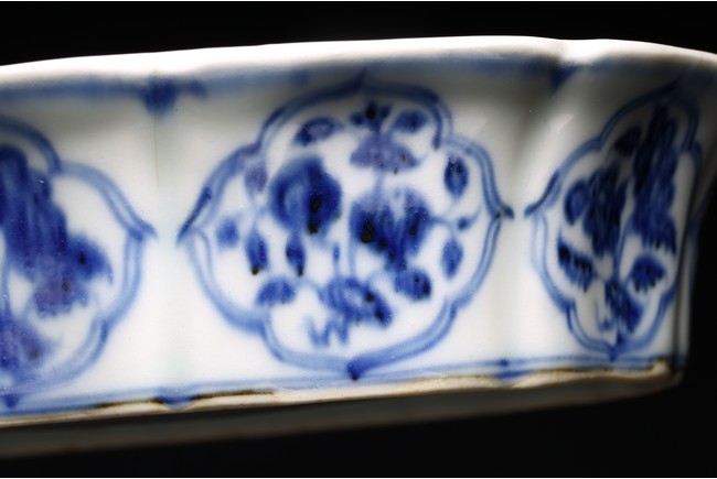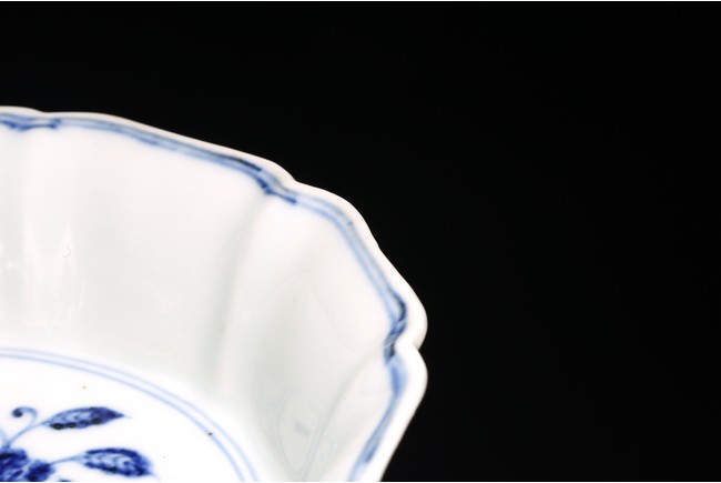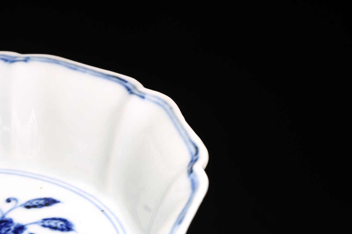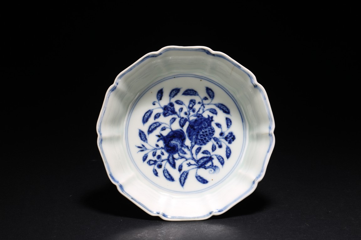 Ming Dynasty period. Of lobed mallow shape with flared rims and feet, the inside finely painted in cobalt blue with leafy pomegranates branches within double line border, the outside painted on each lobe with leafy floral branches enclosed within shaped cartouche. The cobalt blue underglaze with pronounced characteristics areas of 'heaping and piling'.