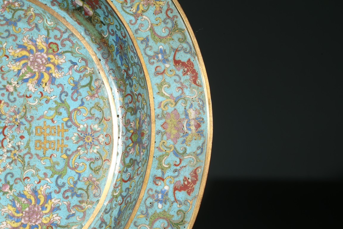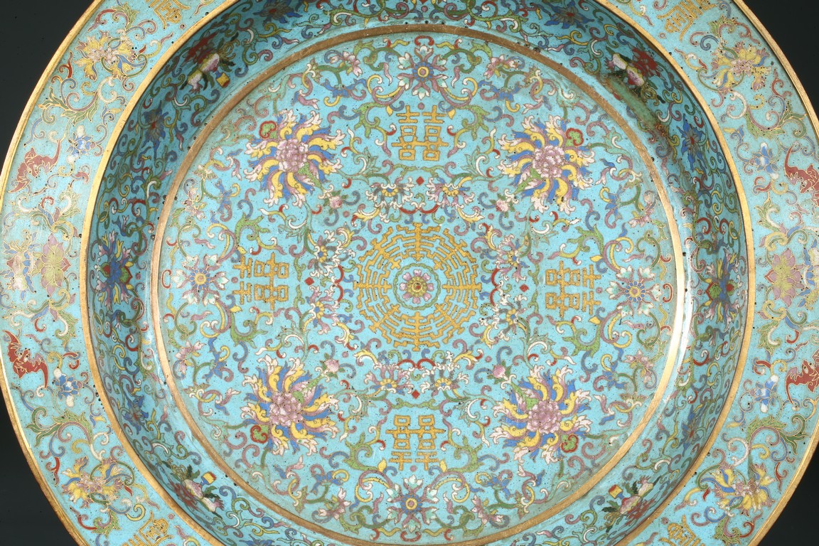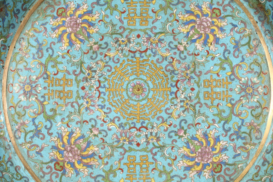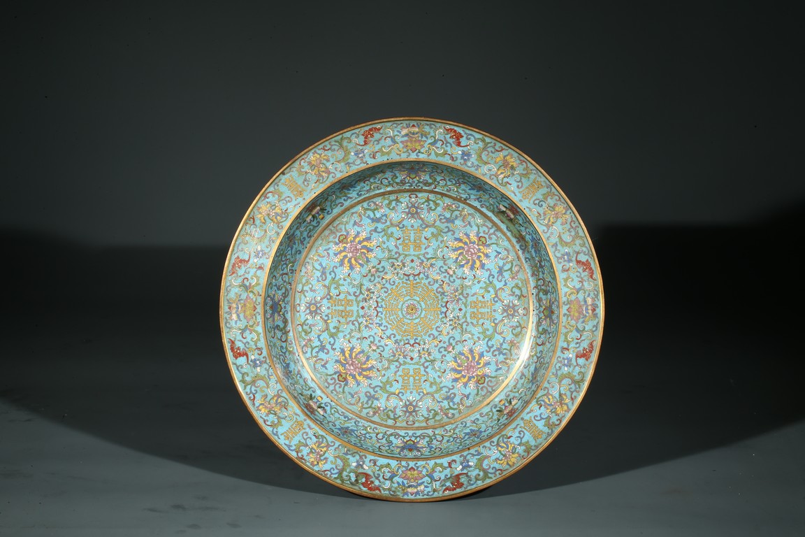 Qing Dynasty period. The interior decorated with alternating 'Xi' and lotus flower heads flanking central lotus motif, amongst peach and lotus heads to the sides of the wall. The everted rim is encircled with alternating 'Shou' and motifs of 'bats flanking peach' symbolizing longevity. The underside is impressed with a four character Qianlong mark reserved on dense hexagonal pattern.
