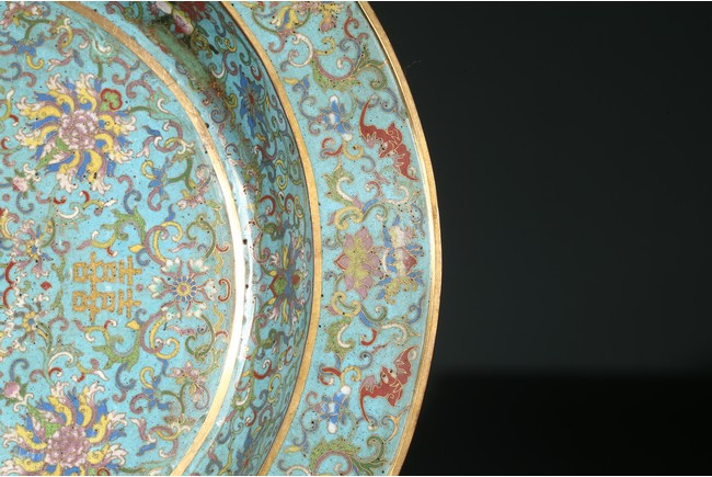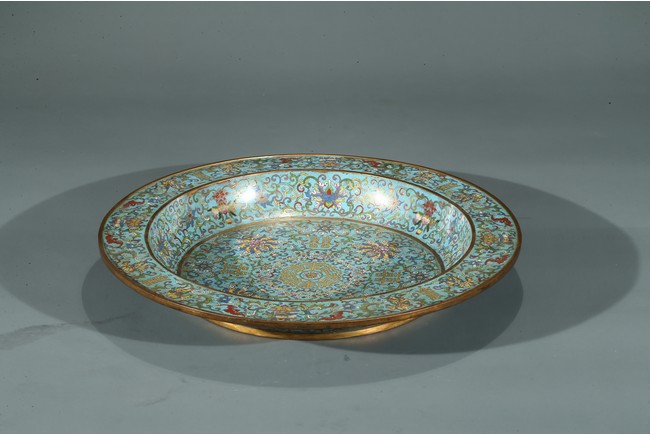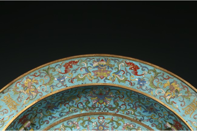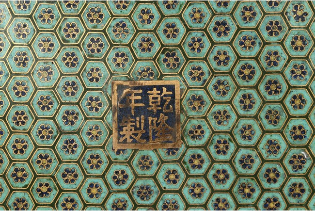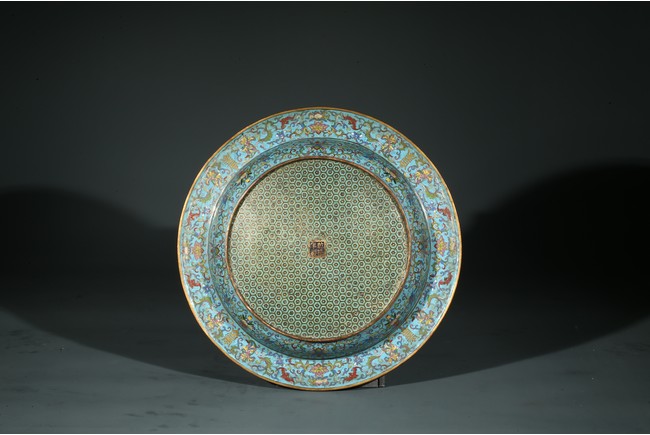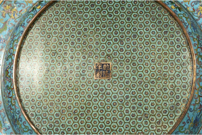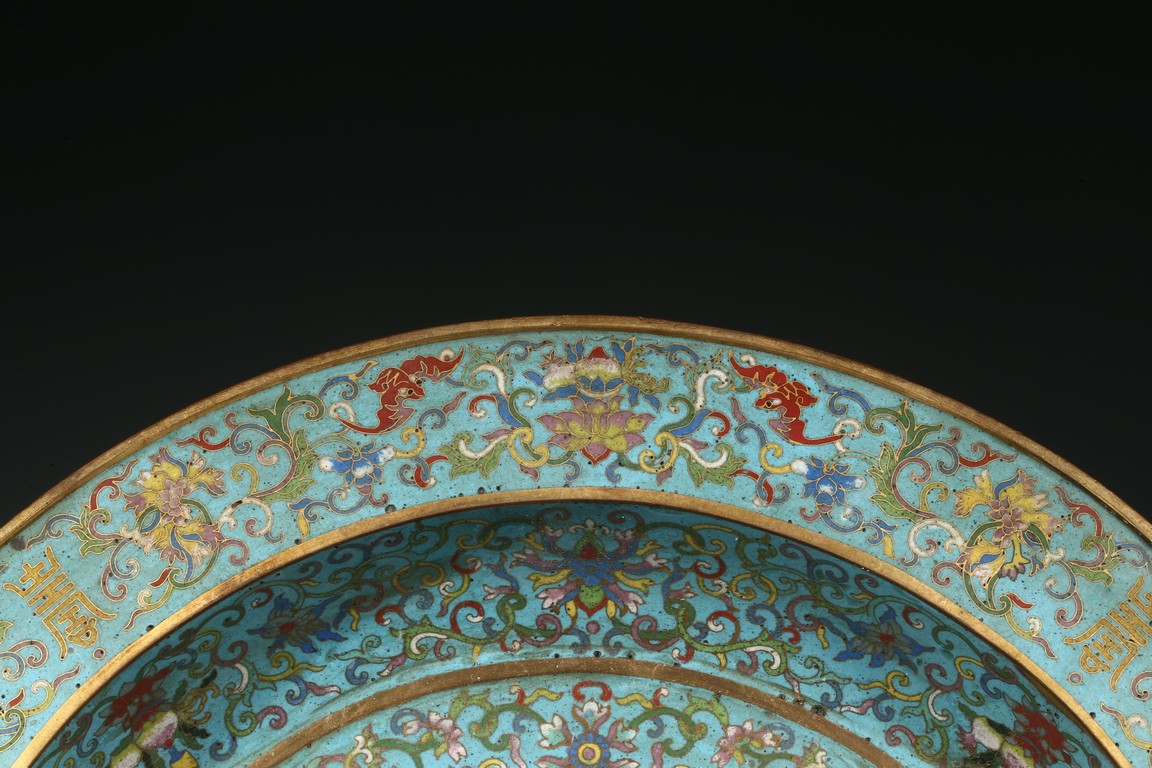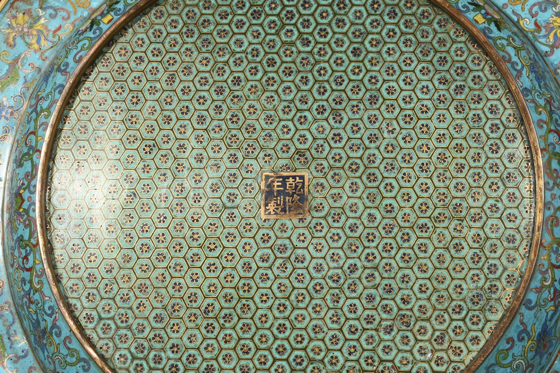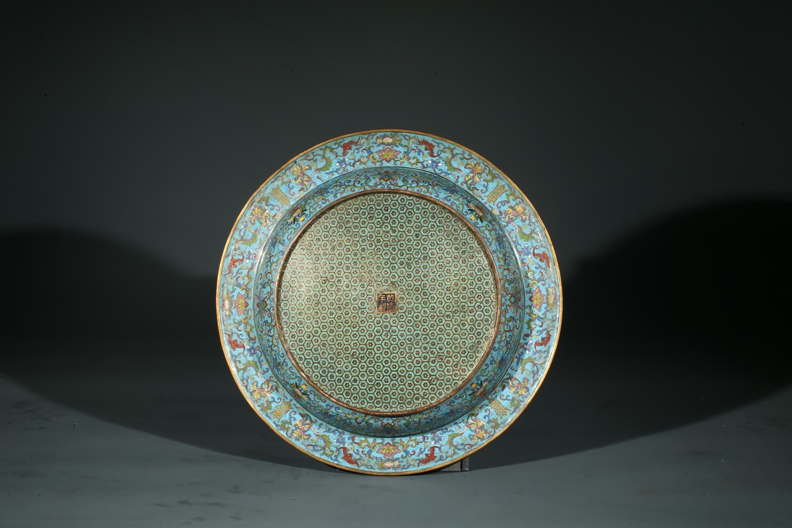 Qing Dynasty period. The interior decorated with alternating 'Xi' and lotus flower heads flanking central lotus motif, amongst peach and lotus heads to the sides of the wall. The everted rim is encircled with alternating 'Shou' and motifs of 'bats flanking peach' symbolizing longevity. The underside is impressed with a four character Qianlong mark reserved on dense hexagonal pattern.