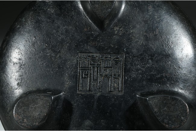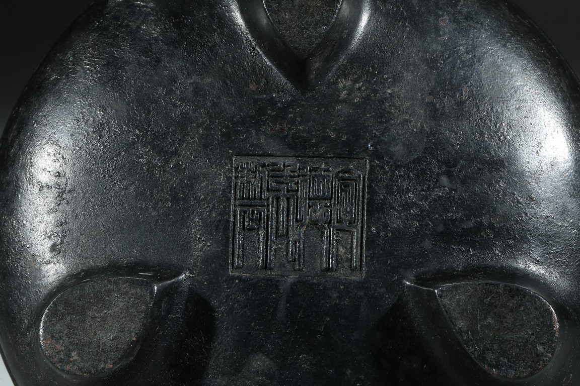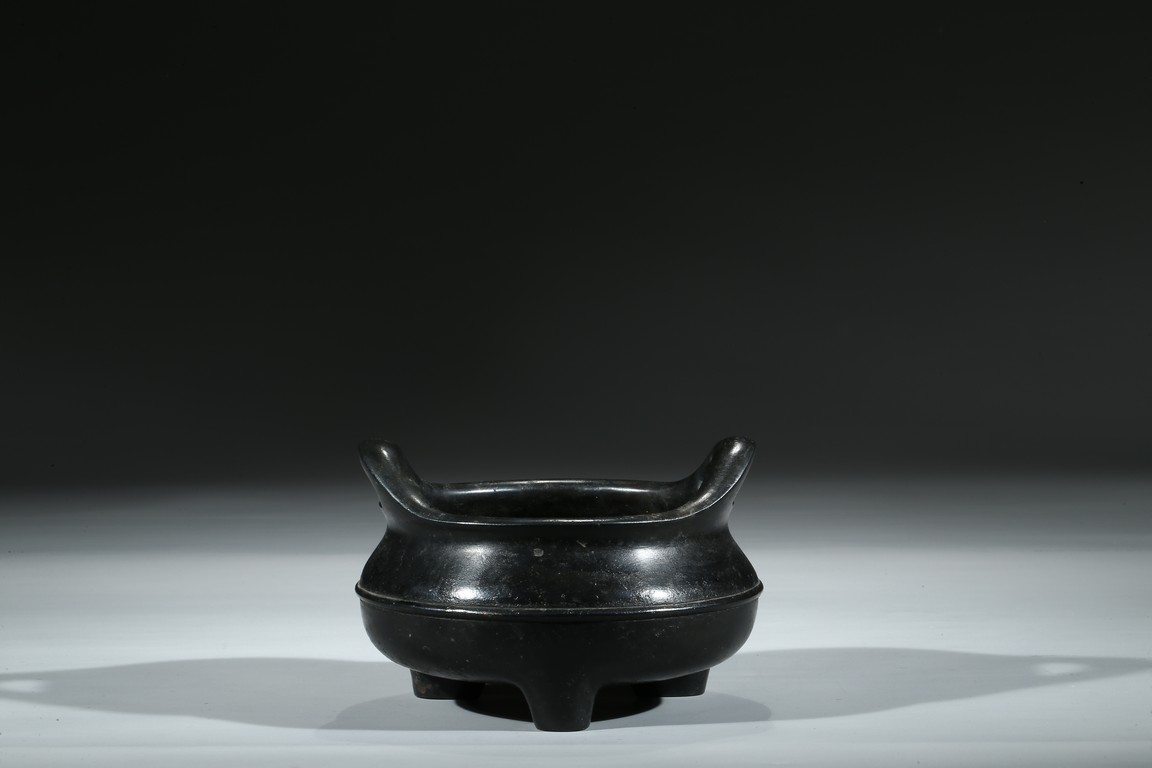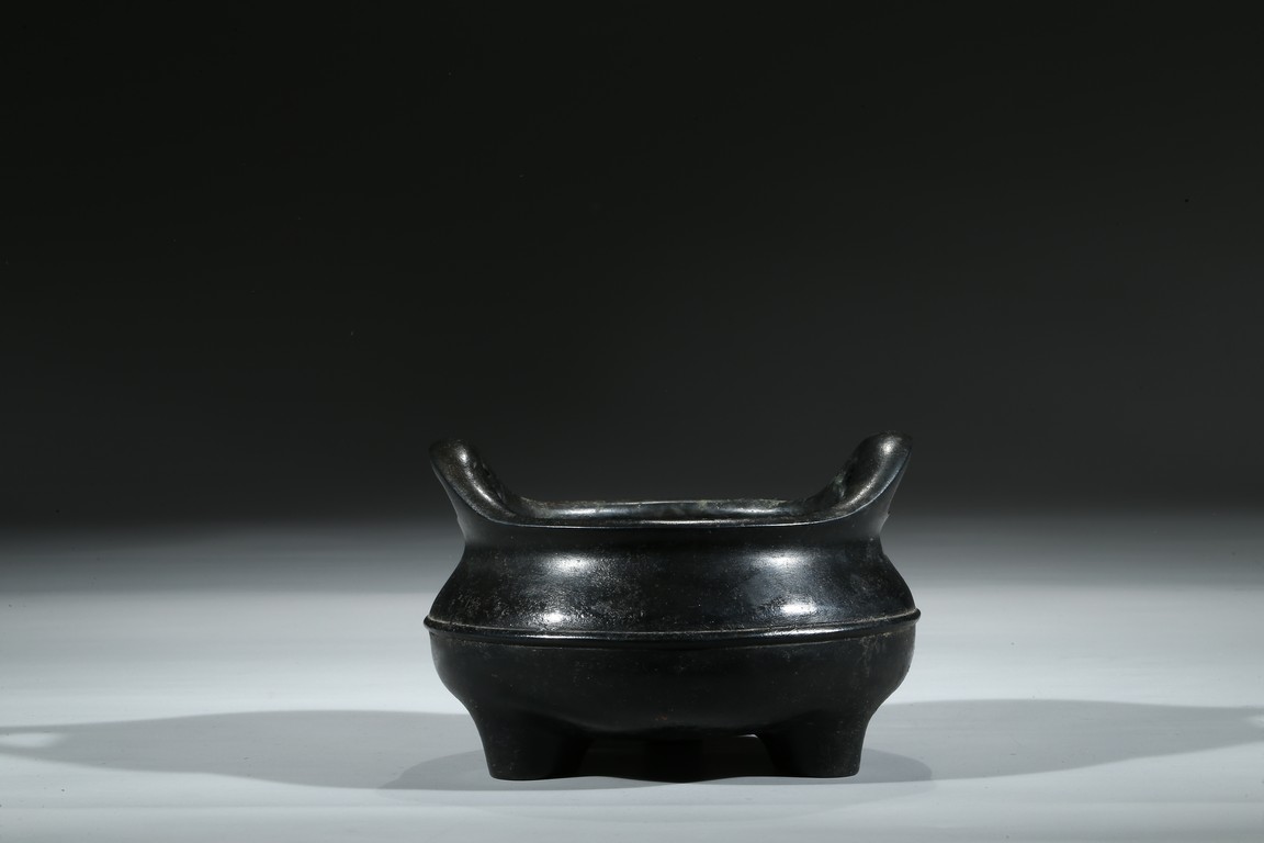 The compressed globular body supported on three short short legs, the mouthrim surmounted by a pair of arched handles, the base cast with a recessed rectangular panel enclosing an inscription reading Xuande Nianzhi, the patinated bronze surface of dark brown color. Ming Dynasty period.