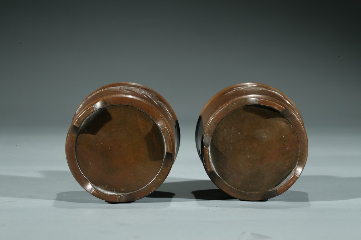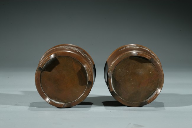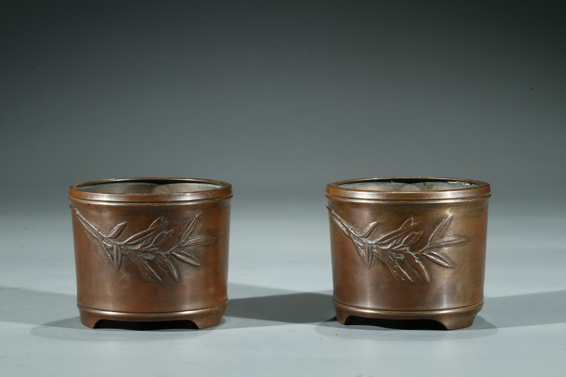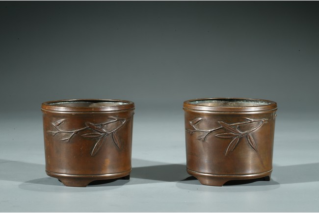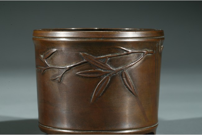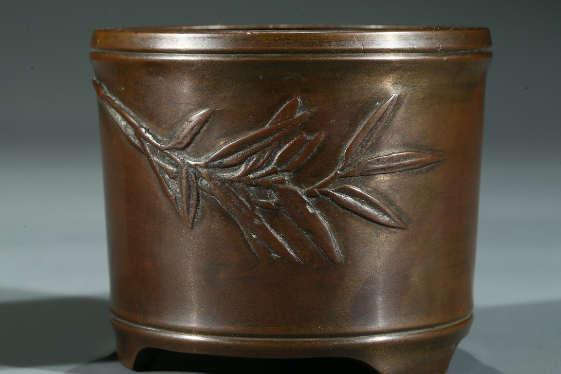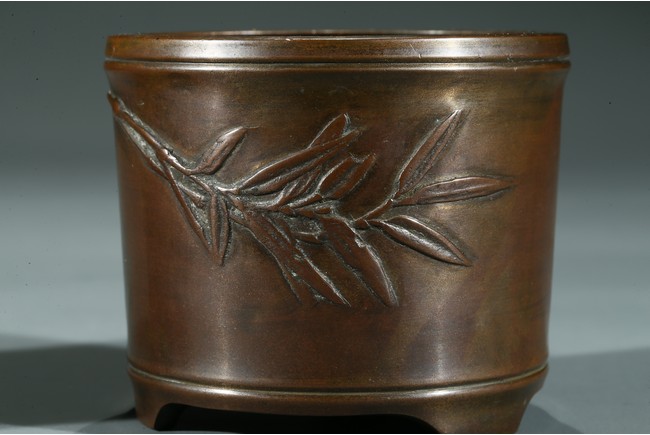 Of cylindrical form, the body cast in relief with bamboo decorations, all supported on three short feet.