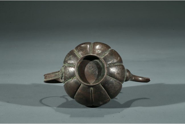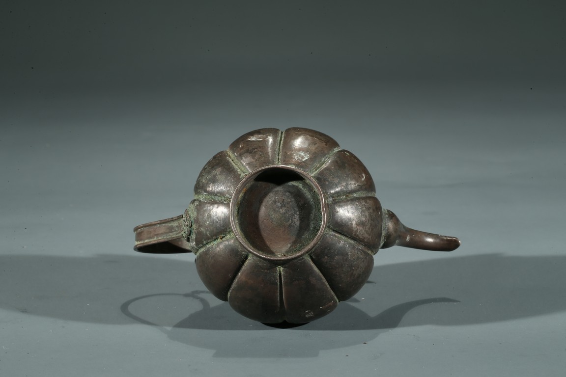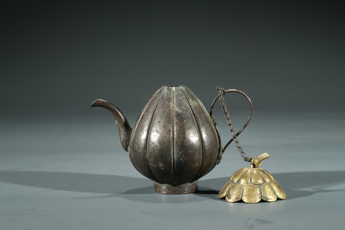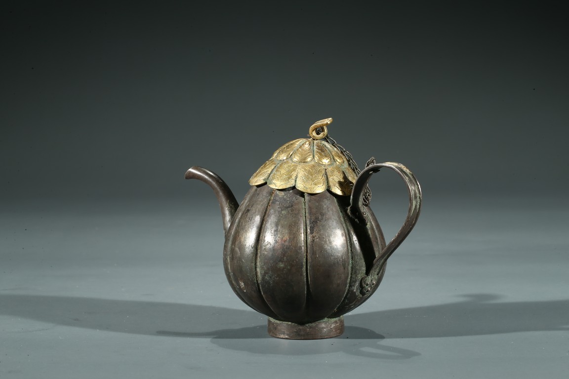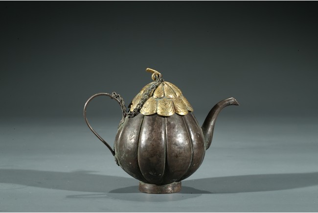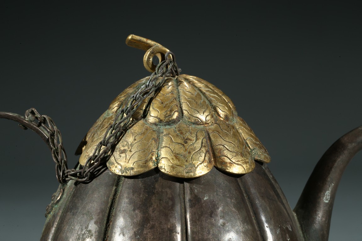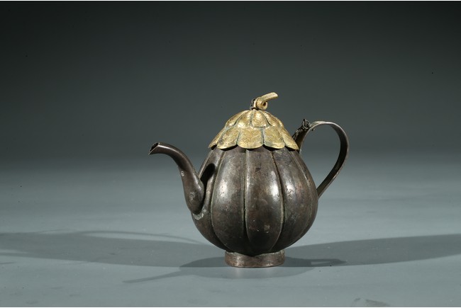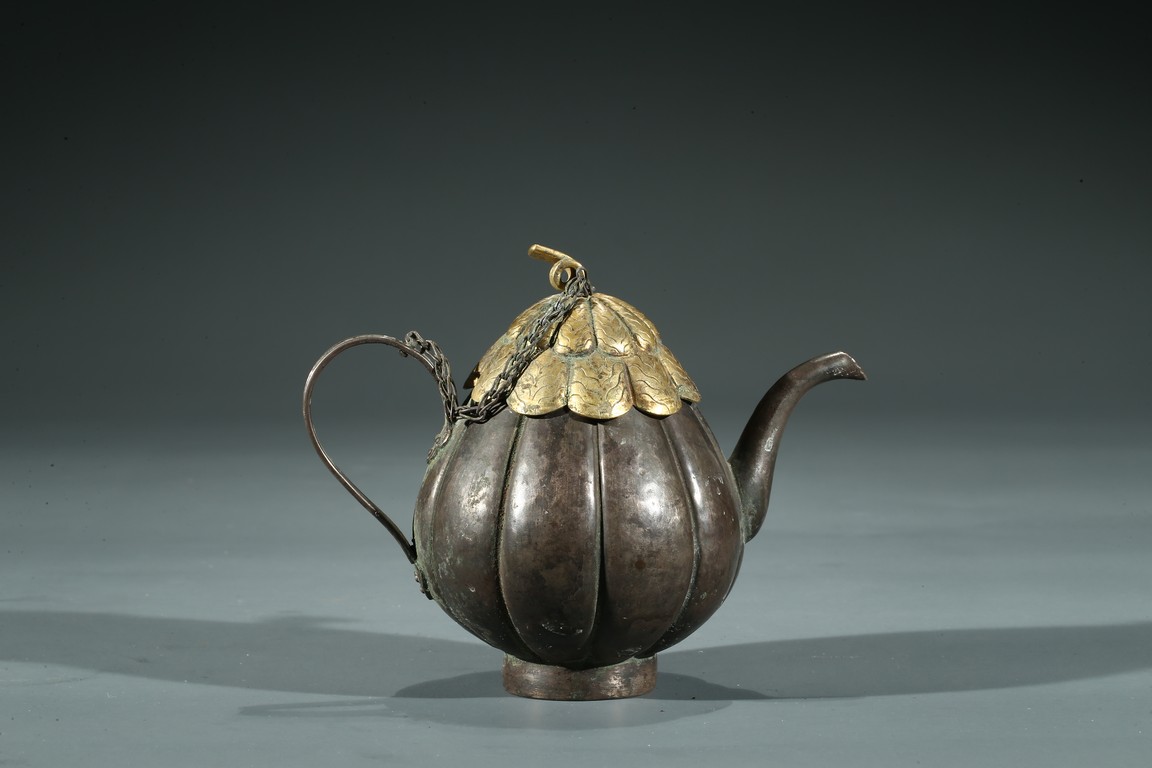 Cast in the form of a lobed melon, the body flanked by curved spout and c-shaped handle, fitted with gilt silver cover of similar style surmounted with twisted stem finial.