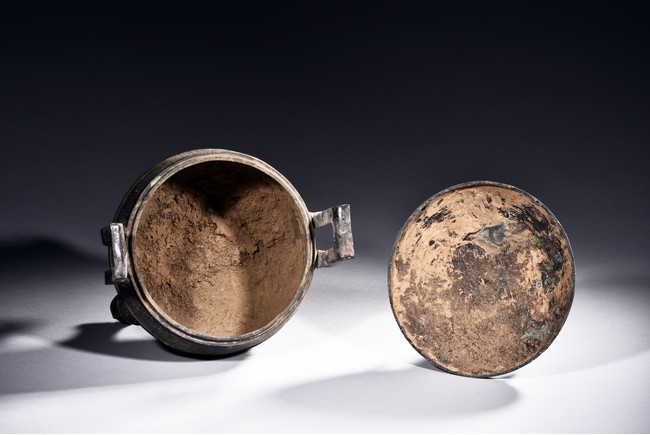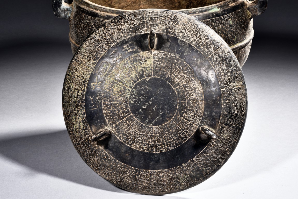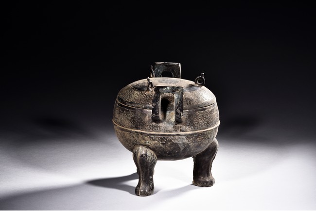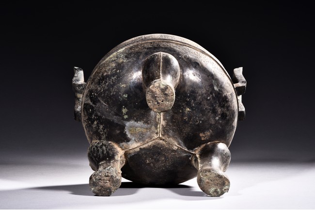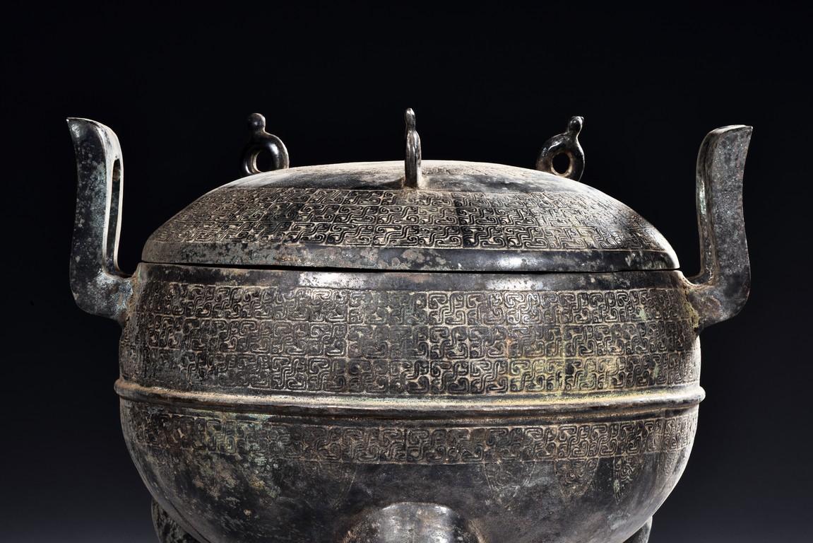 Song Dynasty period. Standing on three tall curved legs, the domed cover and body decorated with repeated leiwen , flanked by projecting arched handles below the three small rings.