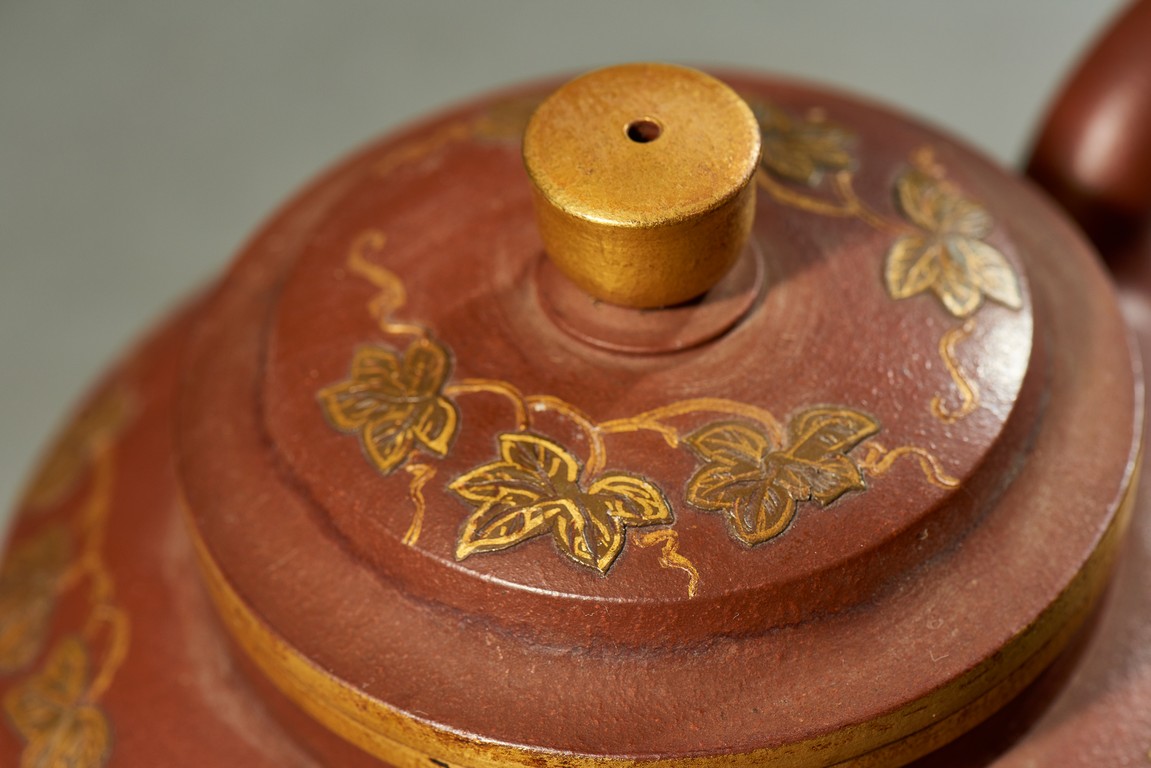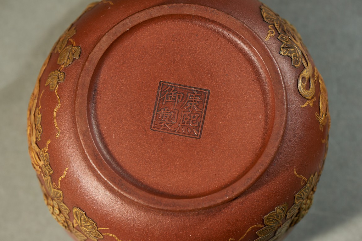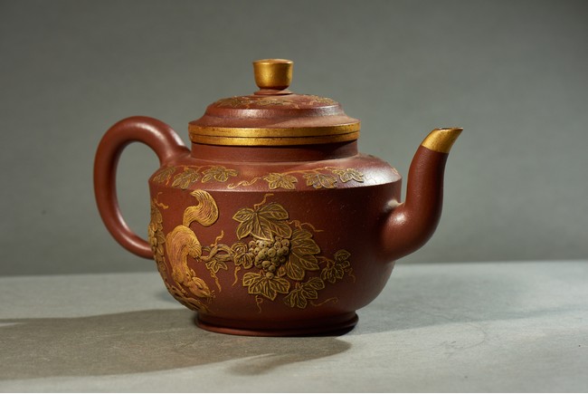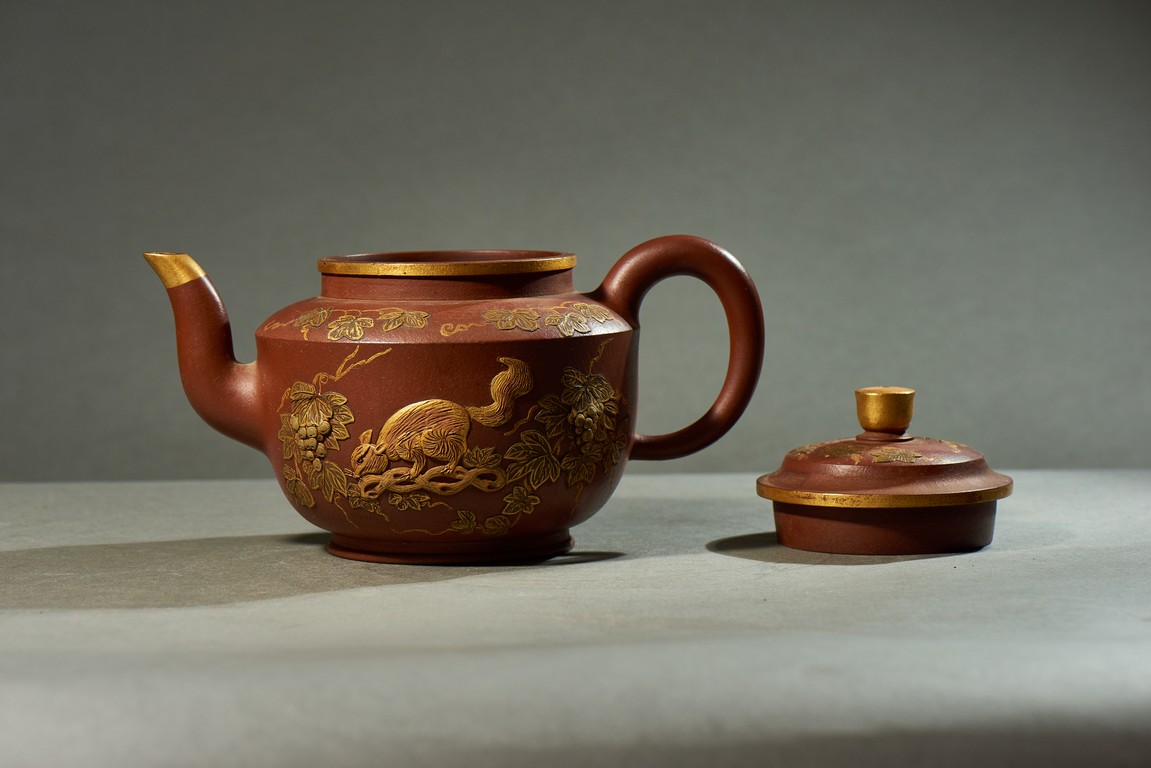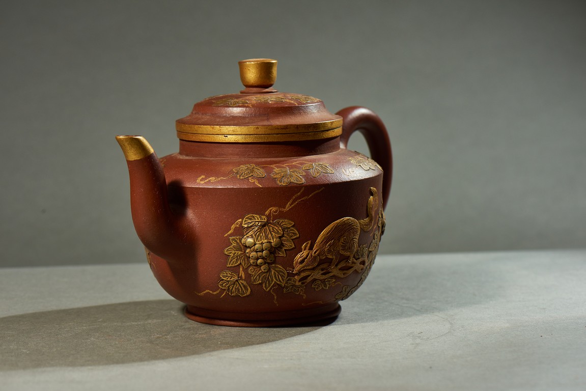 The body moulded with squirrels clambering on grape vines in relief, flanked by arched handle and curved spout, the cover decorated with similar grape vine pattern, finial gilt-painted, base with apocryphal mark.