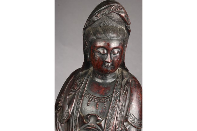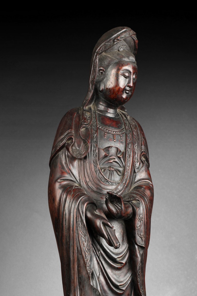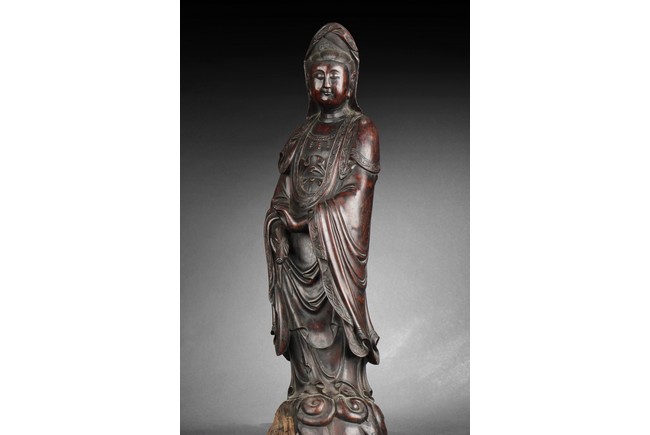 Standing gracefully on the ocean wave, her right hand with a vase pouring downwards, her left hand assisting, looking downwards in serene expression, the Guanyin dressed in in loose and long robe, wearing a long cowl and ornaments. 18th century.